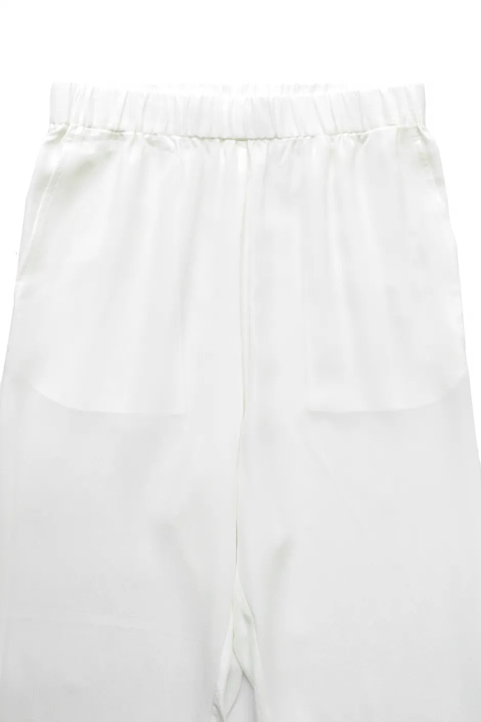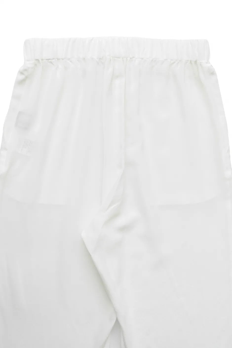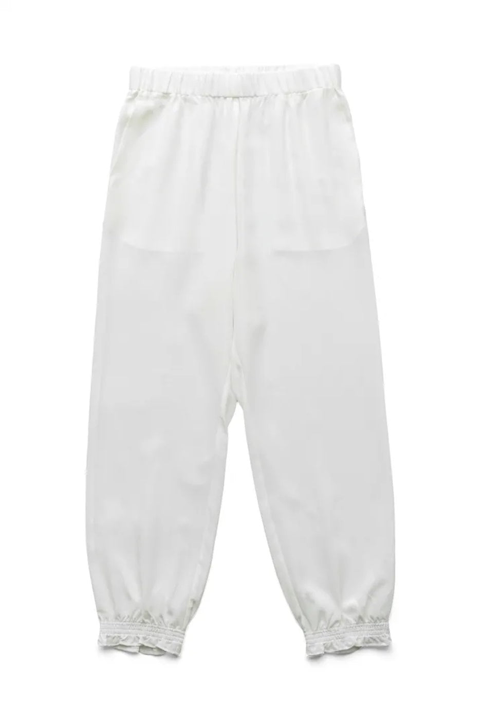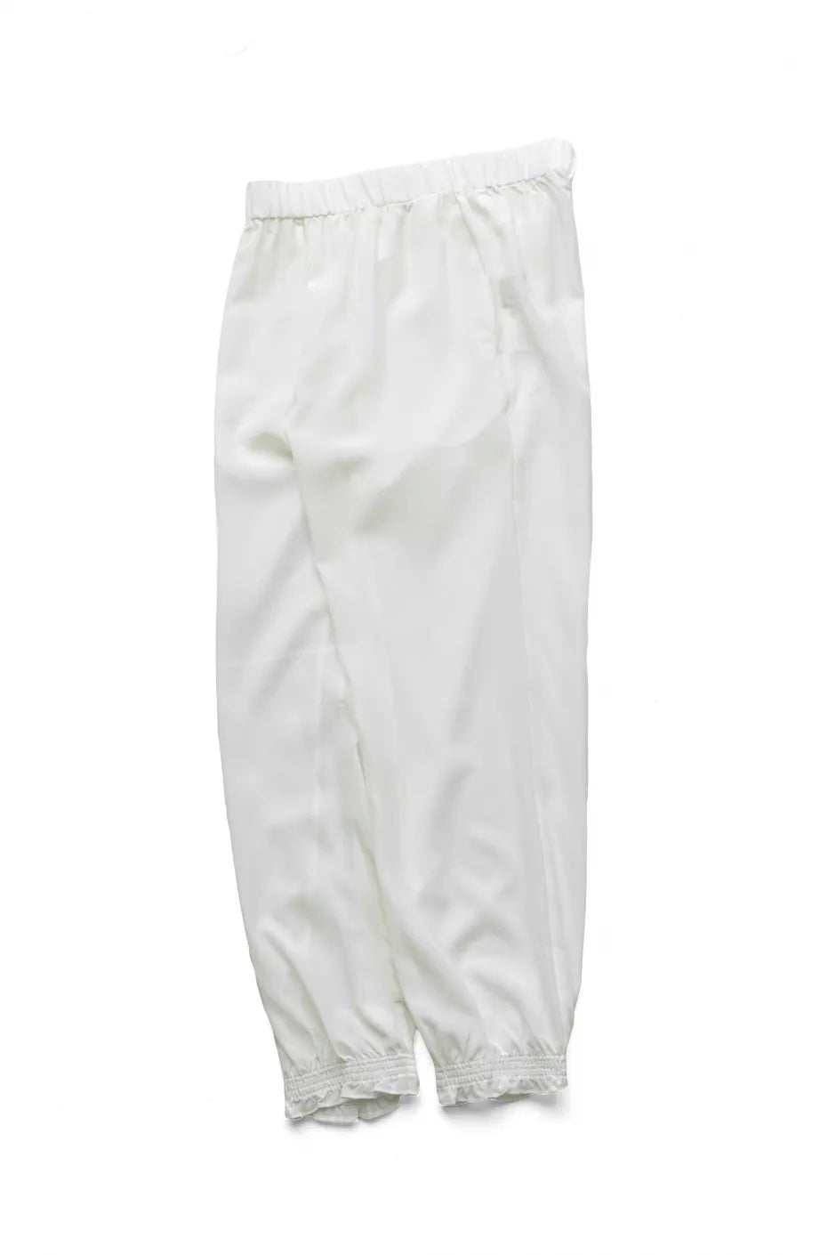 裾のリブデザインが特徴的なhumoresque定番のシャーリングパンツ。 柔らかな光沢と豊かなドレープを持つ平織りシルク生地は吸湿、保温に優れています。