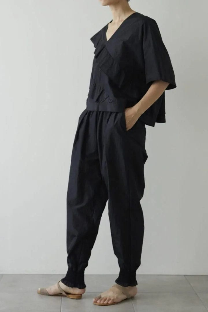 sea grassと一緒に海を漂うようなブラウス。 2019年から不定期でリピートしている細番手を高密度に織り上げたシャリ感とクリアな発色が美しいシルク生地でお作りします。 のんびりと潮の流れに身をまかせる海藻たちのような大きなフリルが身頃全体を螺旋状に囲います。肘丈の袖やVネックがすっきりとしているので、大胆なフリルも甘い印象にならず華やかな大人の雰囲気となります。コンパクトな丈がどんなボトムスともバランスよく合わせることができ、同生地のsea grass skirtやshirring pantsとのセットアップ、異素材でお作りする定番のwide pantsとの組み合わせもおすすめです。 色は、あたたかな海のサンゴのようなcoral、透きとおる静かな水面のようなblue gray、月明かりで輝く波のようなblackの3色です。 速乾性に優れたこちらの生地は日常着としてはもちろん、旅先のお供としてもおすすめです。細やかなシワは生地の表情としてあえて残し、お楽しみください。