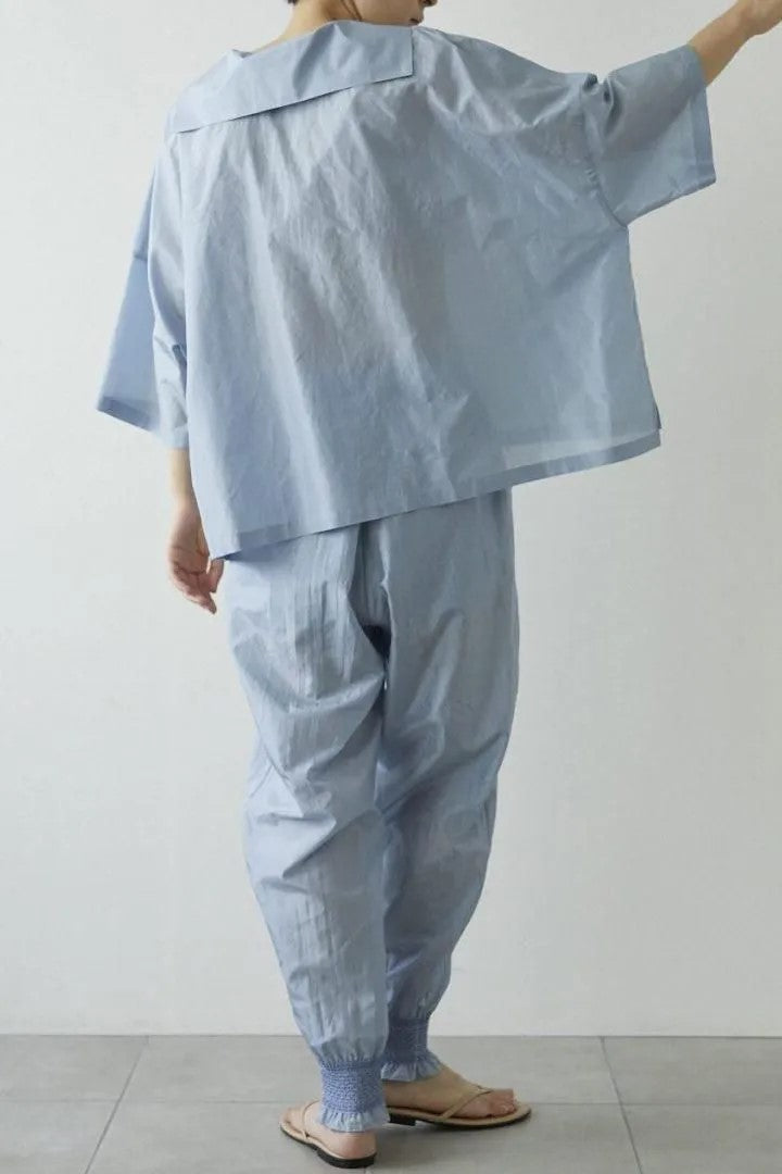 潮風で軽やかに揺れるsailor collar blouse。 2019年から不定期でリピートしている細番手を高密度に織り上げたシャリ感とクリアな発色が美しいシルク生地でお作りします。 小ぶりのセーラーカラーとすっきりとしたVネックが大人の雰囲気をもつブラウスです。ゆったりとした身幅や肘下丈まで続くドロップショルダーに安心感があり、リラックスした着心地です。後ろ見頃の丈を長めにとることで生まれた裾の段差や裾の両サイドに小さく設けたスリットがシルエットに動きを作り、ブラウスが潮風でなびく様子を描きます。 前ボタンを外して羽織としてお召しいただくと、Vネックの斜線がセーラーカラーから延びる縦のラインへと変わり、より大人の表情をお楽しみいただけます。 同生地でお作りするsea grass skirtやshirring pants、plage pantsとのセットアップもおすすめです。 色は、あたたかな海のサンゴのようなcoral、透きとおる静かな水面のようなblue gray、月明かりで輝く波のようなblackの3色です。 速乾性に優れたこちらの生地は日常着としてはもちろん、旅先のお供としてもおすすめです。細やかなシワは生地の表情としてあえて残し、お楽しみください。