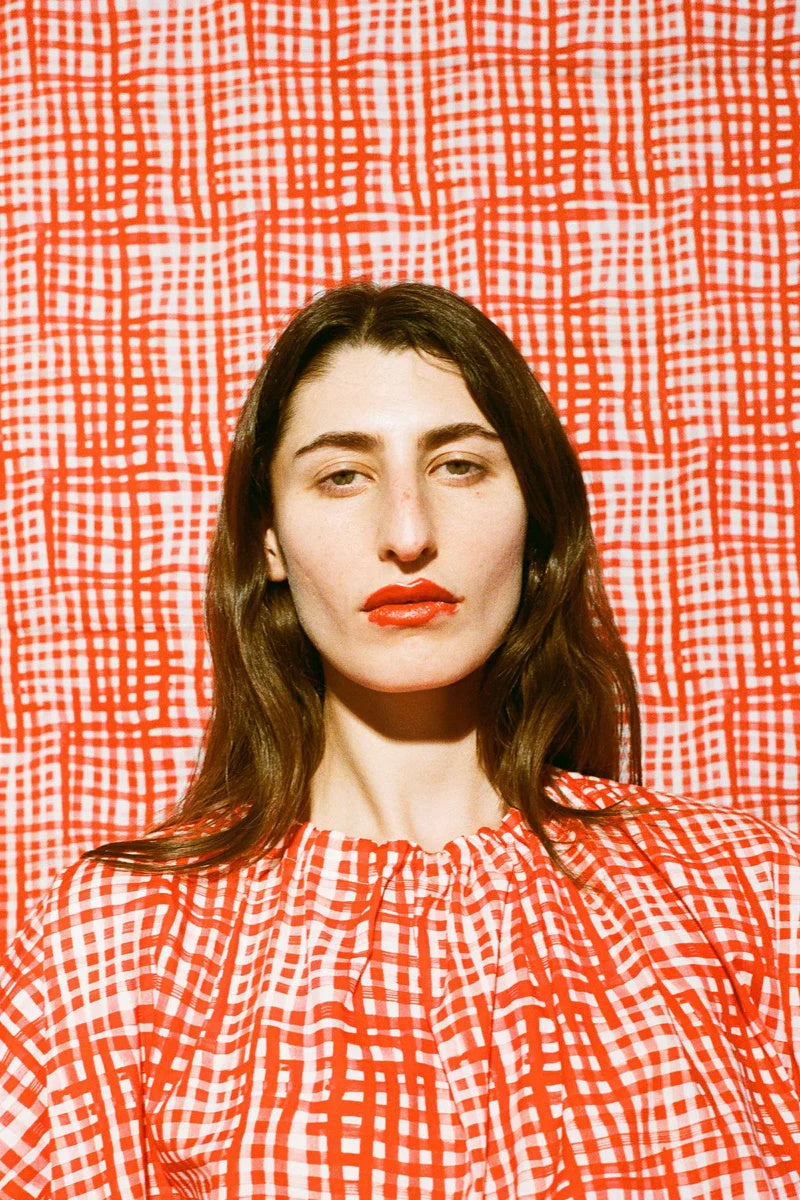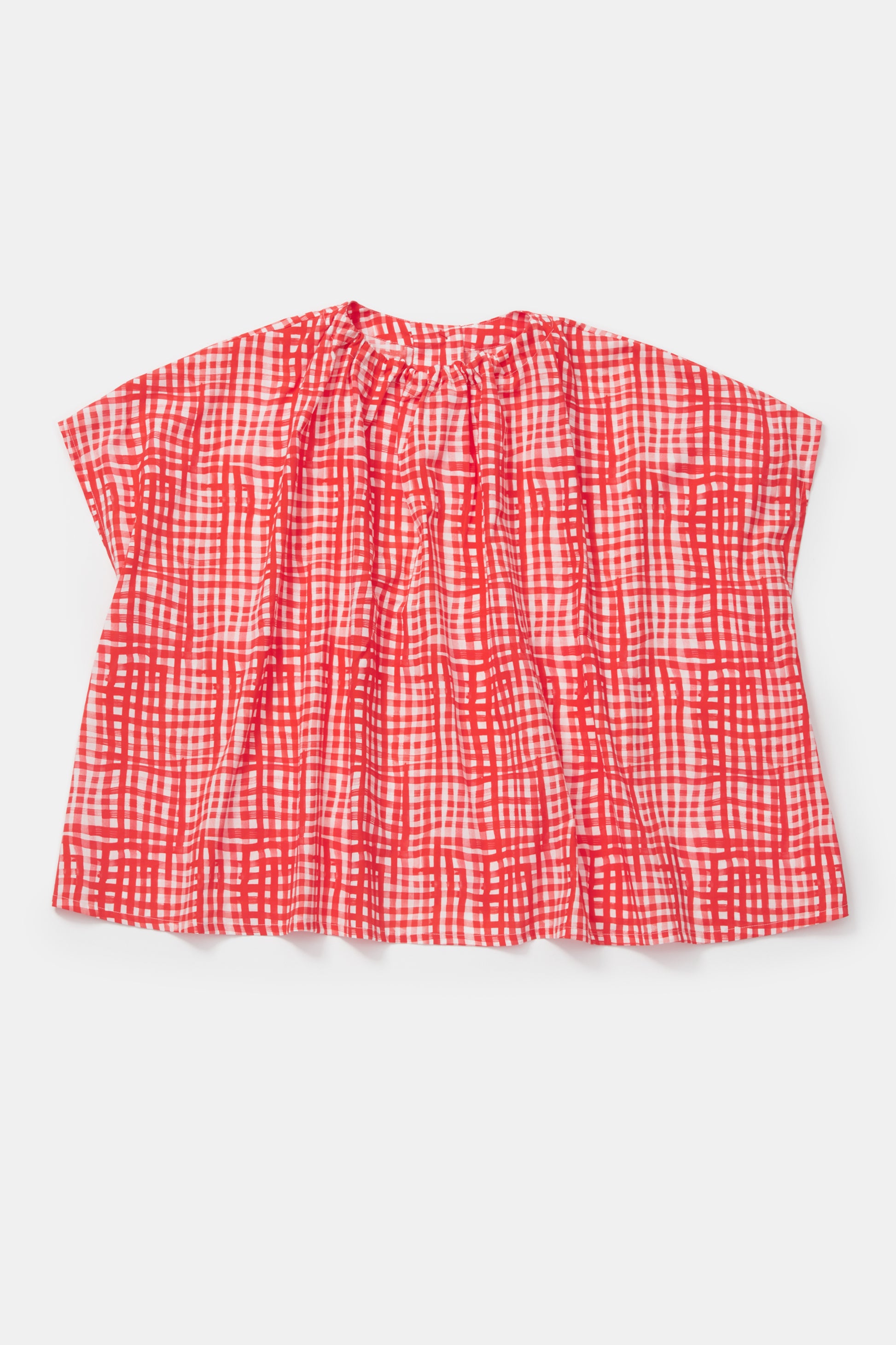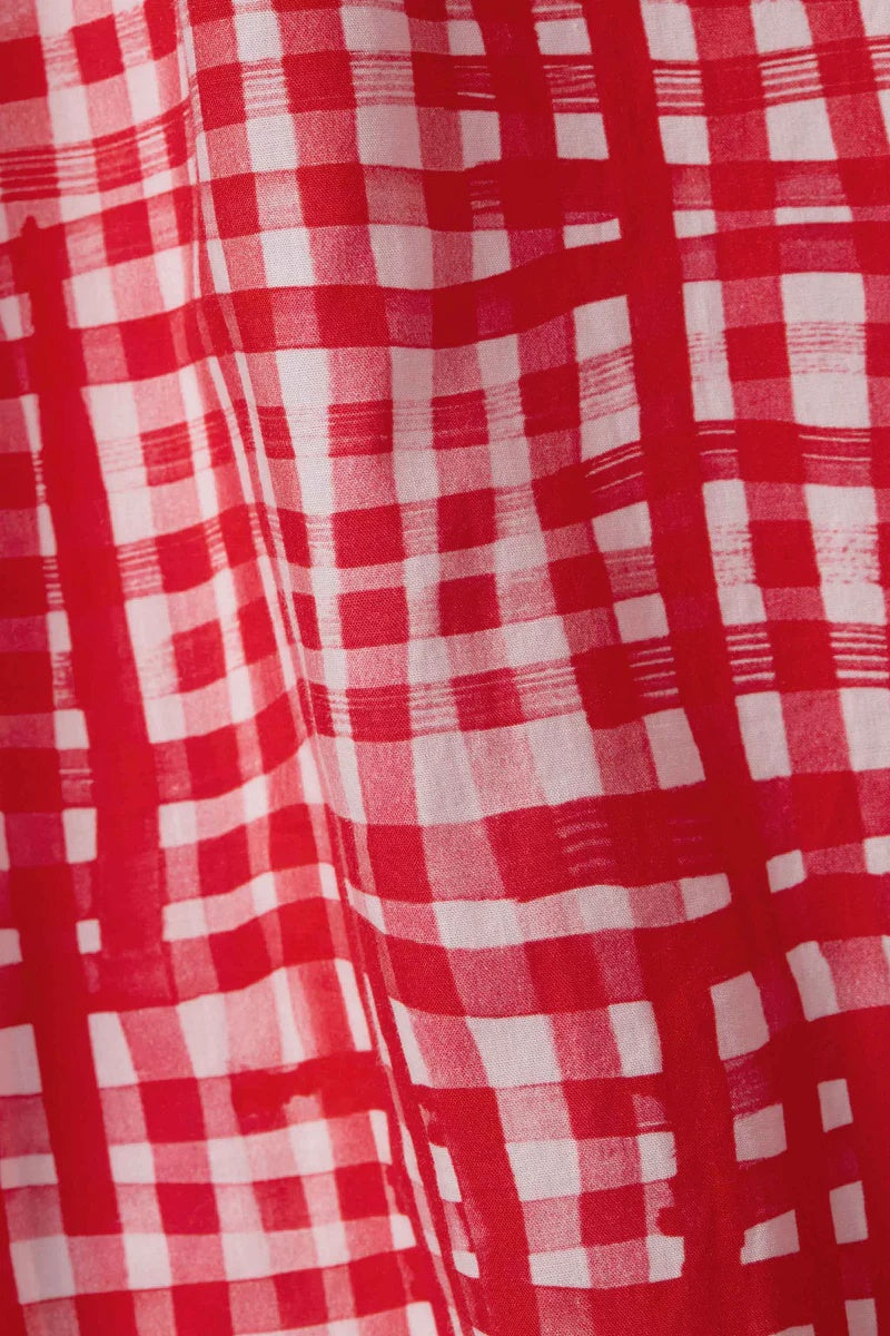 このノースリーブのトップスは、軽量の綿の芝生からカットされ、絵画的なチェックがプリントされています。このオリジナルのToogoodアートワークは、クラシックな英国のカフェで見られる赤いギンガムカーテンに触発されています。