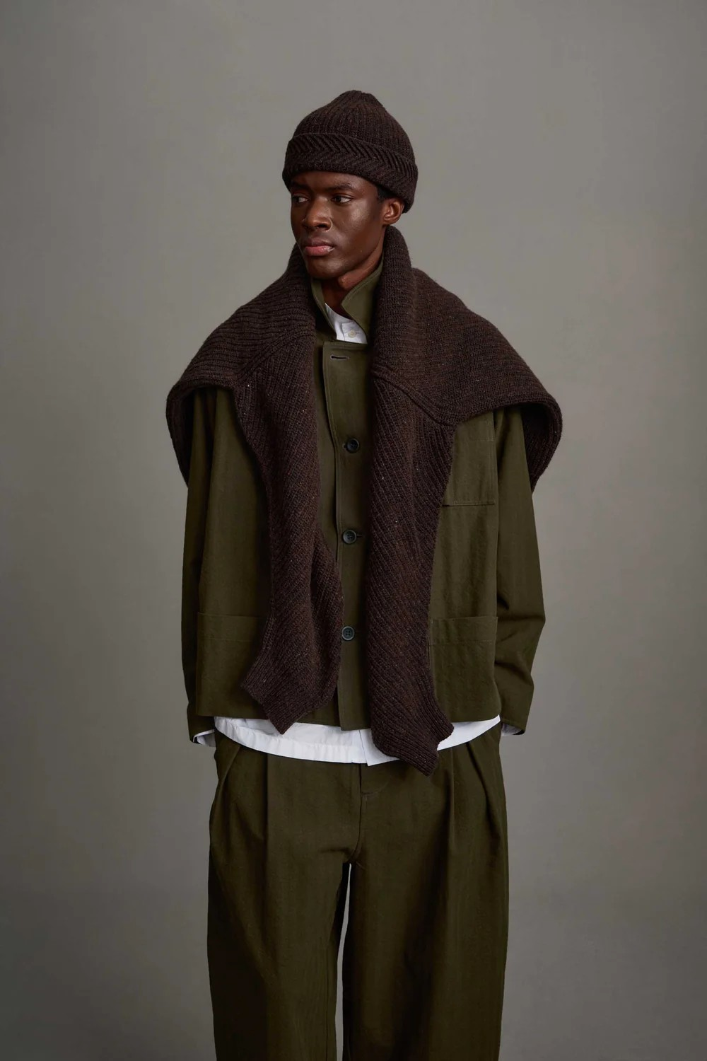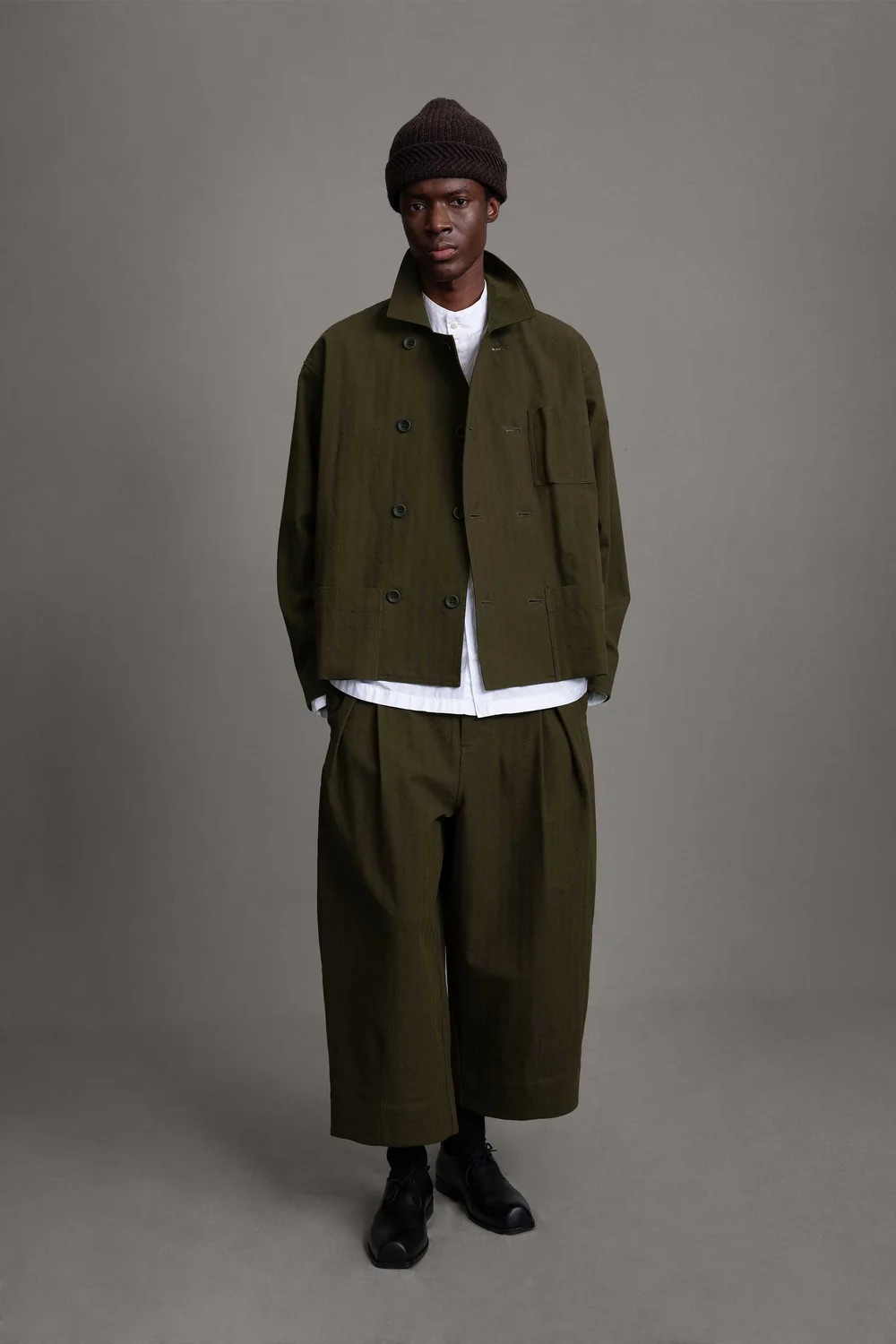 ザ・クックは遊び心あふれるダブルブレストジャケット。大胆な襟、ドロップショルダー、3つのフロントポケットが特徴です。左胸ポケットは、料理人の木製スプーンやお好みの職人道具を収められる形に少し突き出しています。丈はややショート丈。