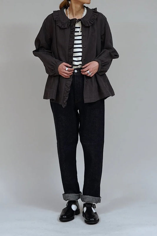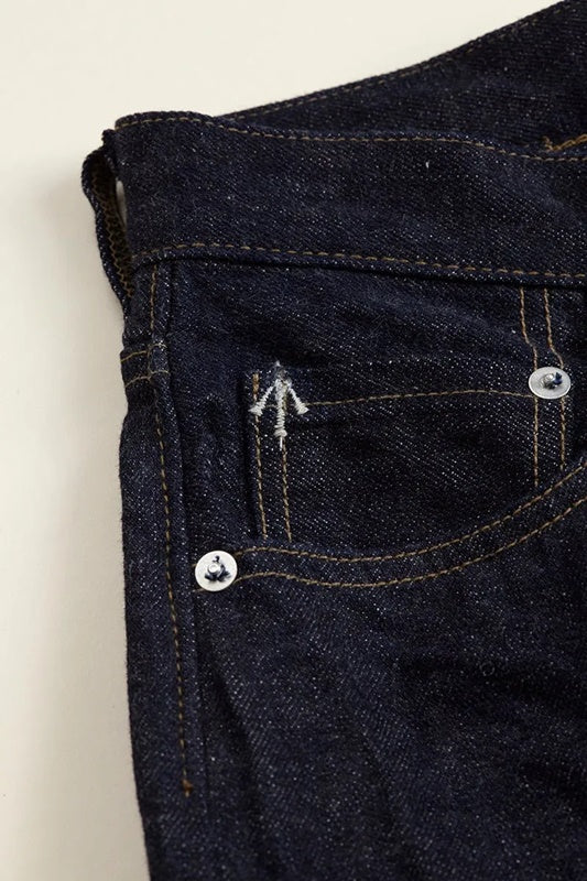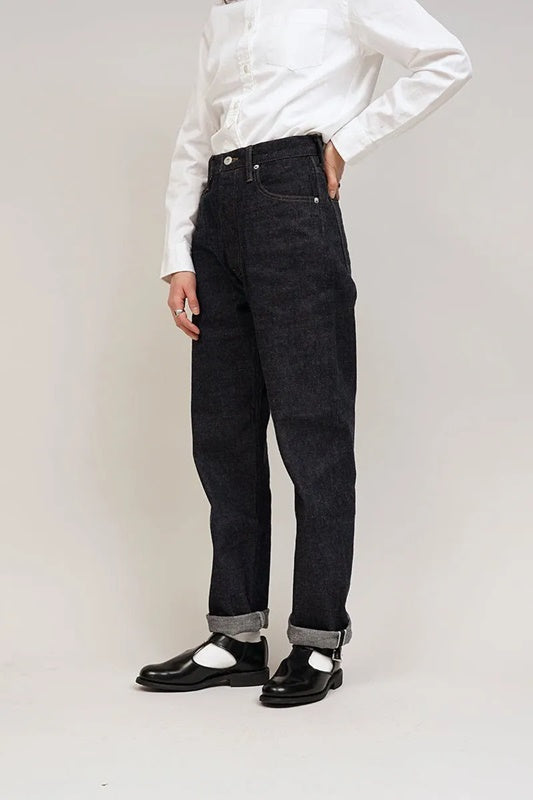 ジーンズは作られた年代や国、メーカー、そして用途によってその表情を大きく変えます。本製品は、女性が履くことをコンセプトにデザインされていますので、股上が深く、ワタリはゆったりと余裕がありつつも無駄なく裾にかけて緩やかにテーパードがかかりどこかすっきりとしたシルエットに仕上げました。1930年代のデニムパンツからインスピレーションを得てデザインされたハイウエストのデニムパンツ。前右ポケットに配されたコインポケットにはリベットに加えて、ブロードアローの閂( かんぬき) 止めの刺繍が施されています。1929 年の世界恐慌後のアメリカ。恐慌下で経営が悪化した西部の牧場から生まれたデュード・ランチ(Dude Ranch)が、東部の裕福な人々の間で流行しました。そこで働くカウガールに向けて作られたのが初めての女性のためのジーンズです。