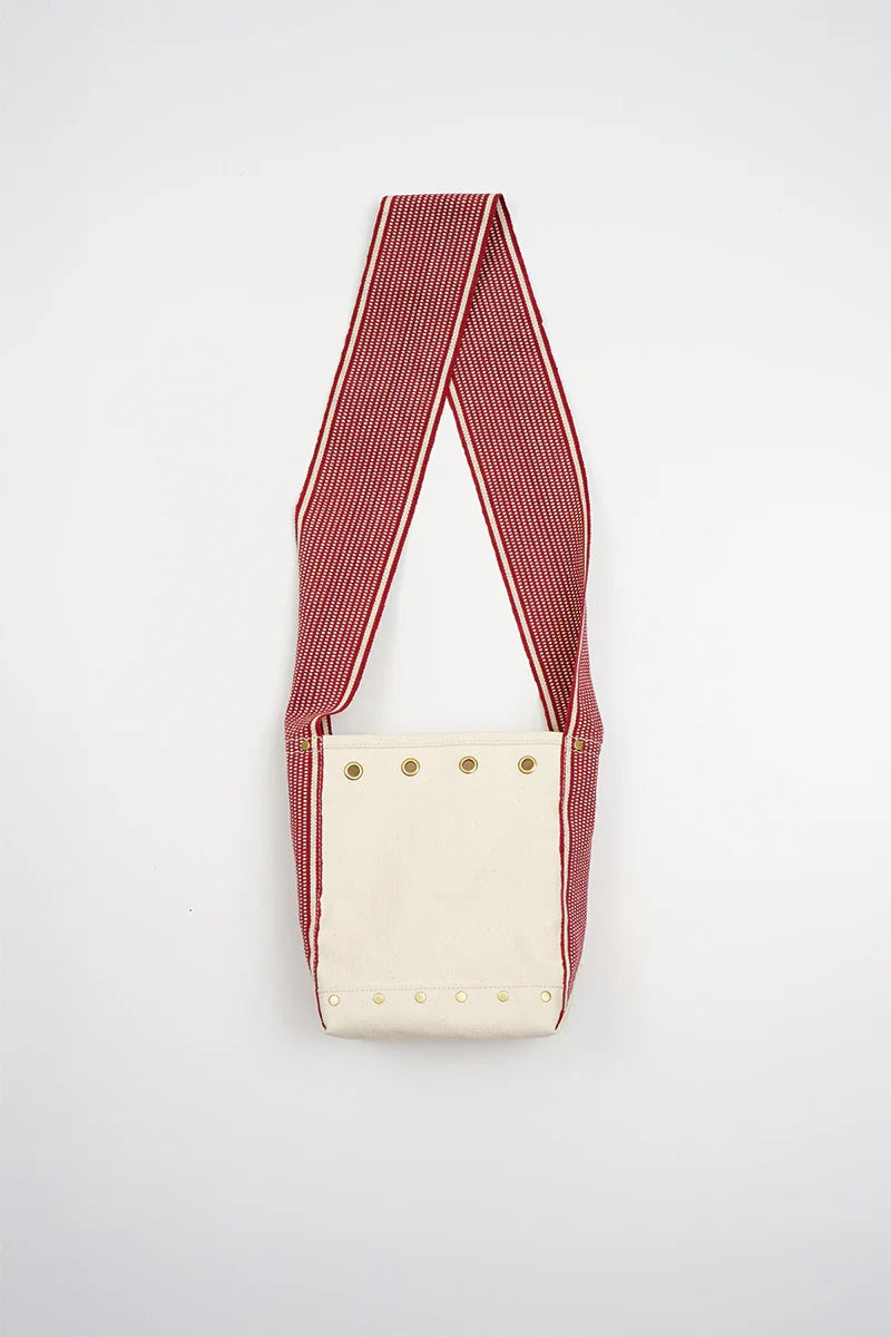 パリのクリニャンクールで見つけたヴィンテージのトートバッグを参考にデザインしました。生成色の帆布のボディに、デッドストックのエスパドリーユ用のテープを肩紐につけました。ミニは斜めがけや肩掛けにできるポシェットサイズです。容量は、携帯や手帳、水筒など身の回りのものが入るサイズ感。テープが幅広なので安定感があり、着こなしの差し色としても活躍します。