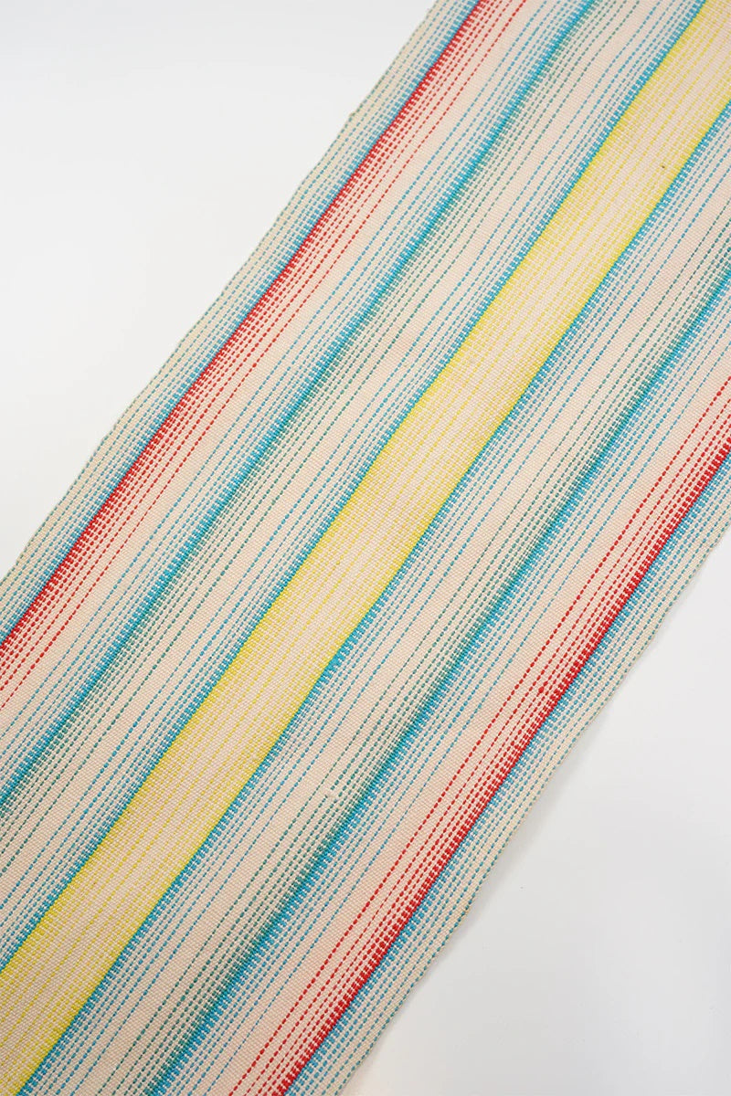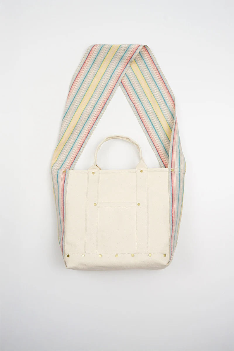 パリのクリニャンクールで見つけたヴィンテージのトートバッグを参考にデザインしました。生成色の帆布のボディに、デッドストックのエスパドリーユ用のテープを肩紐につけました。トートバッグはA3サイズの書類や13インチのノートPCが入るサイズです。手持ちをするときはテープをバッグの中にしまって、肩掛けやショルダーとして使うときにはテープが幅広なので安定感があり、鮮やかな色彩が着こなしのアクセントになります。
