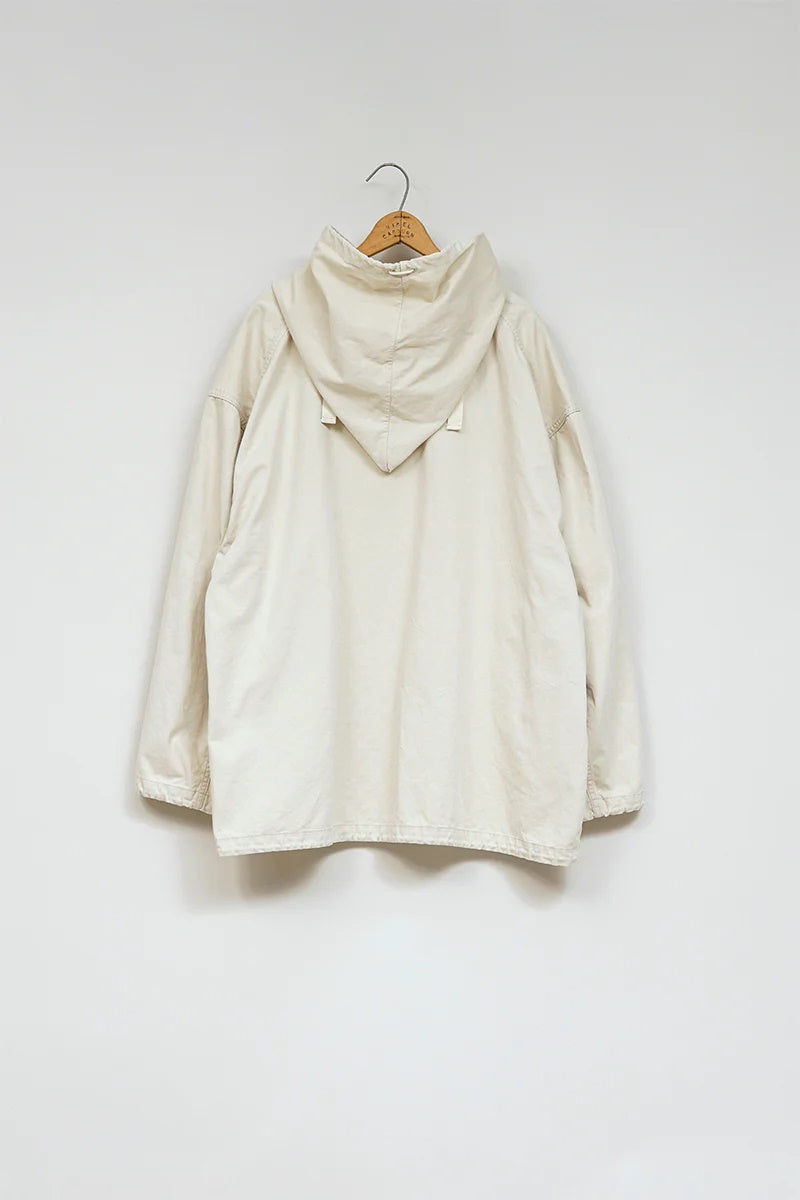 デザインは所謂ガンナースモック。艦砲、あるいは陸上砲台において、自動装填装置を含めた全自動射撃管制システムの発展前には砲の操作には人力が不可欠でした。炸薬によるガスや熱風を避けるため頭部を完全に覆うフードと特に喉元をしっかりカバーするよう考慮されています。完全に体を覆うと共に、なるだけ衣服のひっかかりを排除する目的からスモックタイプになっている事も大きな特徴です。一方で、フィールドジャケット等と比較するとガンナースモックの全体は非常にシンプルです。頑丈な前者と比べれば、やや華奢な感じすらします。理由はガンナーの居場所が砲台の中であるから。 そのため風雨や気温差、瓦礫やジャングルなどの環境に対向するディテールは必要ありません。その代わり砲台内ならではの過酷な状況にのみ特化して対応するよう設計されています。ファブリックはピグメントのピースダイ。顔料の反染めです。顔料染めならではの経年変化を楽しむ事ができます。