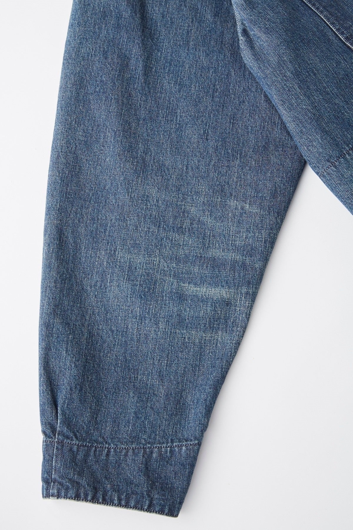 褪色や経年変化にデザインフォーカスを当てた10.7オンスのインディゴデニム。経糸の染めはピュアインディゴのロープ染色で、深みのある日本ならではのインディゴブルーを使用。経糸の打込本数も多めで、組織も2/1右綾で通常の3/1右綾より綾目が立たない設計に。フラットな表情ですが、縦糸のムラ糸、横糸のナチュラルなムラ感が合わさり絶妙な深みと表情感を醸し出す。