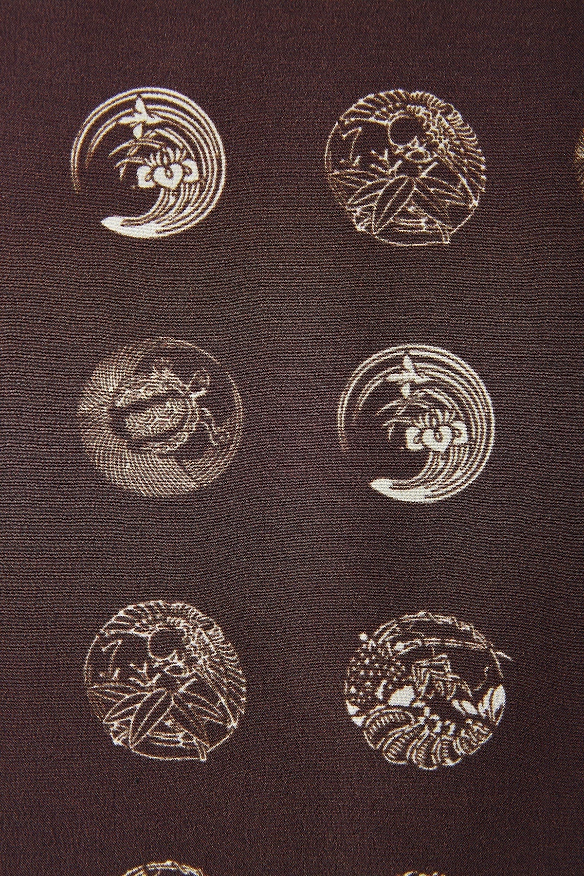 シグネチャーピースのフリンジ付きストール。コートやジャケットの中に合わせる事によりエレガントな雰囲気を作る事ができる。表裏でカラーリングとテキスタイルが違う表情を持っているので、気分によって使い分ける事が出来る。ノスタルジーなテキスタイルに、フリンジの繊細な表情がカジュアルなコーディネートを、ジェンツな佇まいに昇華してくれるでしょう。経糸と緯糸の撚りの強弱により表面に繊細なシボ感が拡散されており、シルク独特のしなやかさとマイルドな光沢が特徴です。エレガントなドレープ性により上質感を表現しています。