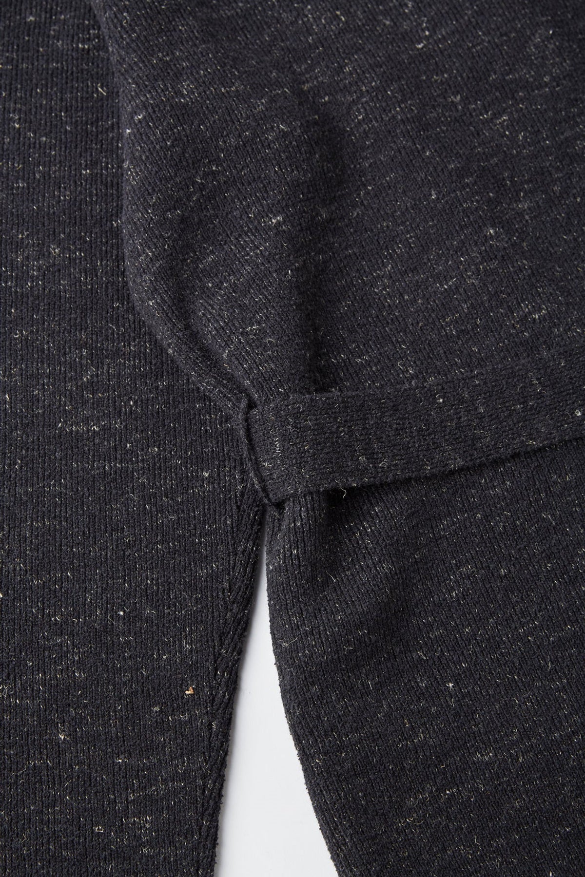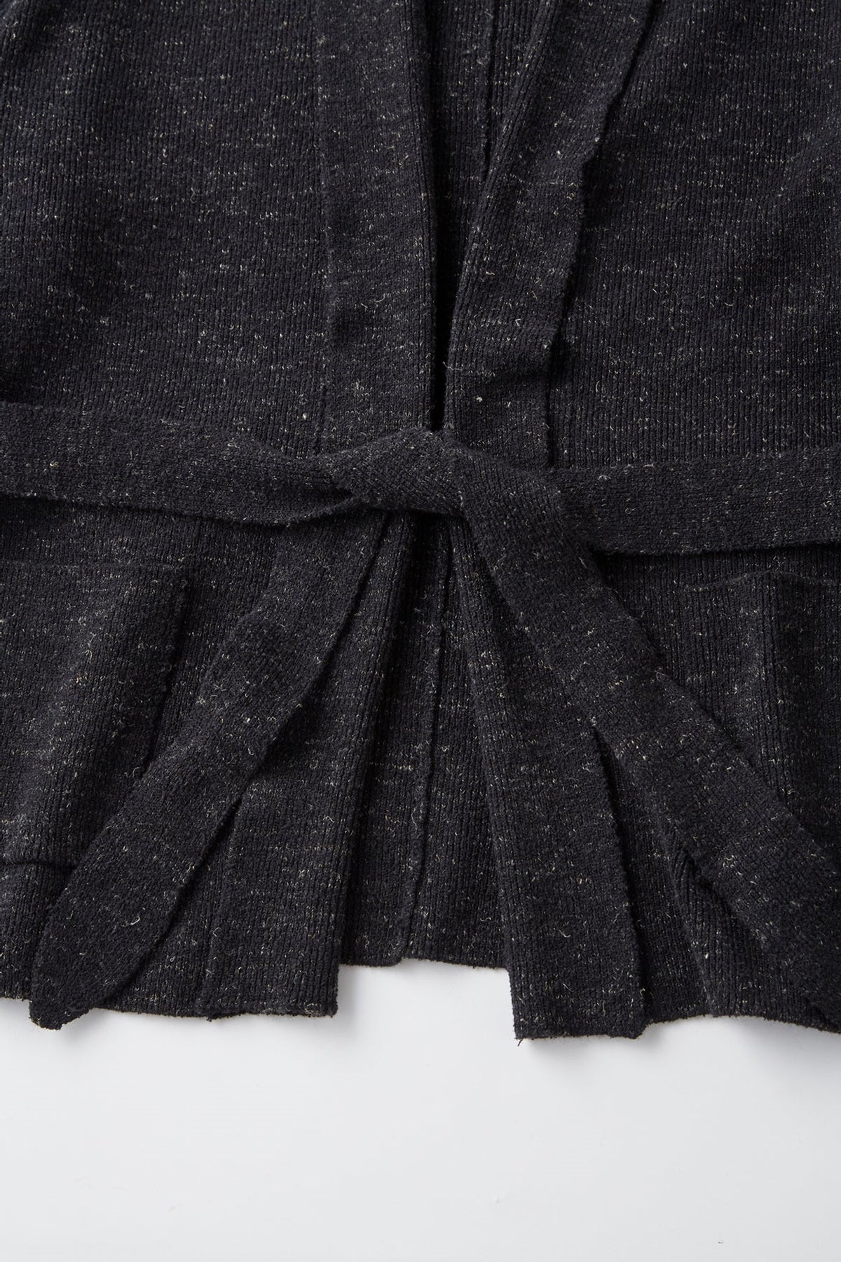 素材は編み目の表面にループが出るブークレと、スラブをより合わせて編立てた。ブークレは綿混率が高く、表面の凹凸の中にも柔らかなさわり心地を持つ。スラブにはリネンが入っているためシルエットを形成する上でのハリ感も持ち合わせる。度目も詰めているため甘くなりすぎず絶妙なバランスに仕上げた。