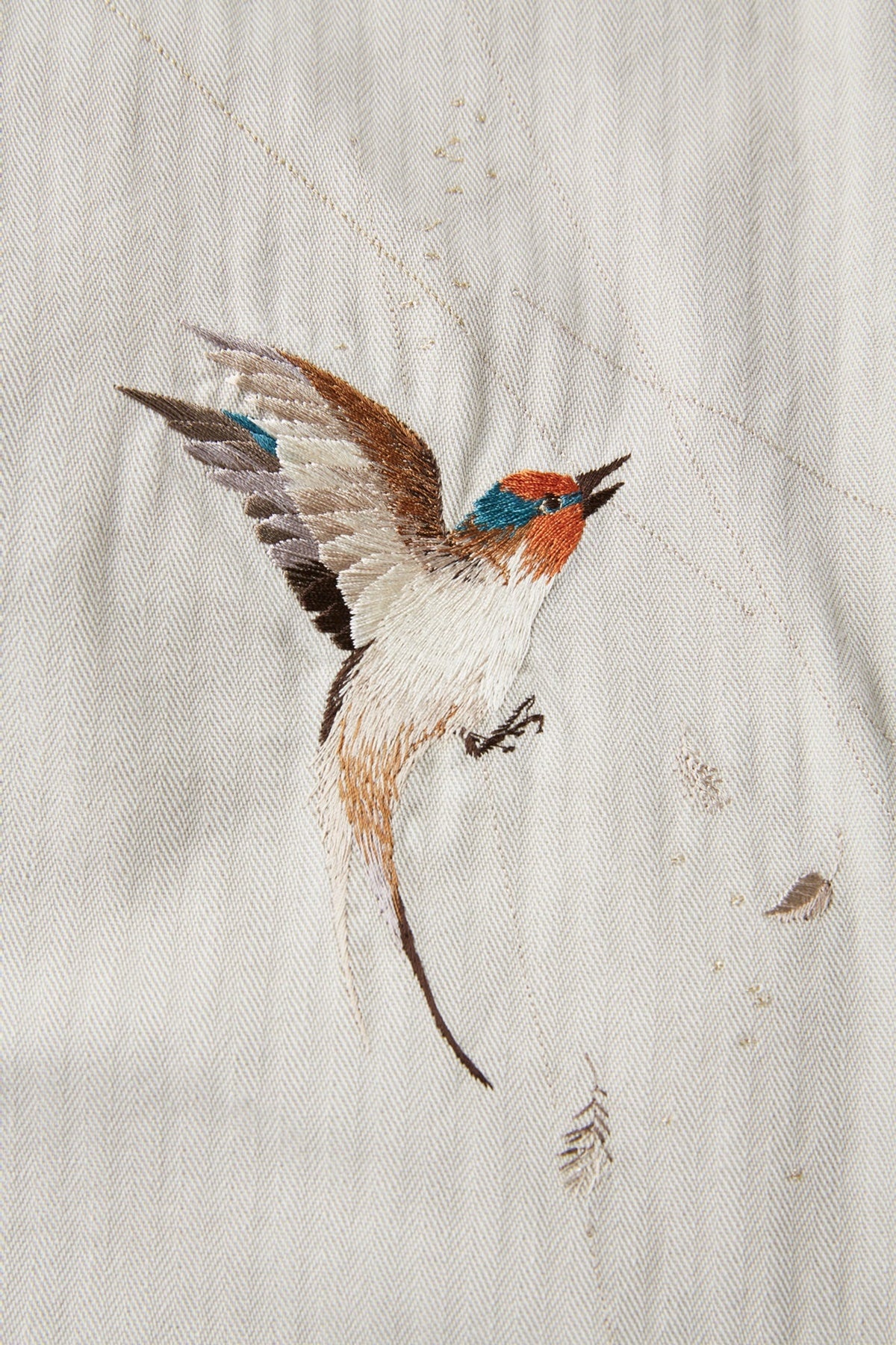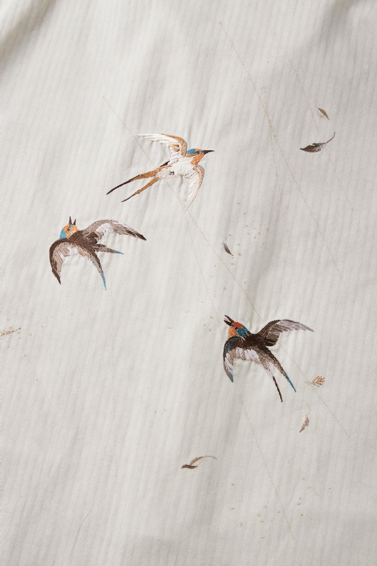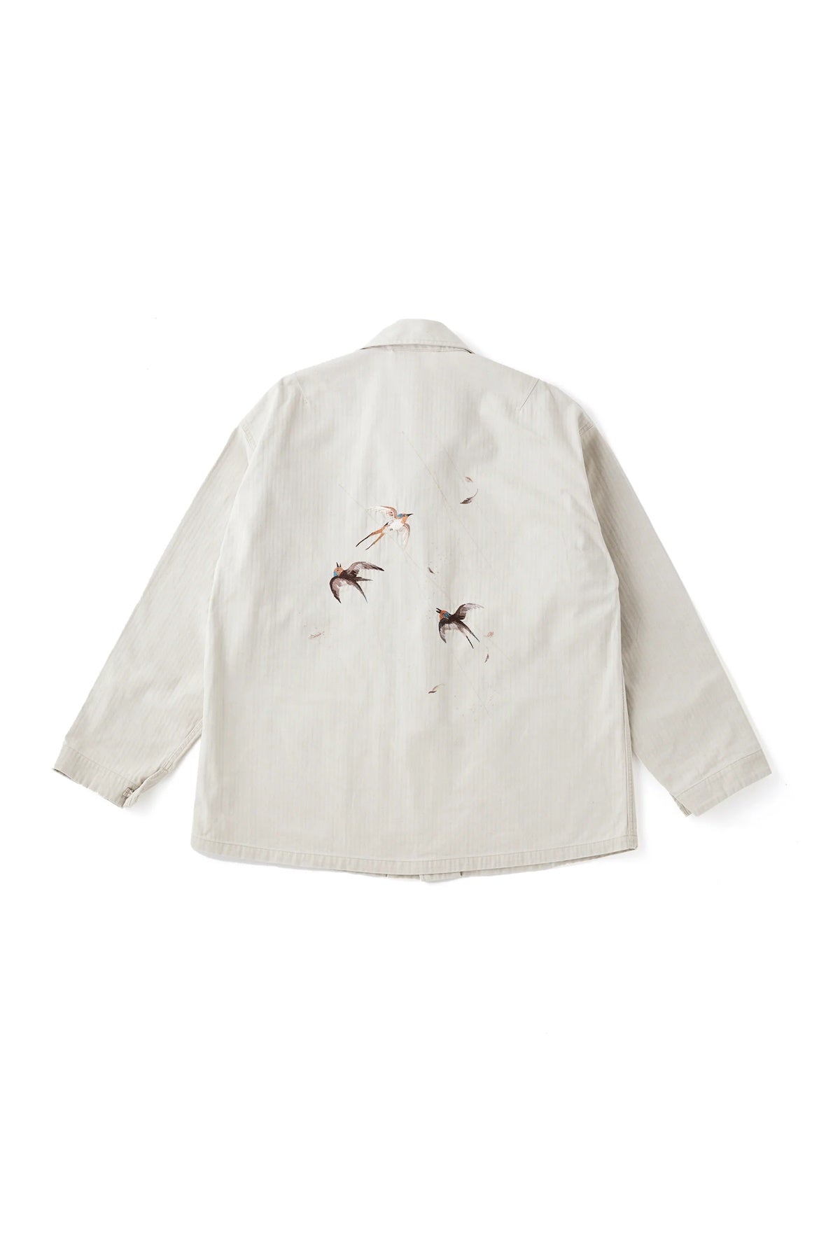 私たちの新しいエッセンシャルピースとなる、美しい日本の刺繍図を纏ったジャケット。伝統的なテクニックに倣い、古き良き美しい日本の風景を写実的に柄起こしした刺繍図が他にはない雅な存在感を持つスーベニアジャケット。夕立の中、燕たちが羽ばたく一瞬を切り取った情景は、現代では忘れ去られてしまった自然の景色の豊かさを気づかせてくれるかのよう。アーカイブピースで見かけるスカジャン刺繍のクオリティ、世界観とは一線を画し、糸の太さに色数、グラデーション、陰影の付け方など限界まで設計したエレガントな表情が目を引きます。またオリジナルカラーで硫化染色し、経年変化の様を楽しめるコットンヘリンボーンの色合いも40年代のアーカイブピースで見かけるカラーとは違い上品な枯れ感を持っており、侘びと寂び、雅の二面性を感じ取れる事でしょう。