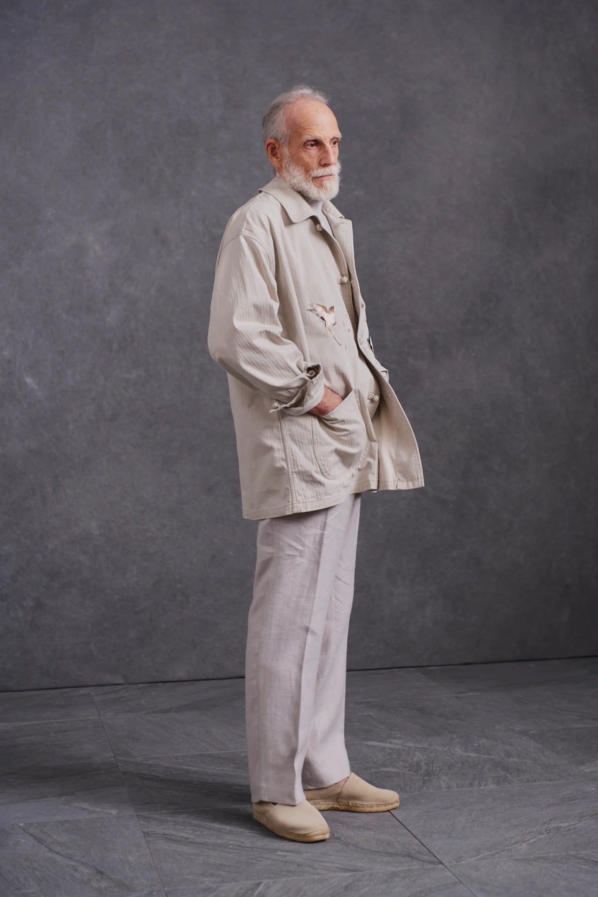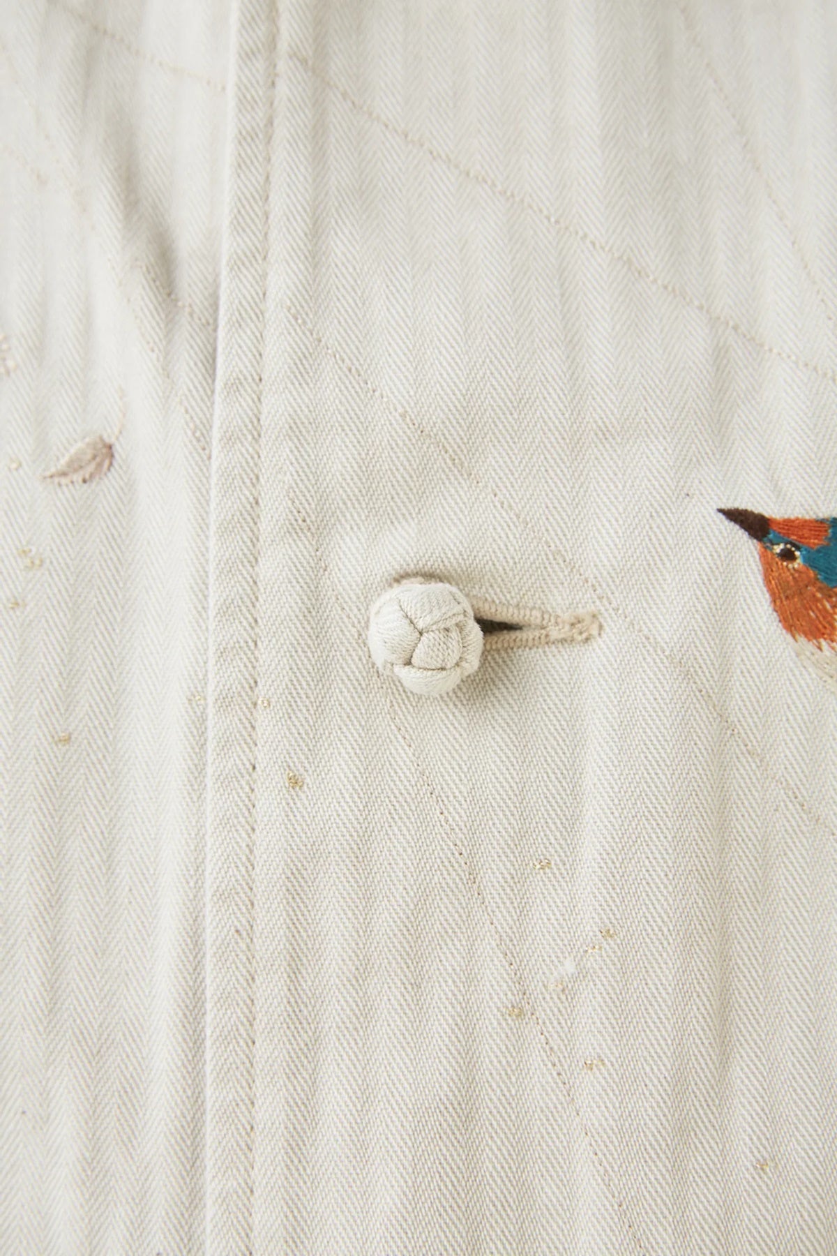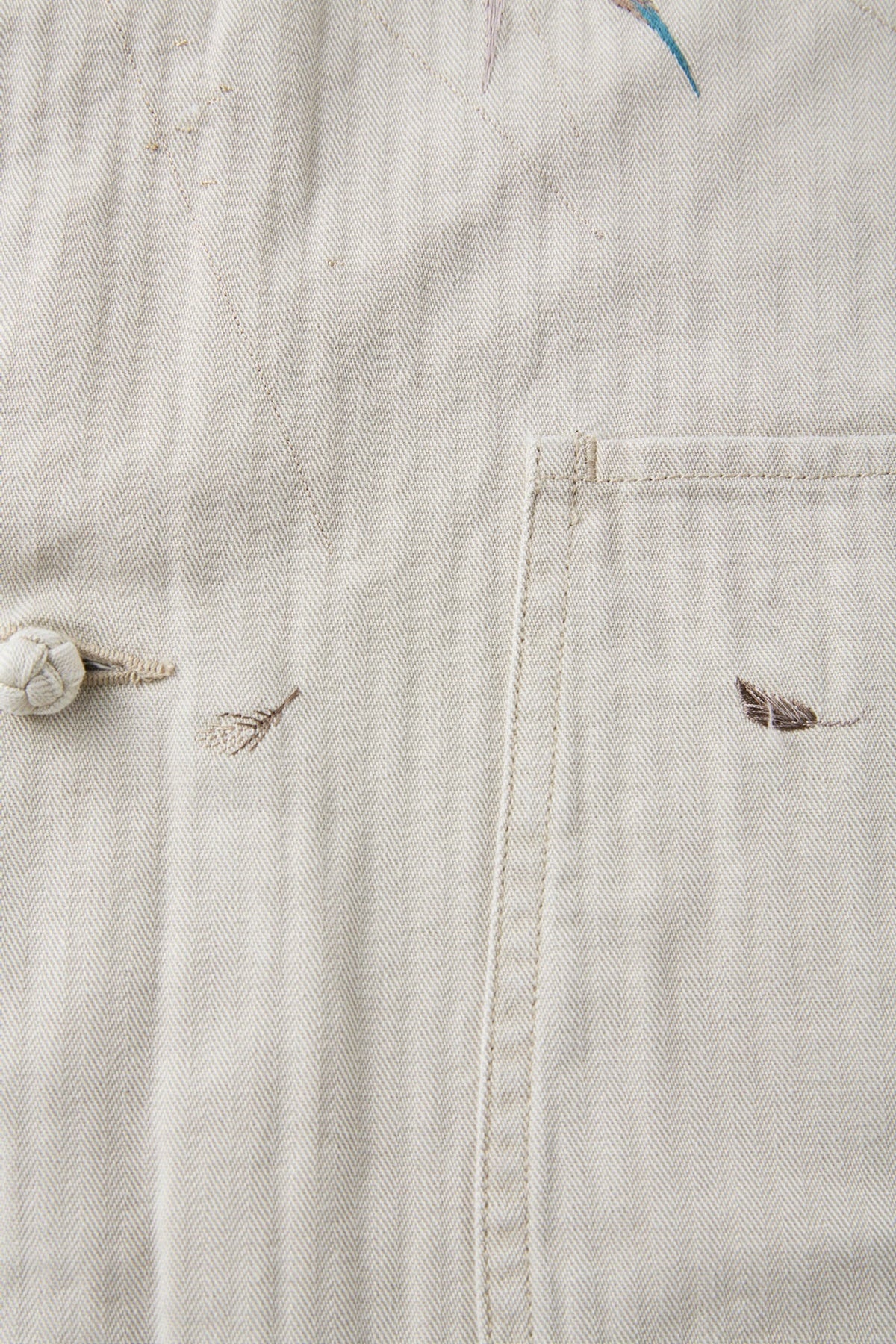 私たちの新しいエッセンシャルピースとなる、美しい日本の刺繍図を纏ったジャケット。伝統的なテクニックに倣い、古き良き美しい日本の風景を写実的に柄起こしした刺繍図が他にはない雅な存在感を持つスーベニアジャケット。夕立の中、燕たちが羽ばたく一瞬を切り取った情景は、現代では忘れ去られてしまった自然の景色の豊かさを気づかせてくれるかのよう。アーカイブピースで見かけるスカジャン刺繍のクオリティ、世界観とは一線を画し、糸の太さに色数、グラデーション、陰影の付け方など限界まで設計したエレガントな表情が目を引きます。またオリジナルカラーで硫化染色し、経年変化の様を楽しめるコットンヘリンボーンの色合いも40年代のアーカイブピースで見かけるカラーとは違い上品な枯れ感を持っており、侘びと寂び、雅の二面性を感じ取れる事でしょう。