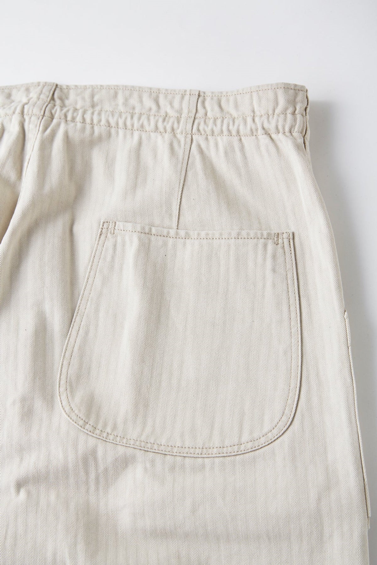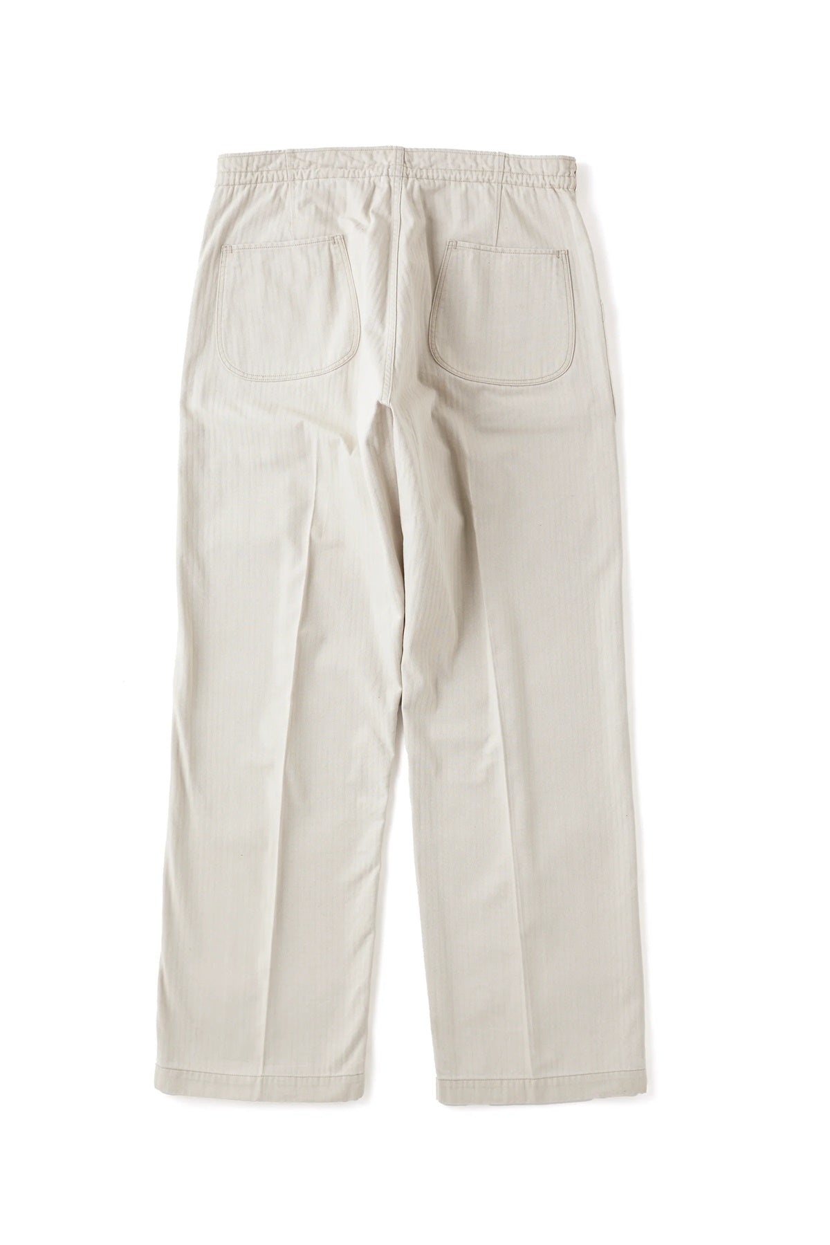 スーベニアジャケットのセットアップでラインナップされるヘリンボーントラウザー。ミリタリーアーカイブピースのデザインをベースに、ウエストにドローコードを配しリラックスした表情に。またオリジナルのカラーチップで硫化染色されたコットンヘリンボーンは、経年と共に味わい深く枯れていくことでしょう。
