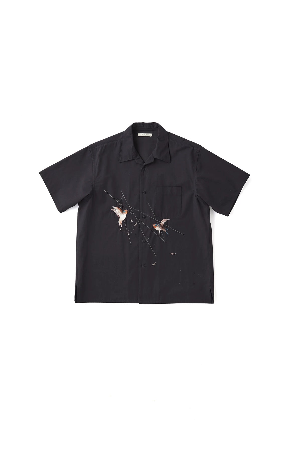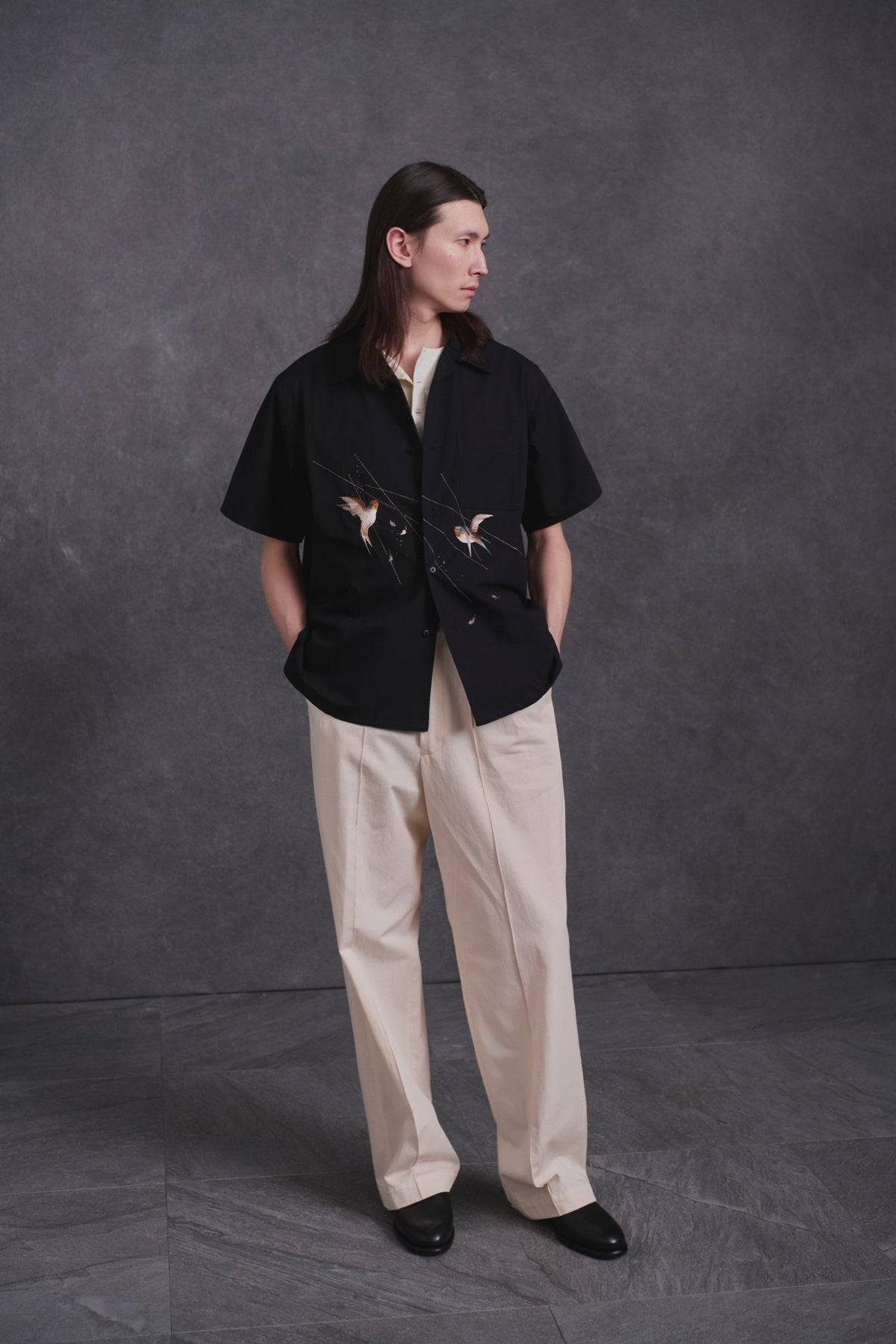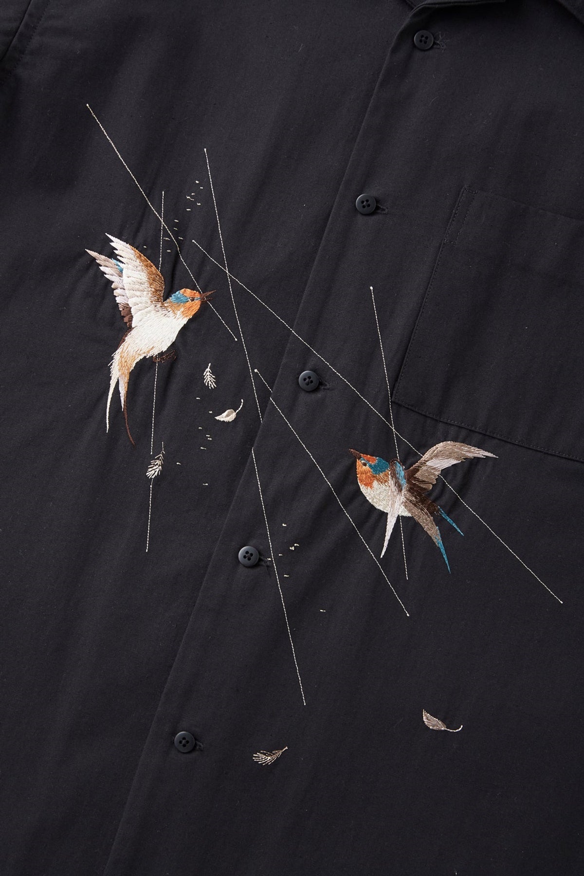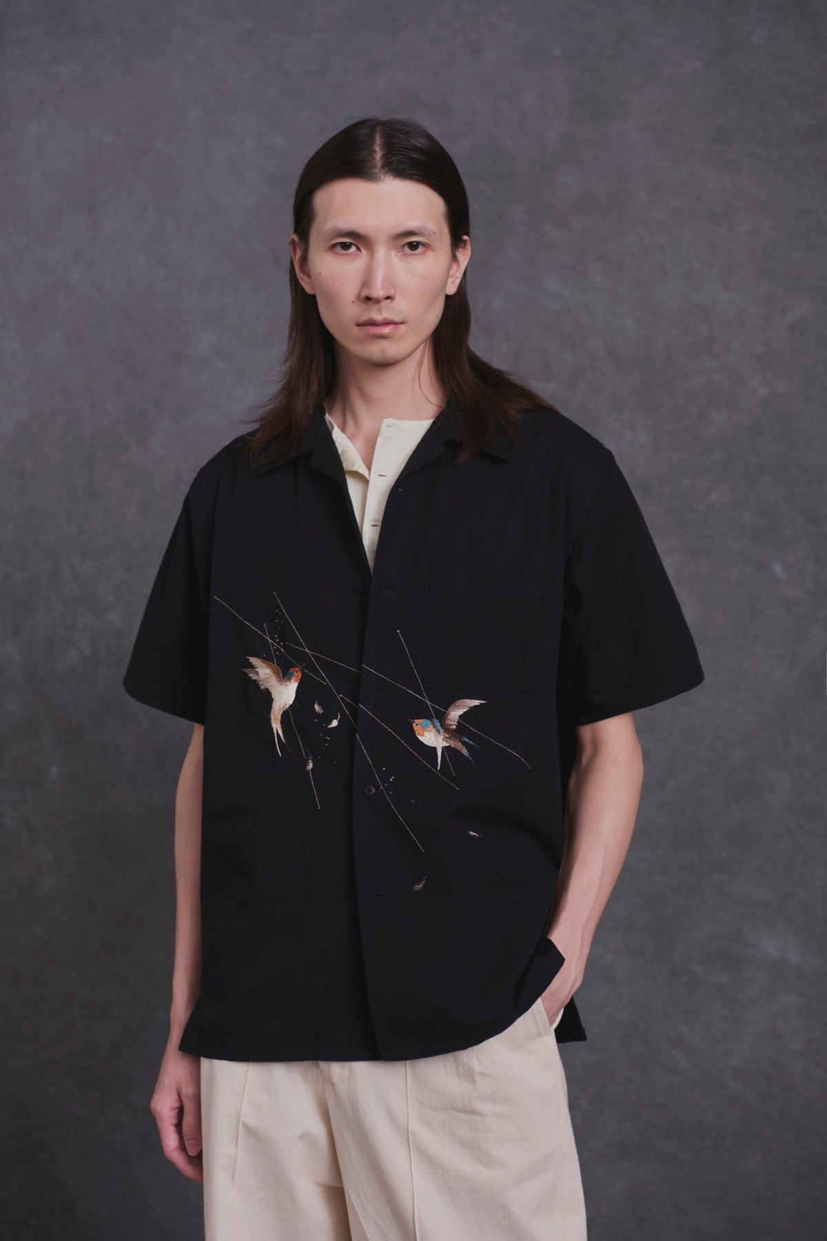 私たちの新しいエッセンシャルピースとなる、美しい日本の刺繍図を纏ったシリーズ。伝統的なテクニックに倣い、古き良き美しい日本の風景を写実的に柄起こしした刺繍図が他にはない雅な存在感を持つスーベニアシャツ。夕立の中、燕たちが羽ばたく一瞬を切り取った情景は、現代では忘れ去られてしまった自然の景色の豊かさを 気づかせてくれるかのよう。アーカイブピースで見かけるスカシャツ刺繍のクオリティ、世界観とは一線を画し、糸の太さに色数、グラデーション、陰影の付け方など限界まで設計したエレガントな表情が目を引きます。またローシルクの糸ならではのネップが目を引くマテリアルは、プリミティブかつモダンな佇まいを見せてくれます。