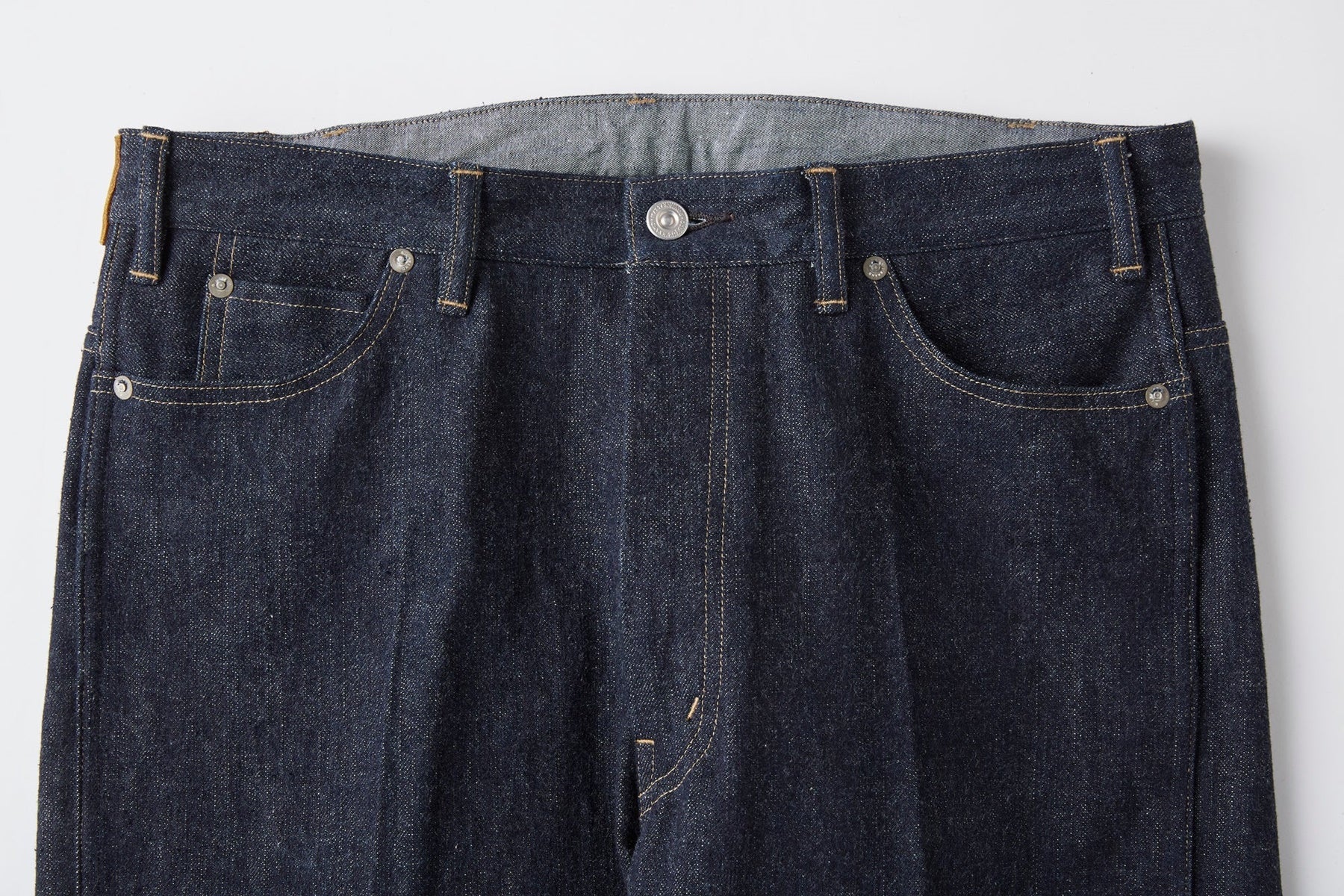12.4oz OLDJOE original denim糸から拘り、オリジナルのバルキーさを表現し、ラスティックなネップ感を入れ込み、デニムの産地、井原にて製作しています。 経糸にムラ、ネップ形状の強いものを黒味の強いインディゴ染料で染色し、ヨコ糸は比較的ベージュ味の綿を厳選し強撚をかけて糸にしております。生地はいわゆるキバタと言われる織り上がった状態のものから、特殊な方法でサンフォライズ(防縮加工)のみをかけています。 通常の防縮方法とは違いますのでいわゆるリジッドデニムと呼ばれる表面にノリが付着した固い生地にはならず柔らかな手触りを表現しました。風合いや色味の重厚感、実際手に取った時の質感や、着用時の履きやすさ、糸使いも含めて、 OLDJOEならではのプリミティブかつモダンな存在感を持ったオリジナルデニム。