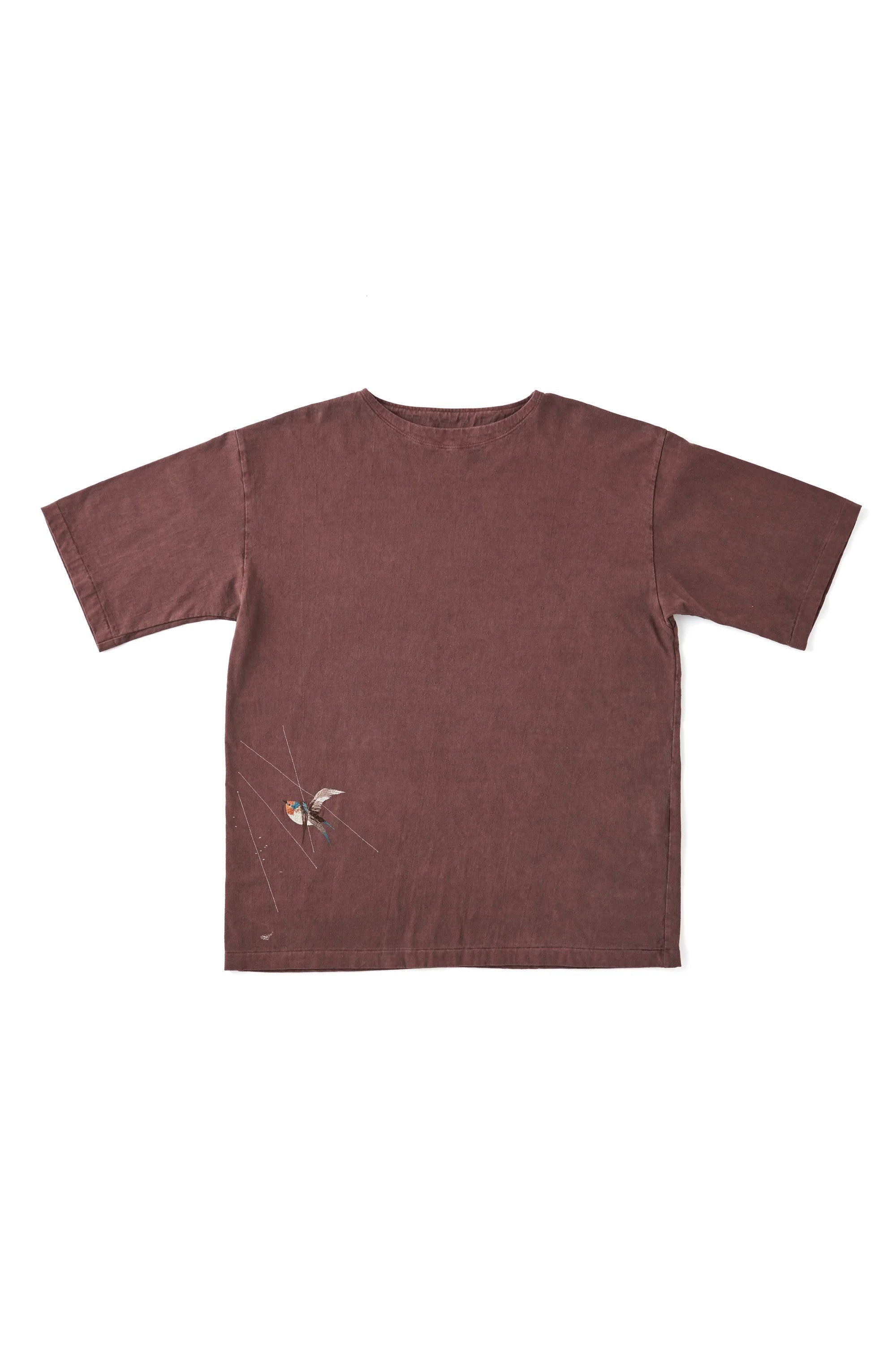 私たちのオリジナルデザインにより製作されるTシャツをベースに、それぞれにユニークなストーリーを持たせたデコレーションが他にはない存在感を放ちます。首リブを省かれ背裏がつくディテールはアーリーセンチュリー時代のスポーツウェアに散見することが出来る。またピグメントにより染められるカラーリングは深みと独特な質感が特徴的。そして日本の古き良き原風景を彷彿させる刺繍が、ノスタルジックなムードを醸し出す。