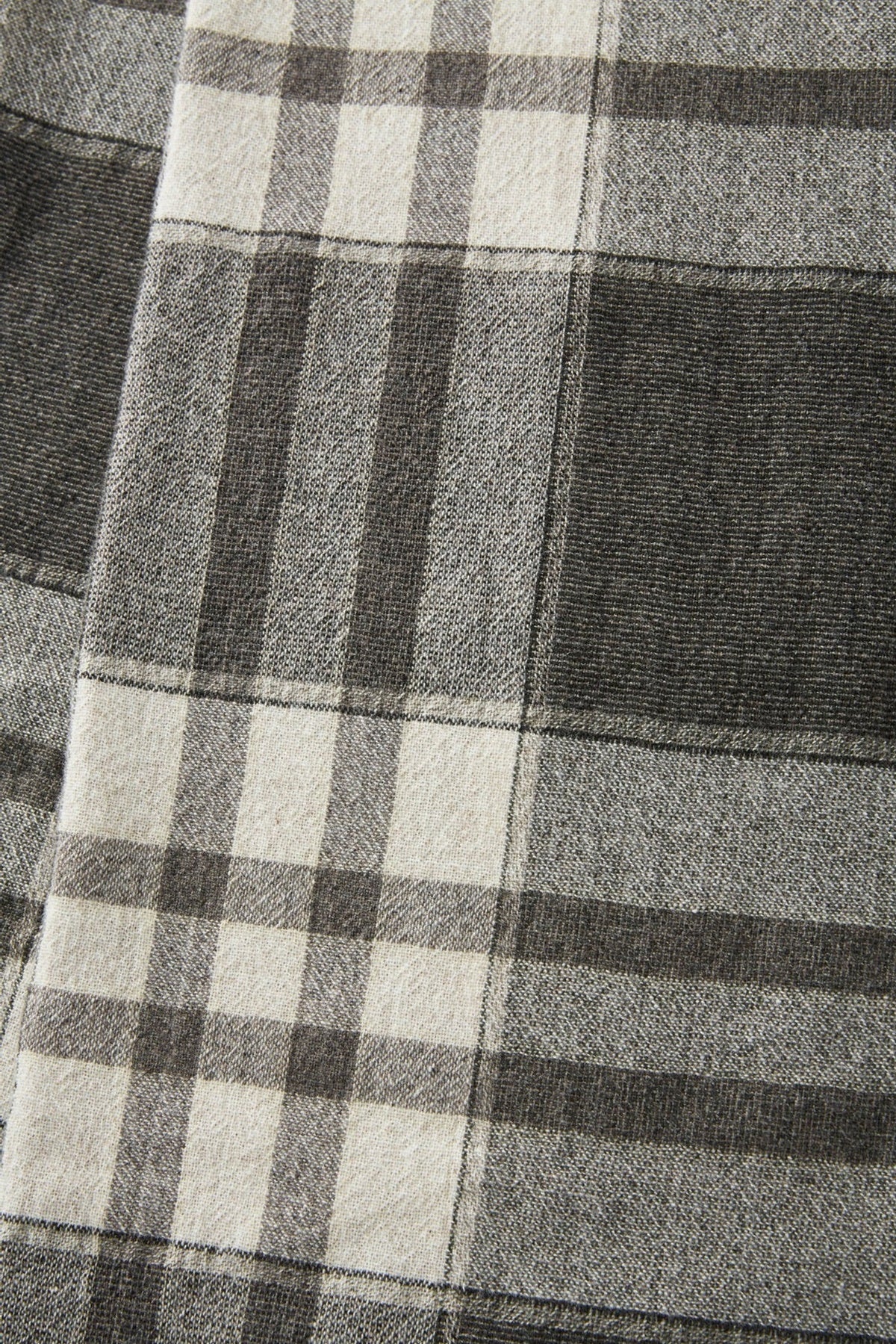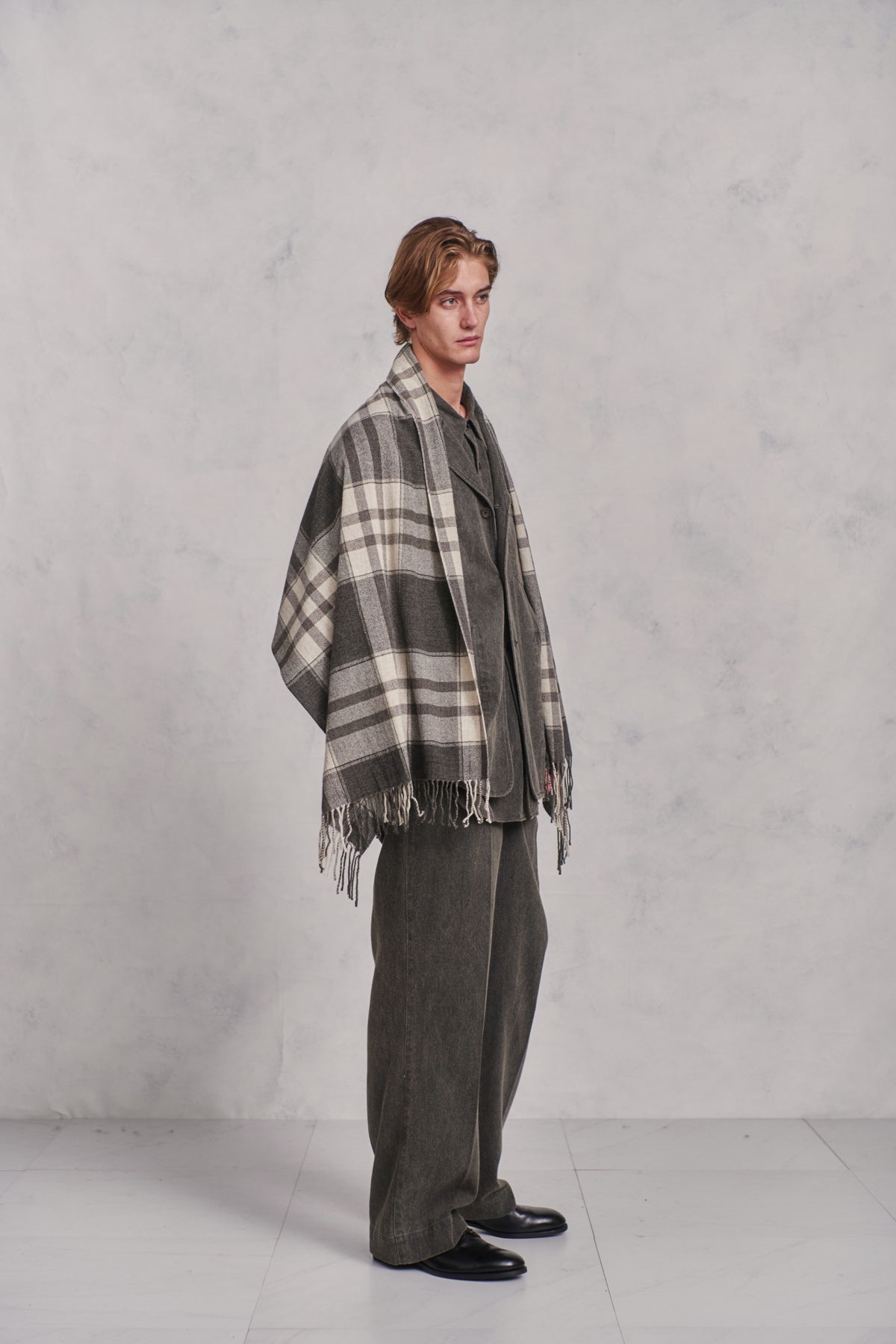 タスマニアウールとカシミアの混紡糸のチェック地。あえて平織で規格を甘くして製織しているため、ワッシャー加工で幅丈を詰めて柔らかい風合いを演出。適度な肉感が特徴。