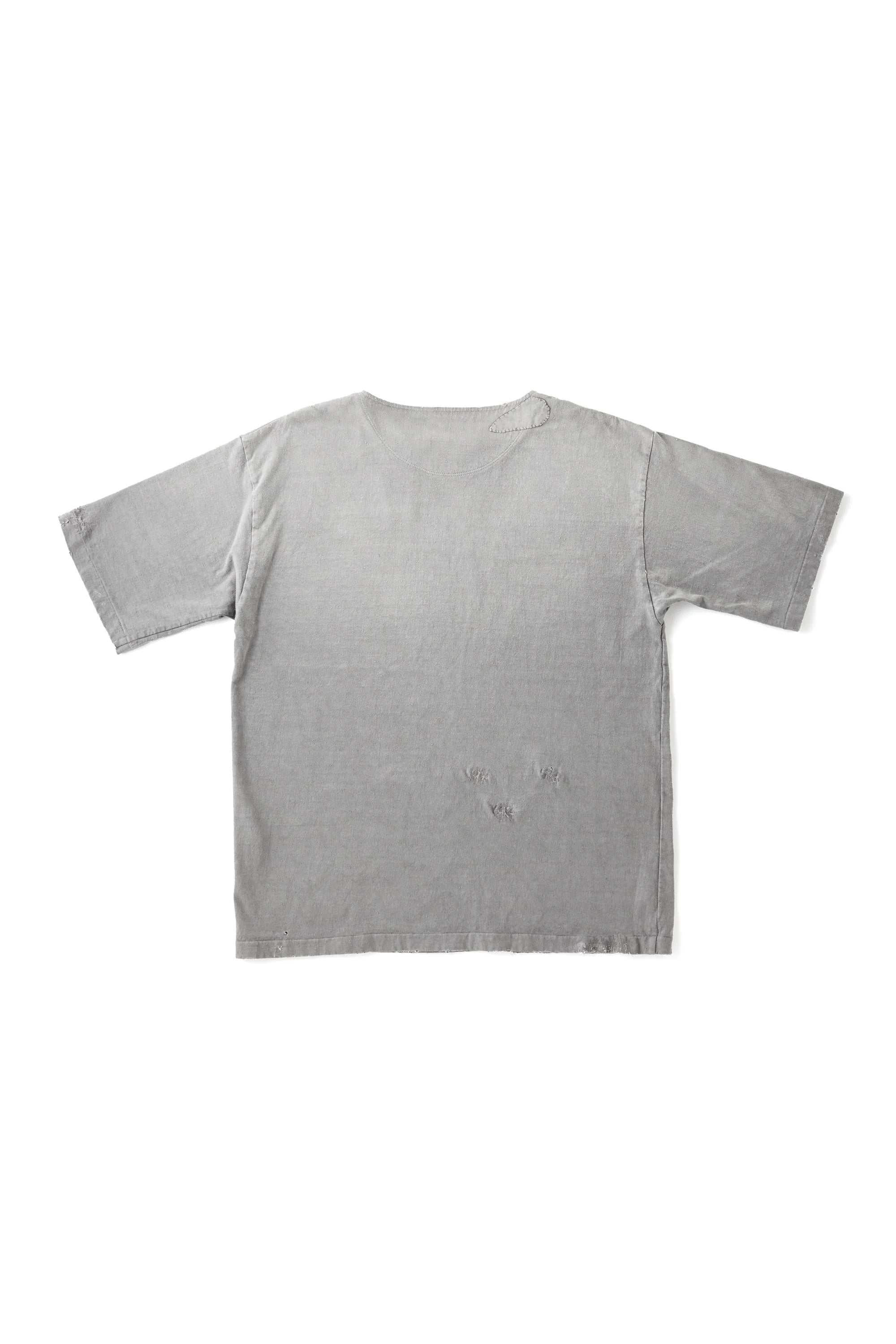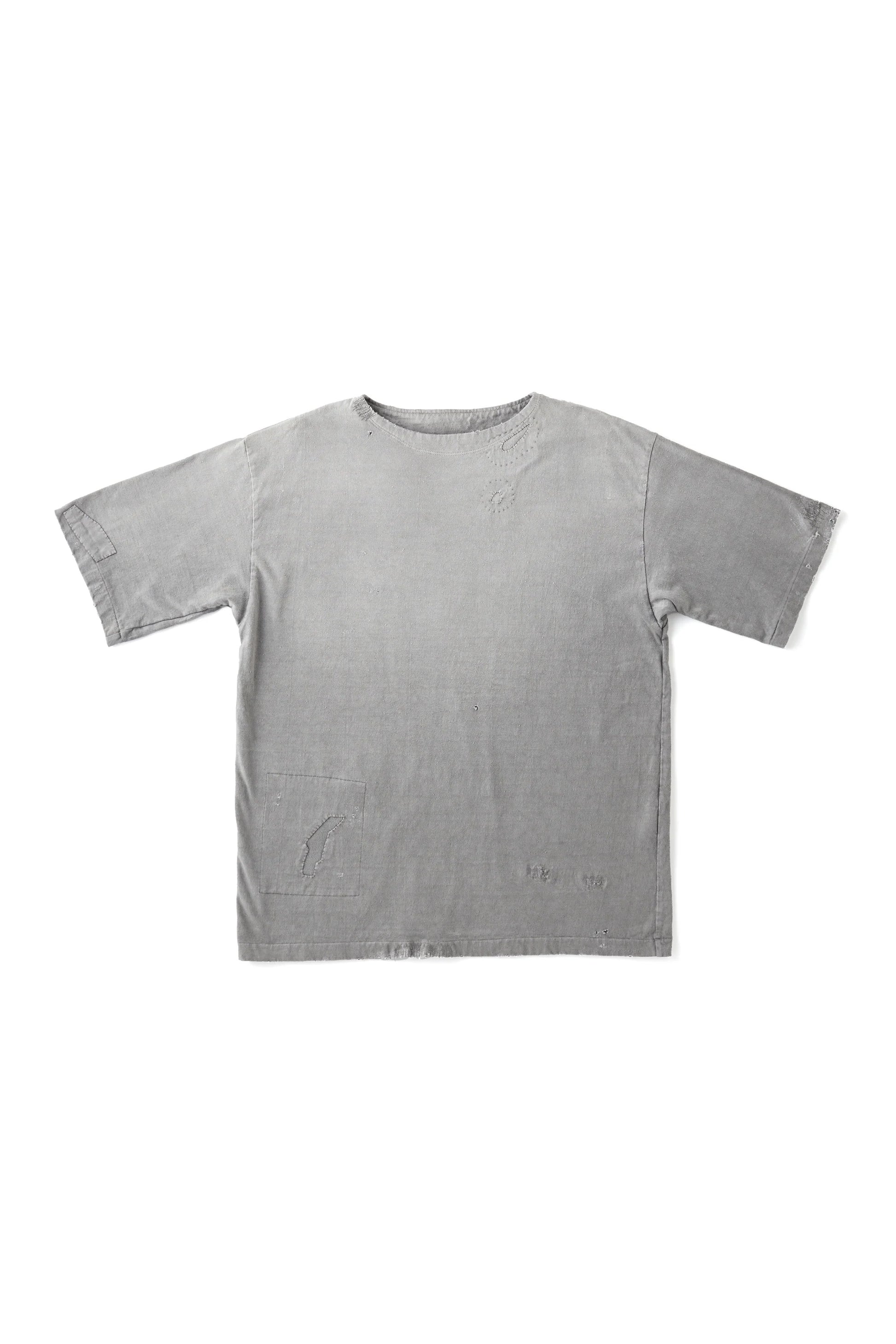 私たちのオリジナルデザインにより製作されるTシャツをベースに、それぞれにユニークなストーリーを持たせたデコレーションが他にはない存在感を放ちます。首リブを省かれ背裏がつくディテールはアーリーセンチュリー時代のスポーツウェアに散見することが出来る。またピグメントにより染められるカラーリングは深みと独特な質感が特徴的。私たちのシグネチャーピースの一つ、衣服の経年変化の様や補修跡、ダメージをデザインとして再構築させたスカーフェイスメソッドを用いて製作。