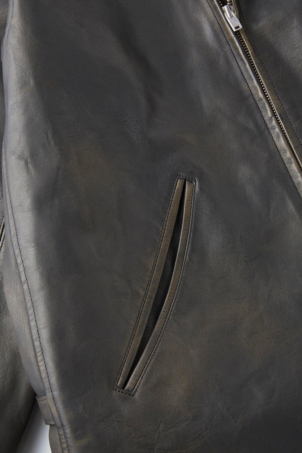 私たちのシグネチャーマテリアルのベジタブル鞣しのホースレザー。オリジナルのレシピによってハンドエイジングされた革の表情は、長年愛されてきたかのような逞しさと美しさを持つ。アヴィエーター服の名残りを感じれる3つの部屋で構成される変形したD型ポケットが最大のユニークポイント。所謂ライダースジャケットとは違い、スポーツカフスにベルテッドバックスタイル、緩やかに湾曲したフロントラインなど当時のエレガントな空気感を放ちます。またポケットのジップに装着されるチェーンスライダーも型から製作したオリジナルのものとなりアールデコ調のデザインが程よいバランスでレイアウトされています。
