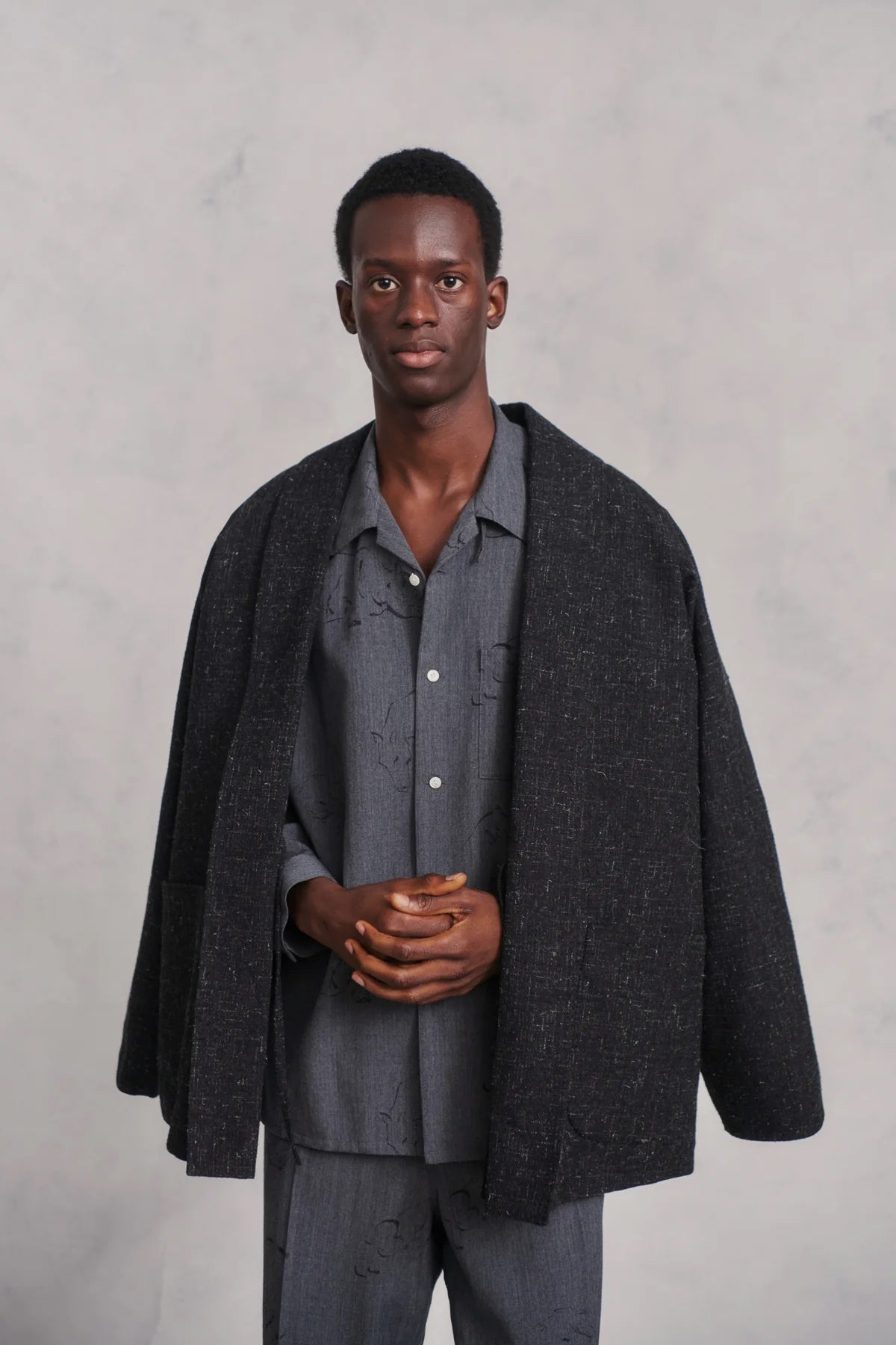 オリジナルパターンのワンナップカラーシャツ。長く伸びたトップループ、バックヨークレス、ラウンドした襟先などとてもクラシカルでいて上品なディテールは1940〜50sのアーカイブピースからのインスピレーション。今季はマテリアルをウールに置き換えてセットアップでラインナップ。日本画のような力強さを持ち、筆のストロークが際立つ動物のアウトラインは大らかでモダンな印象を見せる。