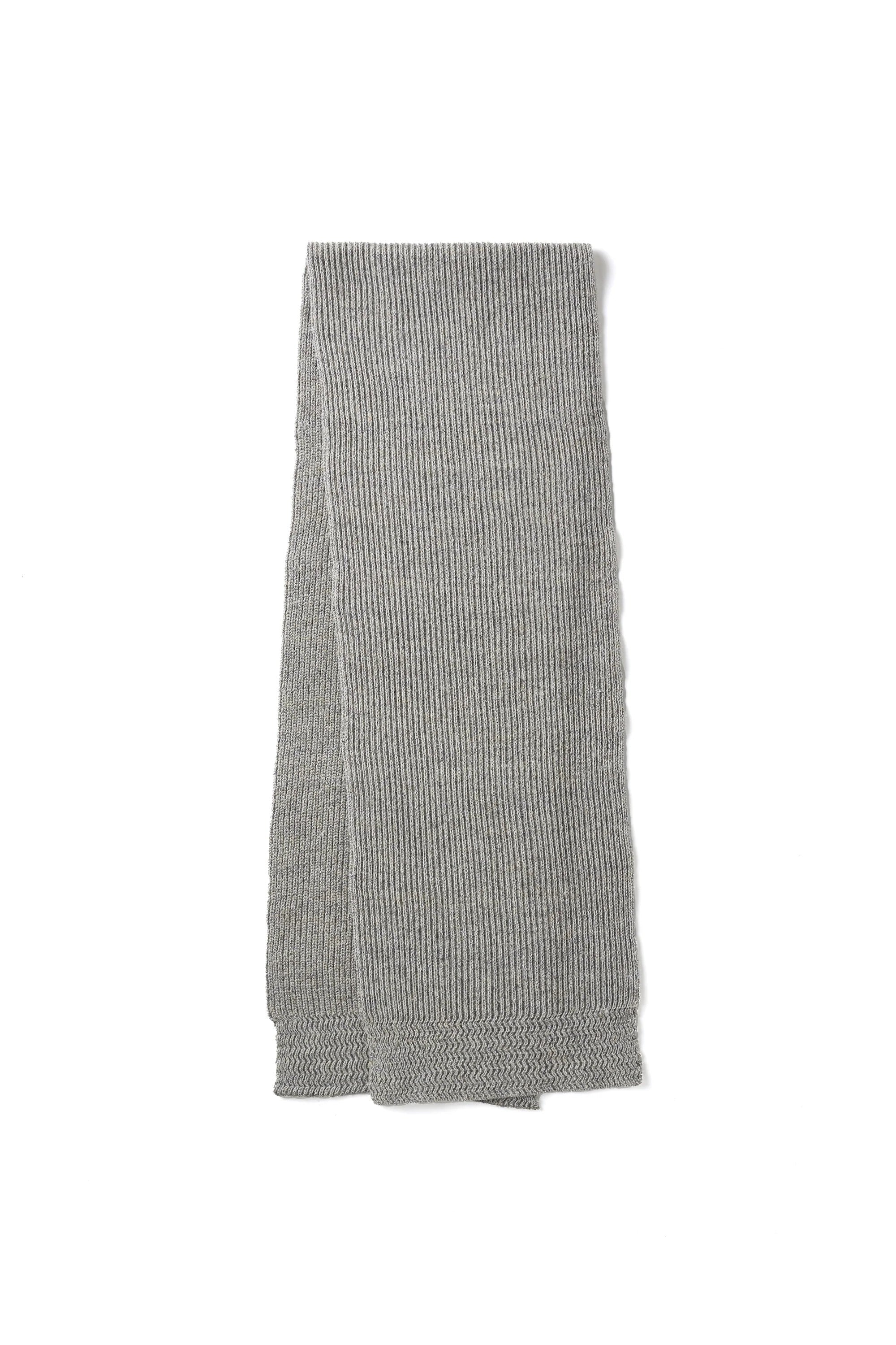 オーセンティックな畔編みのニットマフラー。ストレートウールとリネンケンピをブレンドさせ、上質な編み地の中に粗野な雰囲気を持つケンピヤーンが主張し奥行きのある表情に仕上がっています。