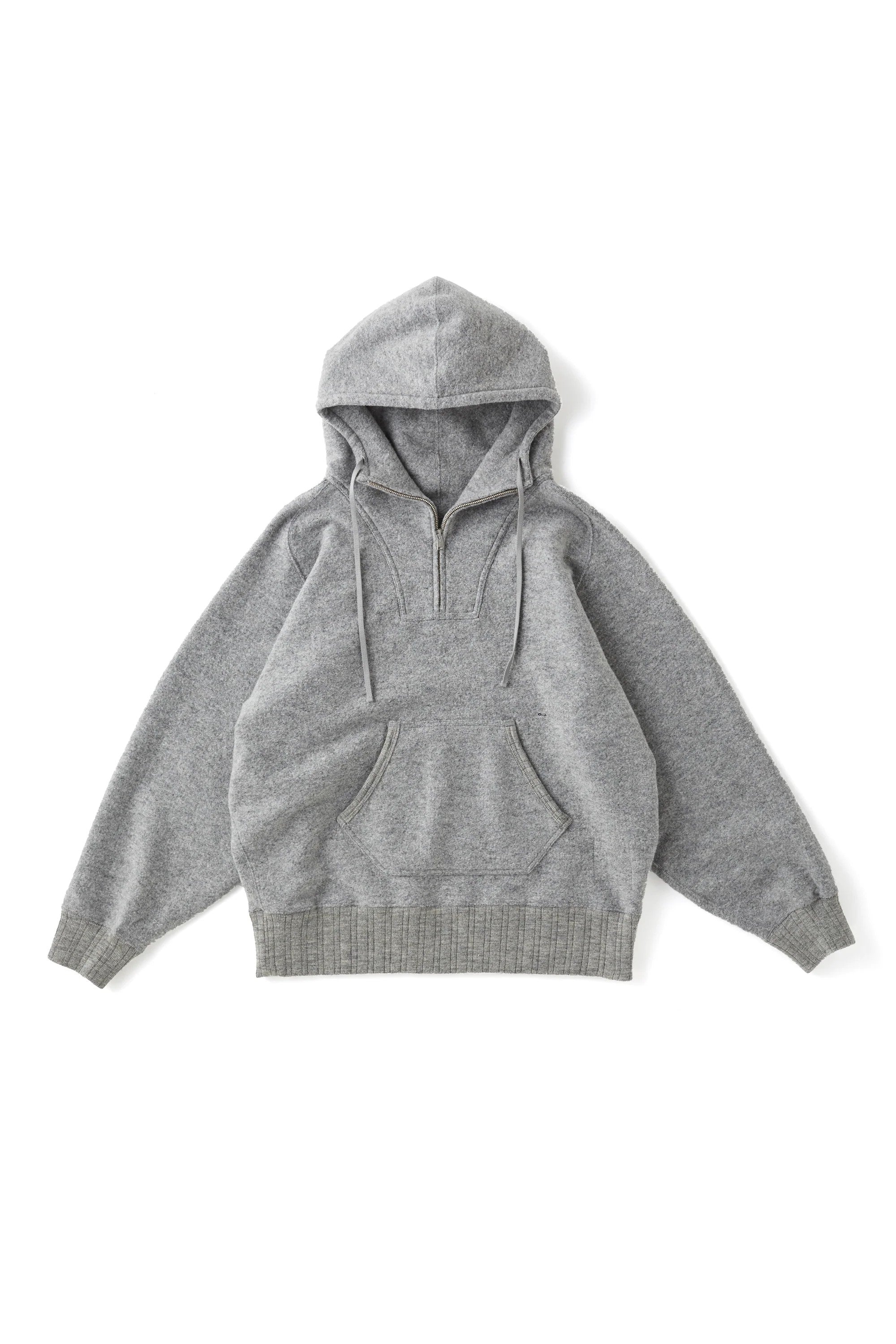 ハーフジップ仕様のスウェットフーディー。古き良き時代のベンチコートなどのアーカイブピースからのインスピレーションでデザインされる。ファンシーウールヤーンで編み立てたマテリアルは、上質な質感と心地よい肌触りが特徴的。またテーラーメイドのシャツに施されるような上品なイニシャル刺繍がクラシカルな雰囲気を盛り上げる。