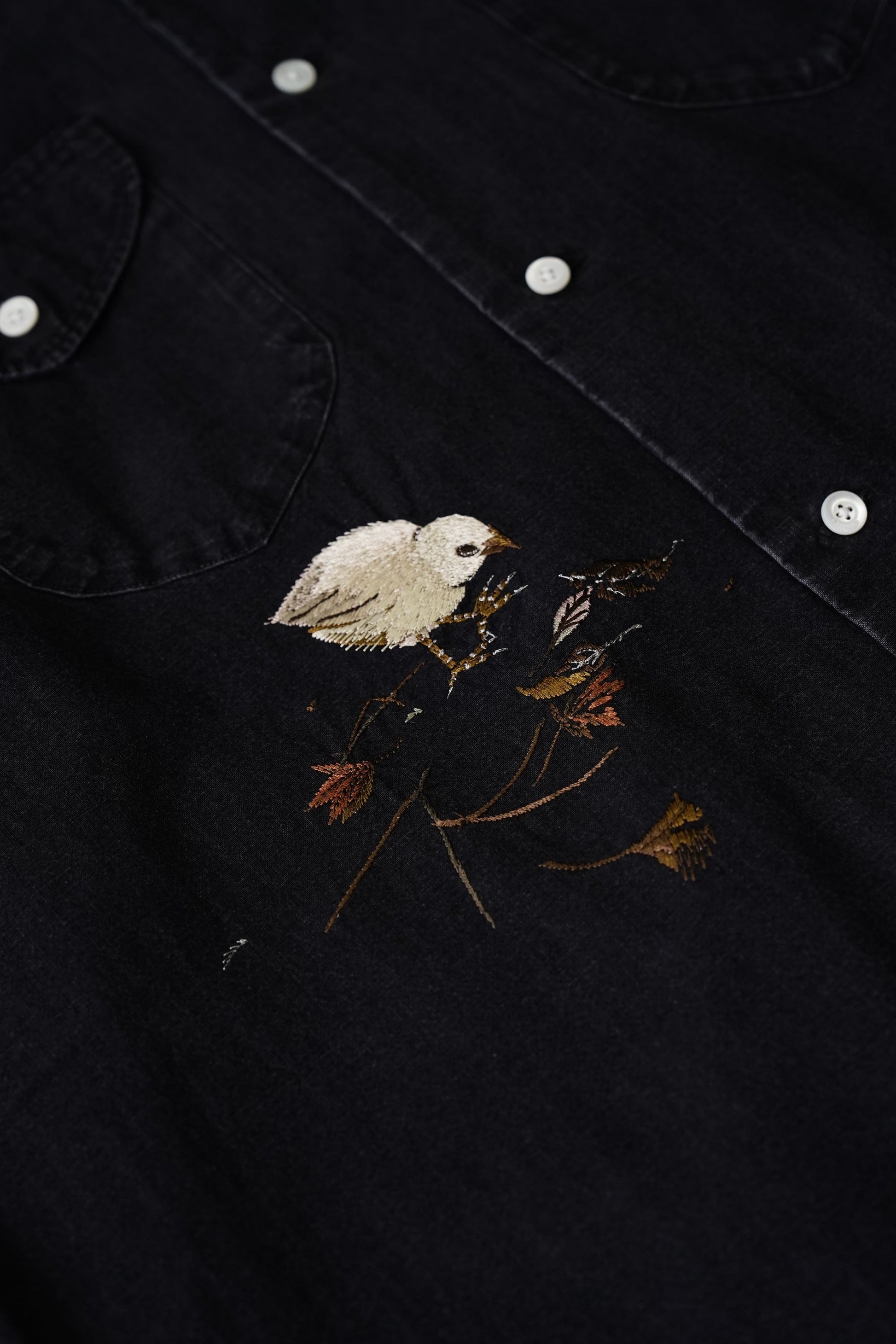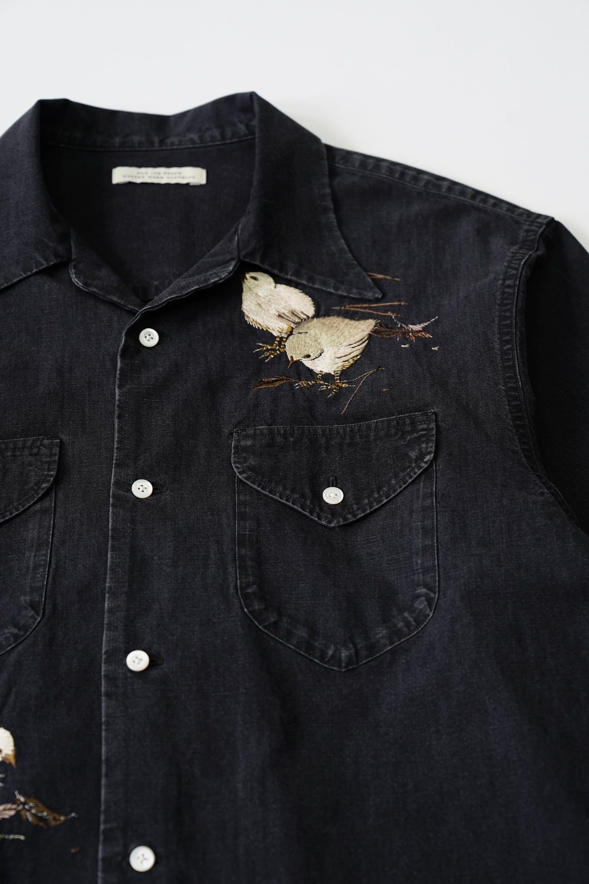 スワローカラーと呼ばれるアールの付いたロングポイントカラーがとても美しい開襟シャツ。また1940s頃のスポーツシャツをイメージしてデザインされたこのシャツは、フロントに配されたダブルポケットにゆったりとした身幅のバランスが程よいリラックス感を持っています。そして日本の伝統的なテクニックに倣い、 古き良き美しい日本の原風景が刺繍される。