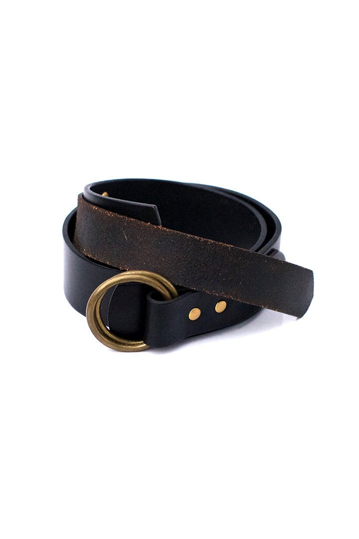 1940年代頃に実在したベルトをベースに、通常とは一味違ったリングベルトを制作。 バックルは重量感のある真鍮のダブルリング。使い込むほどに味わいのある雰囲気が出てきます。 差し込みの革はあえて裏側にしてあり、装着の際に表に出るデザイン。