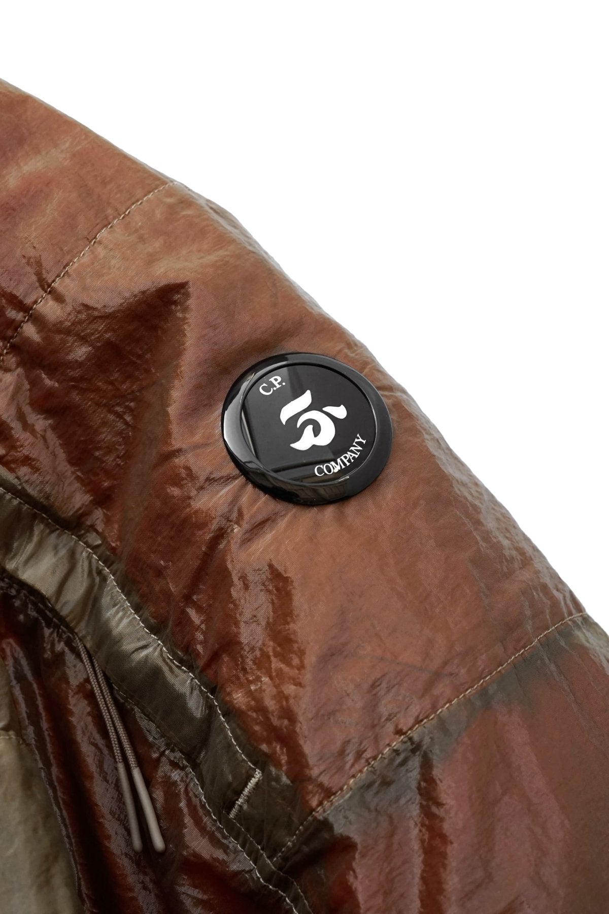 Kan-D – K(c)lear Achronic Nylon(garment)Dyed この特殊な生地は、フラット化された単一繊維であるモノフィラメントナイロンをベースにしています。染色に伴う生地の縮率が高すぎる為、生地染めを行う事が極めて困難であり、染色後に洋服として成型する事が困難な生地をあえて採用しています。C.P. Companyのガーメントダイ技術を使用し、化学的アプローチによる完璧な縮率計算の基に製品化に成功しています。生地の収縮率、収縮方向は部位によって様々であるため、染色前は歪なフォルムのジャケットを成形します。ガーメントダイ後には縮率計算通りの収縮活動が行われ、完璧なフォル ムに形状が変化します。染料の成分によっても縮率が異なる極めて繊細な生地のため、このプロセスはカラーごとに独立して行われています。このKan-DはC.P. Company史上最も挑戦的なアイテムあり、最も繊細で美しいアイテムでもあります。この透明なファブリックは、光の反射率も高く染色によりさらに美しさが増幅しています。