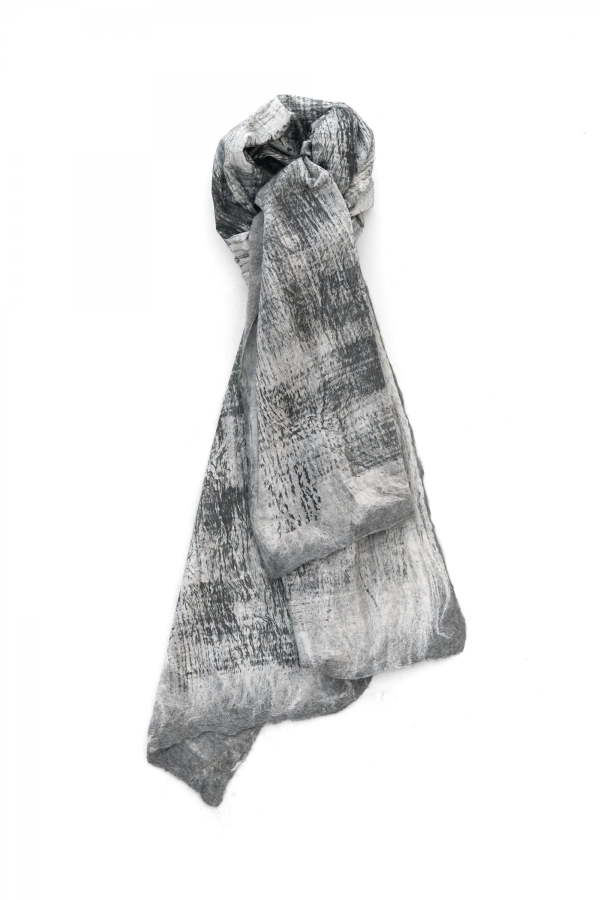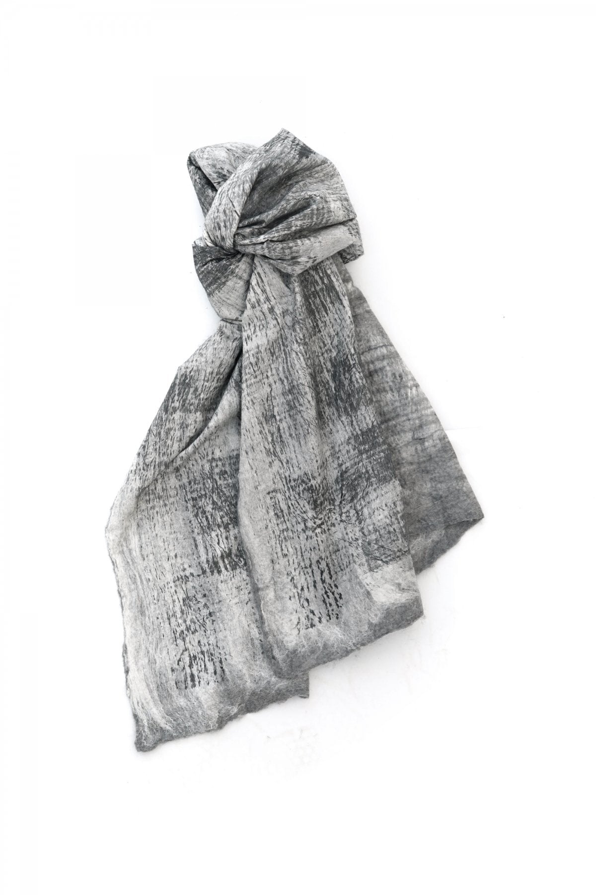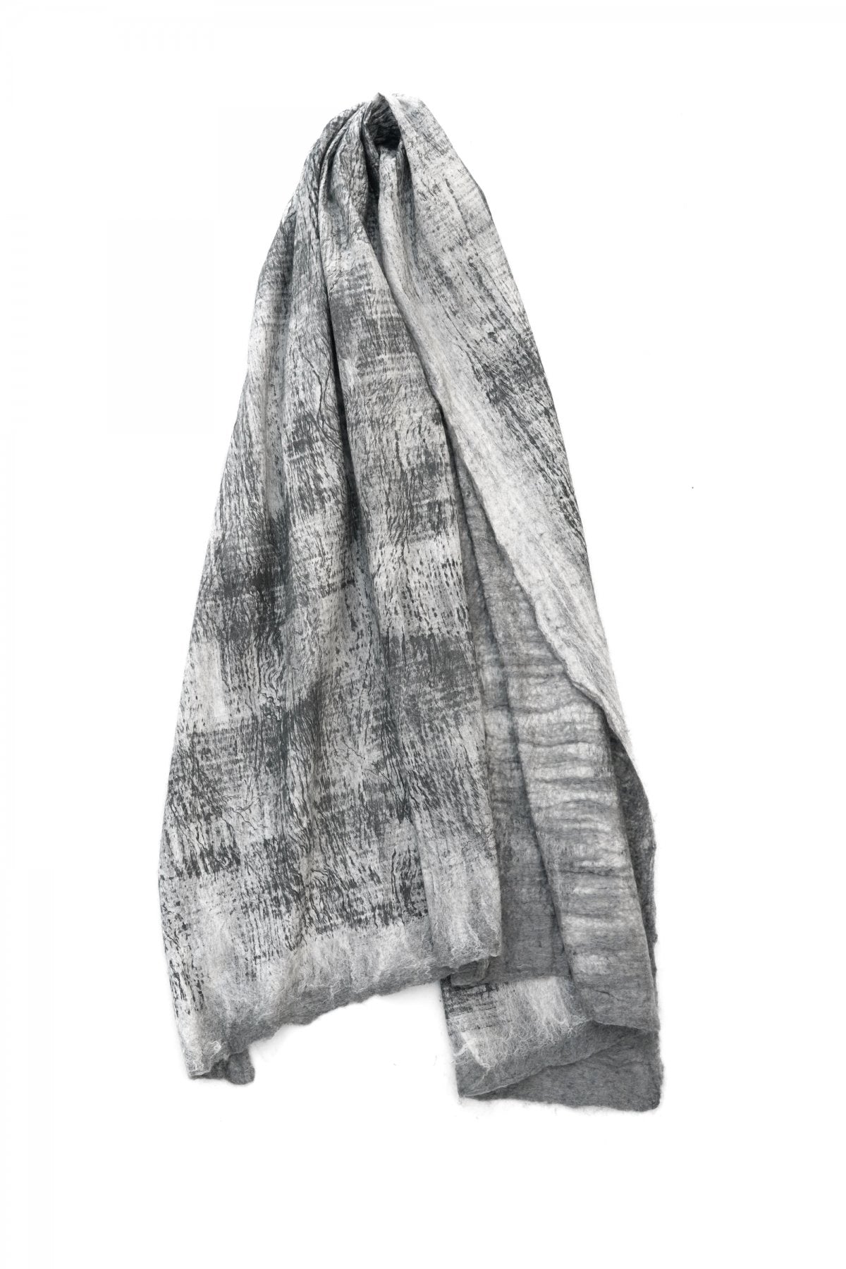 非常に柔らかで軽く温かみのある肌触り、使って行くうちにフェルト化してゆく経年変化や一つとして同じ物ができないクラフト、ハンドメードならではの特性もお楽しみ頂きたいストール。