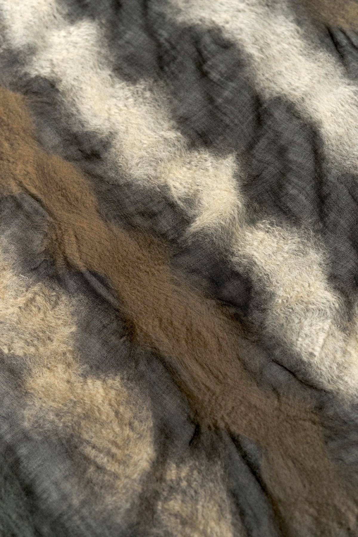 非常に柔らかで軽く温かみのある肌触り、使って行くうちにフェルト化してゆく経年変化や一つとして同じ物ができないクラフト、ハンドメードならではの特性もお楽しみ頂きたいストール。
