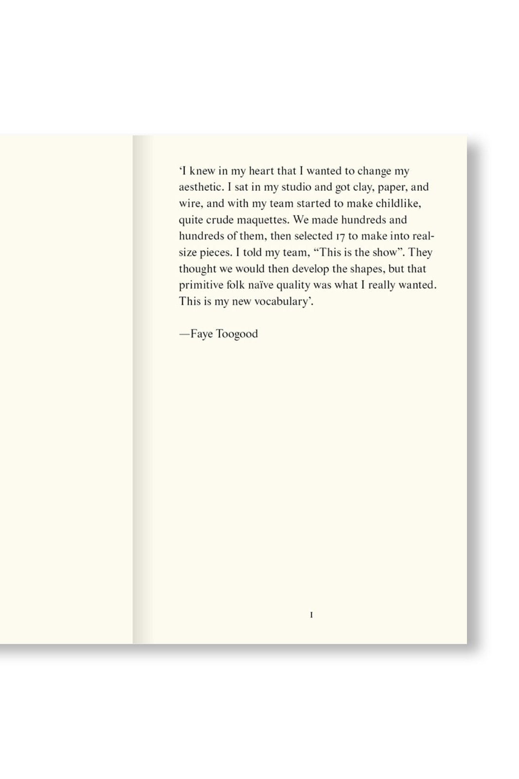 イギリス人アーティスト、デザイナーであり「Toogood」の共同設立者であるフェイ・トゥーグッド(Faye Toogood)の作品集。本作は、コレクションが完成する前のまだ生々しい始まりの瞬間を捉えている。ワイヤーやボール紙、テープ、キャンバスなど作者のスタジオにある日常的な素材を使い、約300もの椅子やランプ、スツール、ソファーベッドなどの模型から本プロジェクトは始まった。このピュアなままの状態とも言える模型を作った時点でコレクションの本質的な部分は決まっていた。模型のうち17点が実際のサイズで作られることとなるが、時折現実にある家具や彫刻にも寄り道をしながらオリジナルのままの模型を辿る旅をするように見ることができる。本書は、最終的に出来上がった作品の中に見られる偽りの感覚や、ある物が一見すると必ずしも「それ」ではないという事実を楽しんでいる。マン・ブッカー賞にノミネートされたイギリス人小説家のソフィー・マッキントッシュ(Sophie Mackintosh)による短編で本書は始まり、最後はアメリカ人インディペンデントキュレーター、作家のグレン・アダムソン(Glenn Adamson)のエッセイで締め括られており、その中でコレクションとプロセス全体の文脈が解説されている。