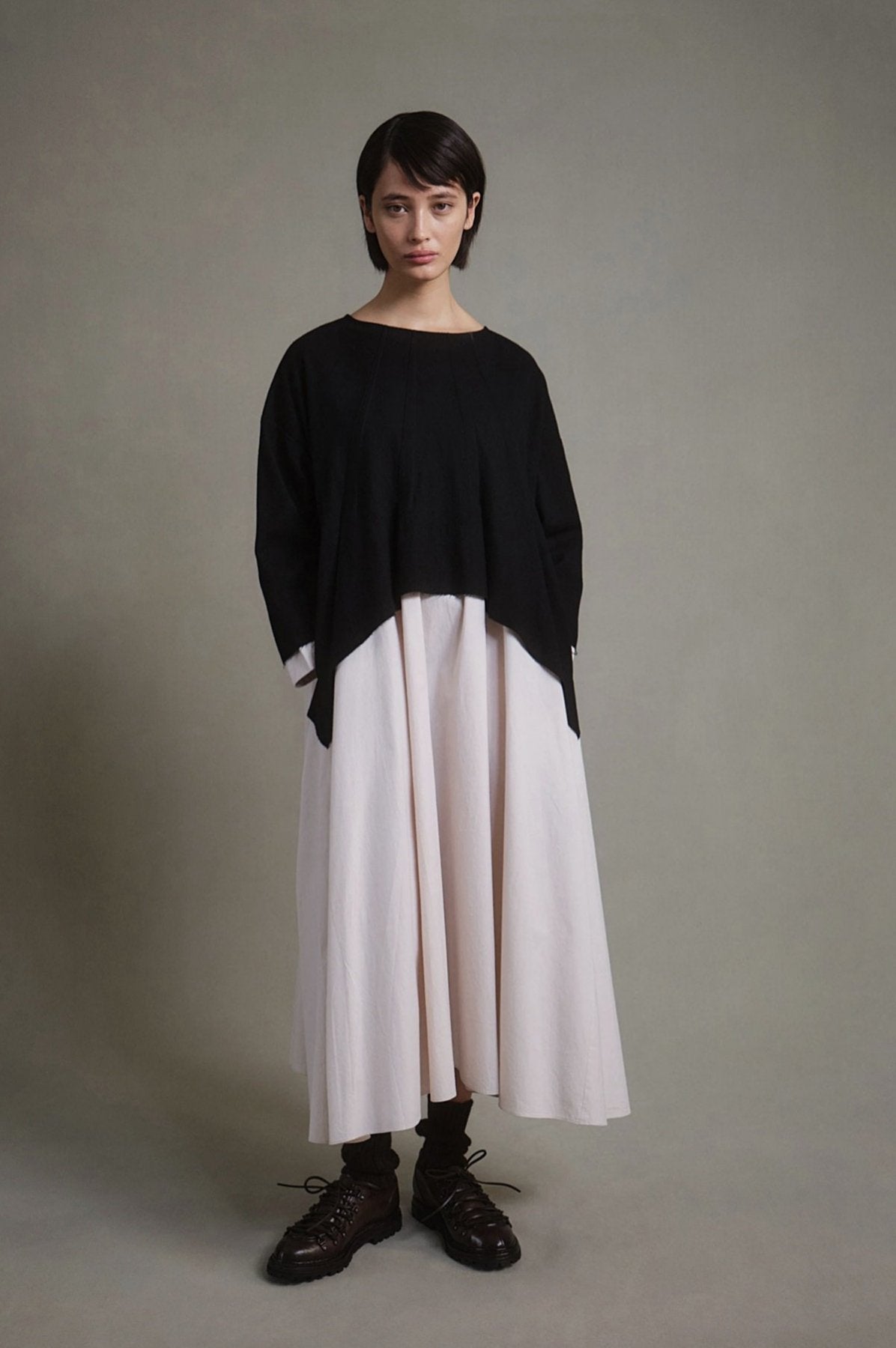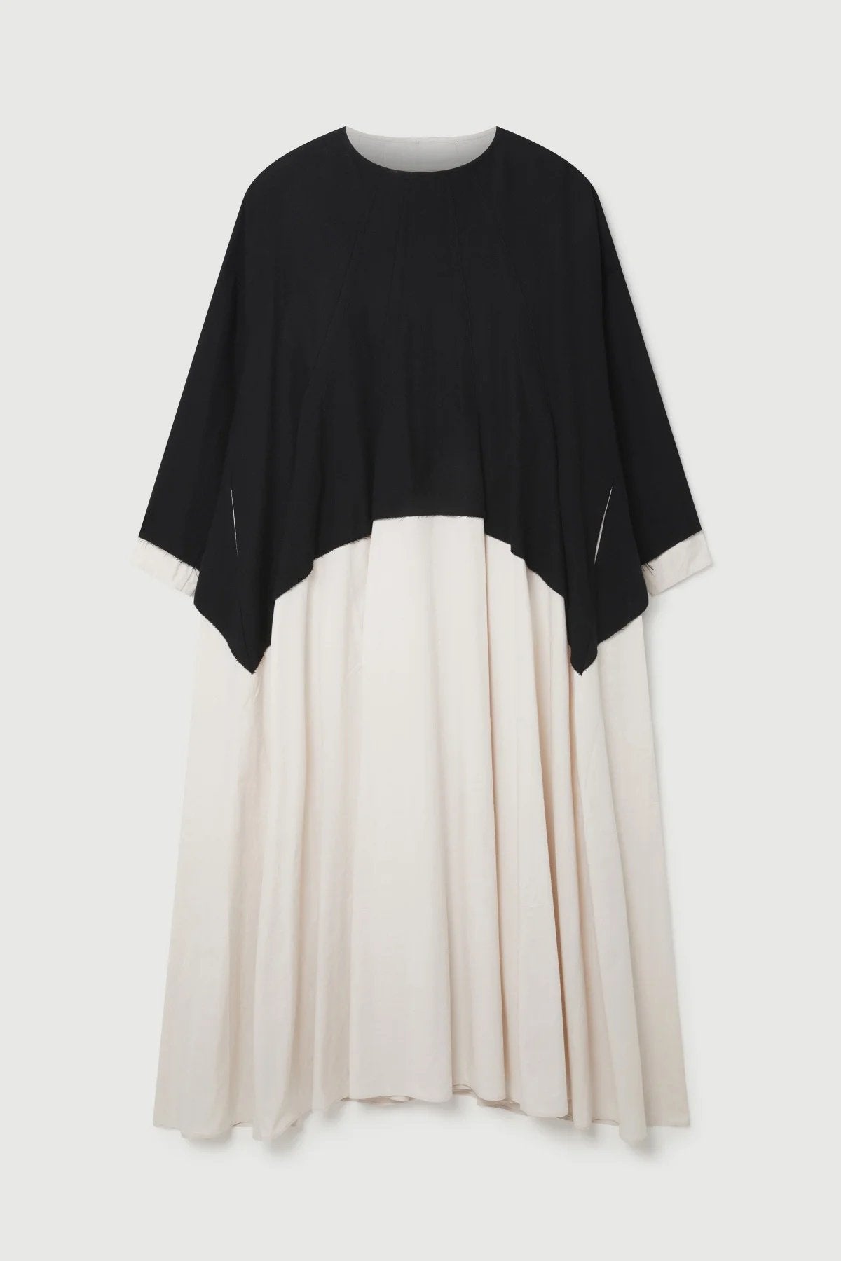このボリュームのある二重構造のドレス、MOUNTAINEER DRESSは、滑らかなウールと、その下層の生のコットンシルクで作られています。