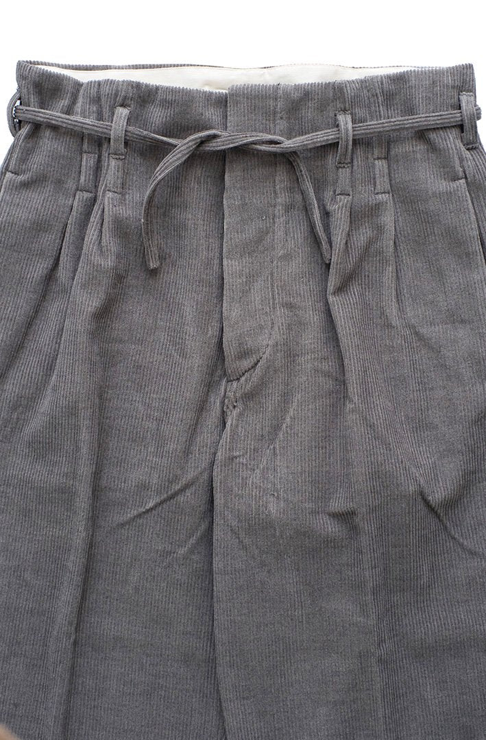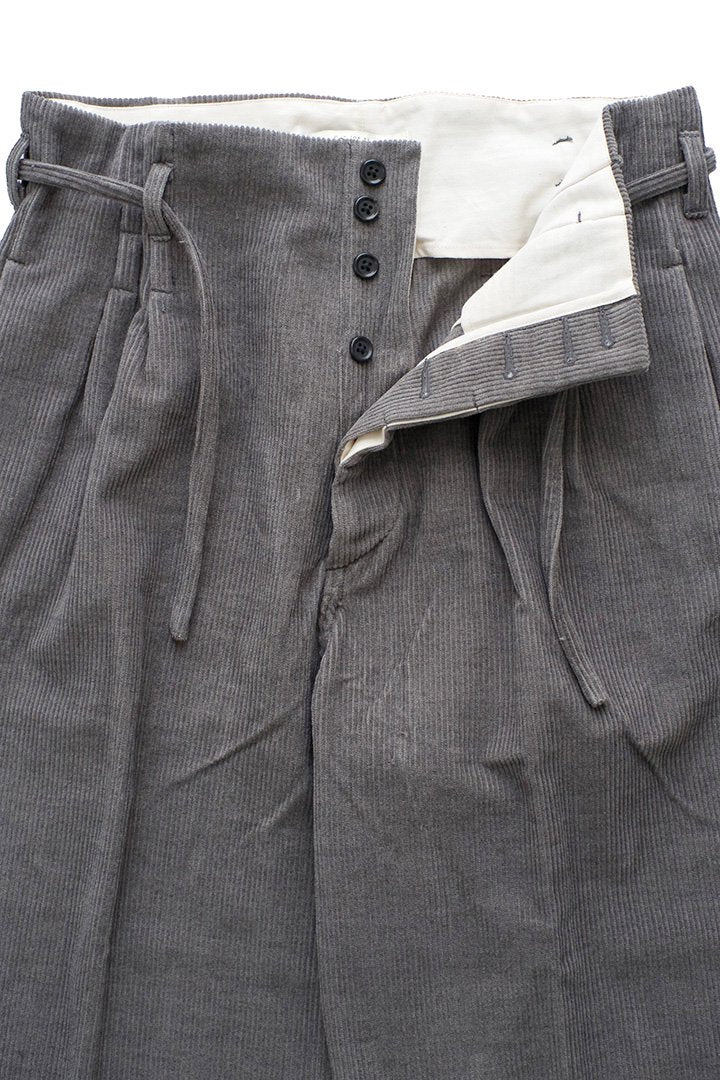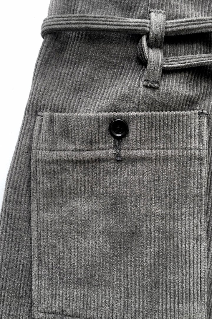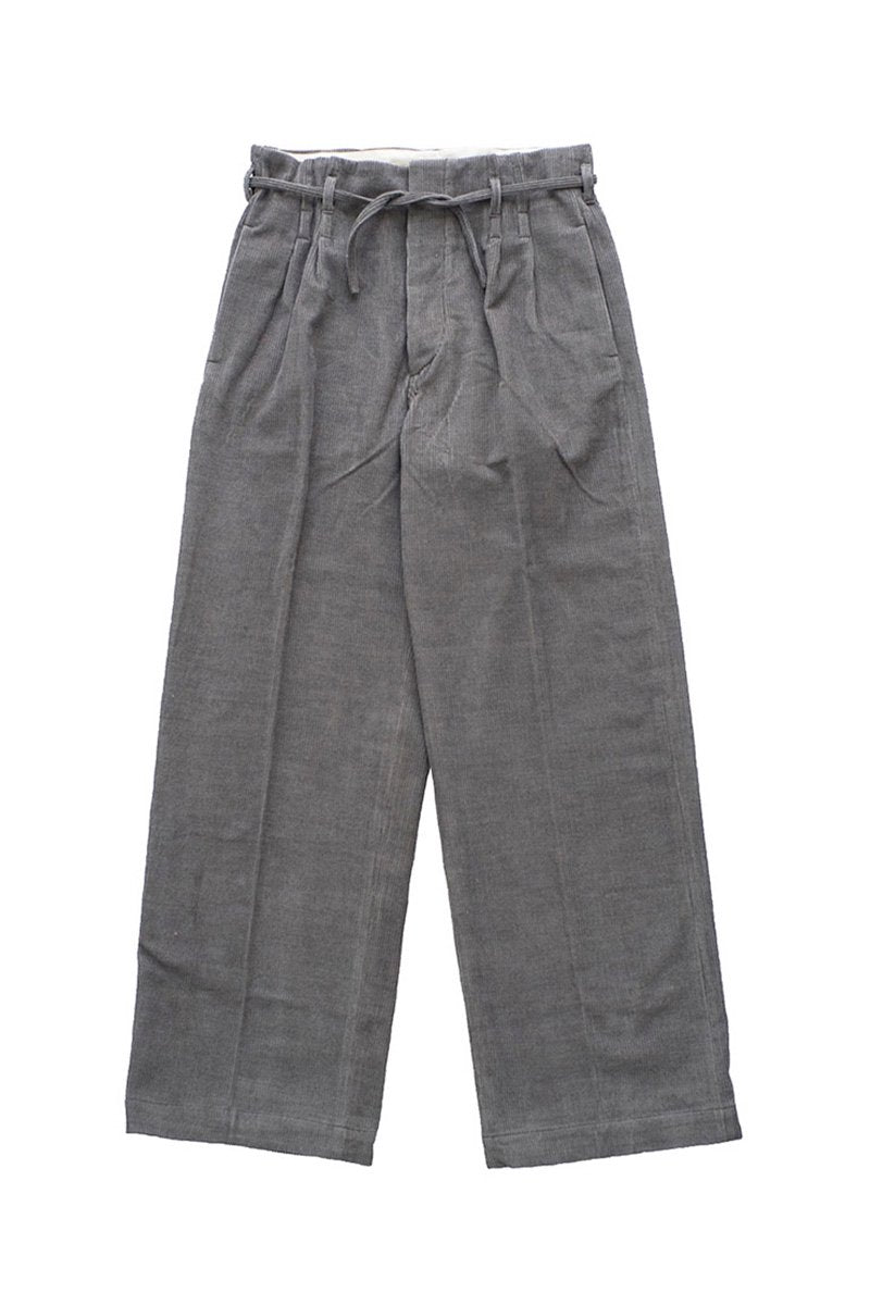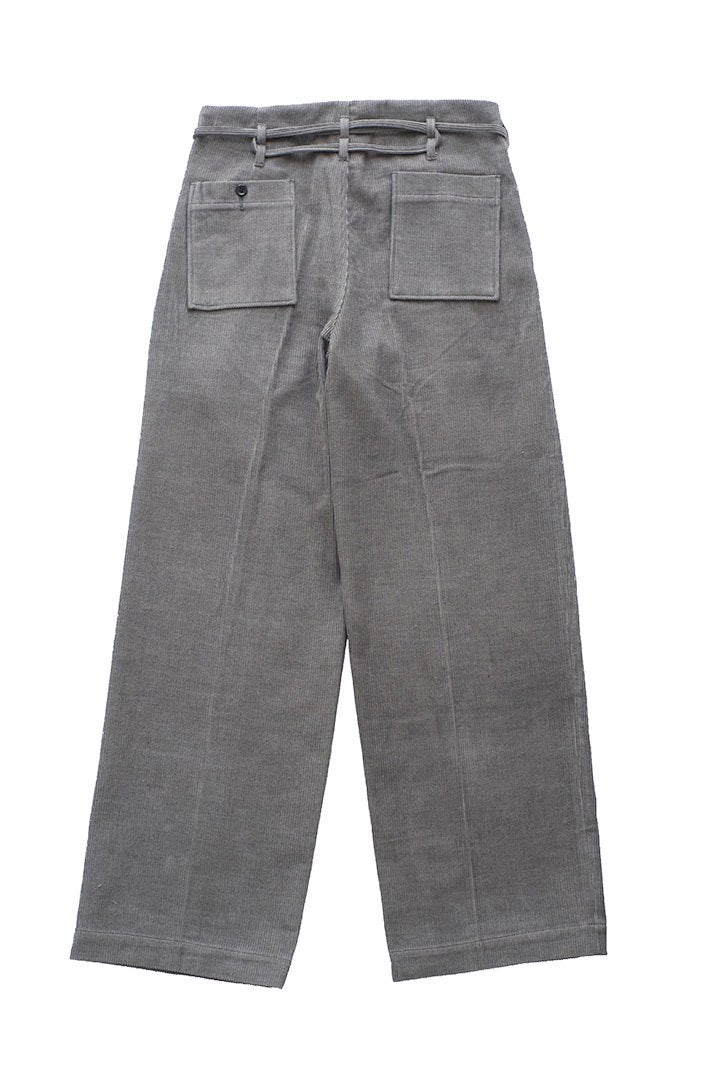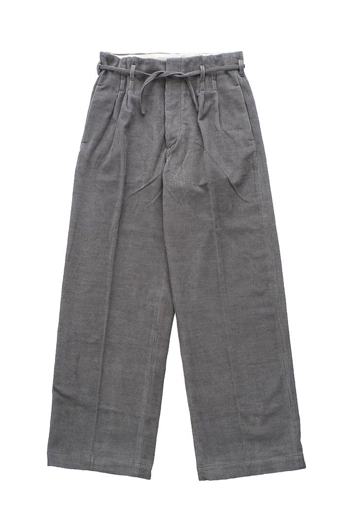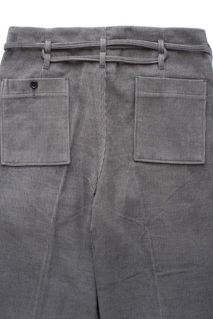 膝から裾にかけてズドンと落ちるラインと、ウエストで縛るディテールが特徴的なワイドトラウザー。 ウールとコットンをブレンドしたコーデュロイをパネルで染色し色の奥行き、ムラ感を表現。 マスキュリンなシルエットと最高に上品な素材感を楽しみたい。