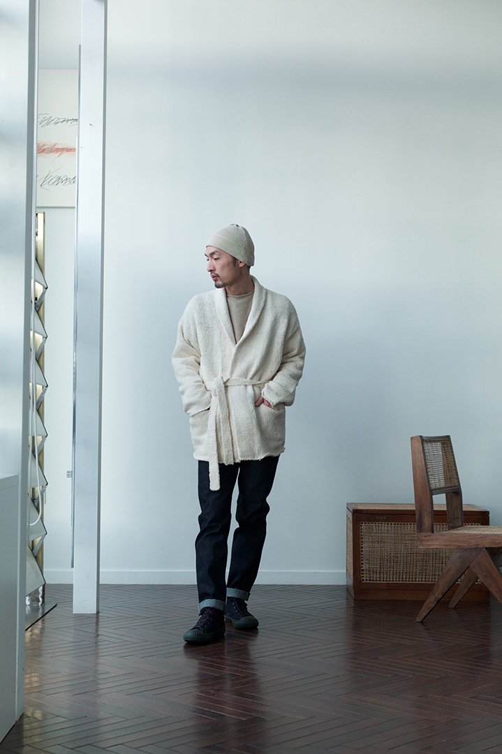 インド産の手紡ぎ糸は、とても粗野感とネップがありビンテージのような着古した感を持っています。 またボタンレスにデザインされたフロントはコーディネートの幅を広げてくれます。 クラシックにショールカラーにしても着ても良し、 ガウンのようにベルトでギュッと縛って着るのも良しな自由度の高い1着。