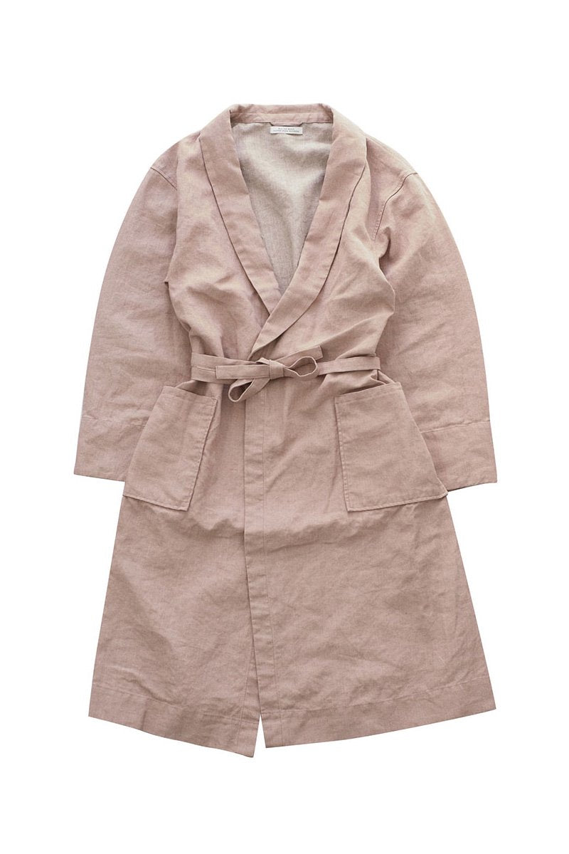 ミッドセンチュリー期のブリティッシュアーミーのプロダクトからインスパイアされて制作されたスプリングコート。 マキシレングスにショールカラーにもスタンドカラーにもなる襟が特徴的。 またフロントにレイアウトされた紐をぐるっと回してウエストをマークして着用すると、 とても軍物とは思えないエレガントな雰囲気に。 また用いた生地はヨーロッパの古い時代の生地から着想を得て企画、制作された 40番単糸で織り上げたの平織リネンにプリントされた特殊な顔料(ペンキ)が、 着込んでいくにつれて薄くなって味わい深くなるのがとても楽しみです。