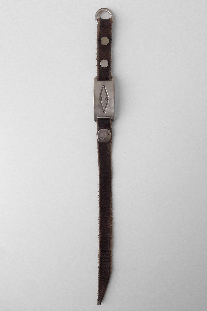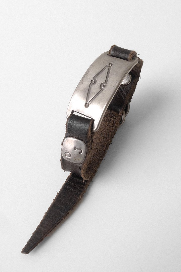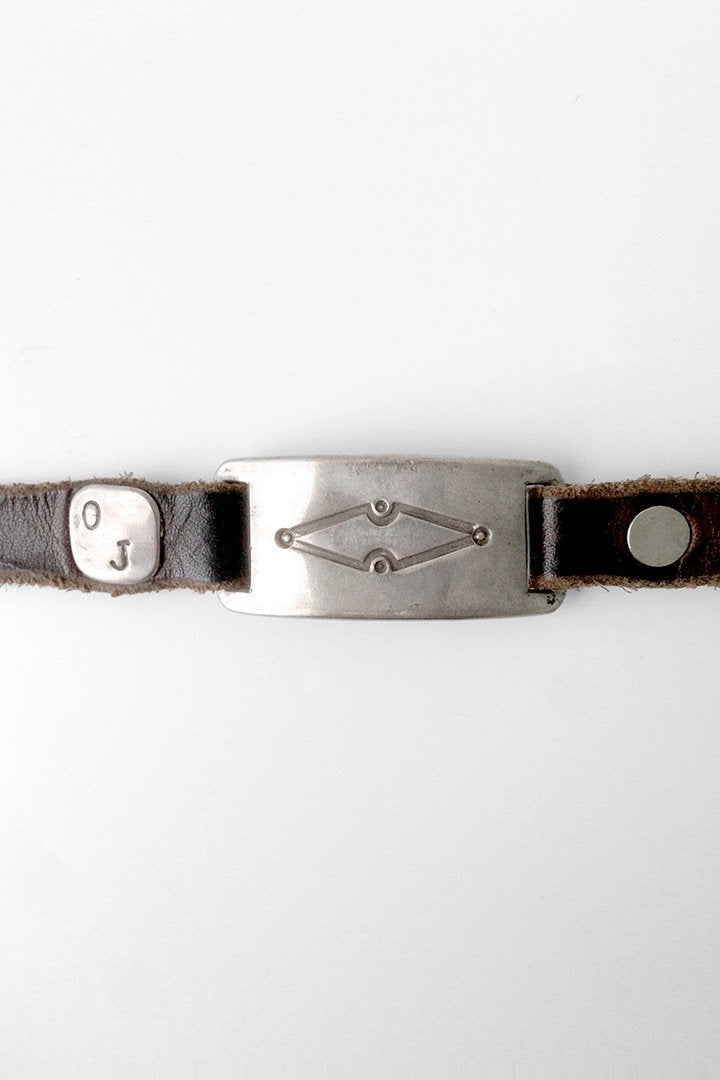 シルバー × 牛革のコンビブレスレット。シルバープレート、レザーパーツなど全て手作業で1点1点仕上げる為、形や色に同じ物が存在しない。スタンププレートの裏面に彫られているマークはジャックウォーカーのWと彼のトレードマークでもある月と太陽を表している。