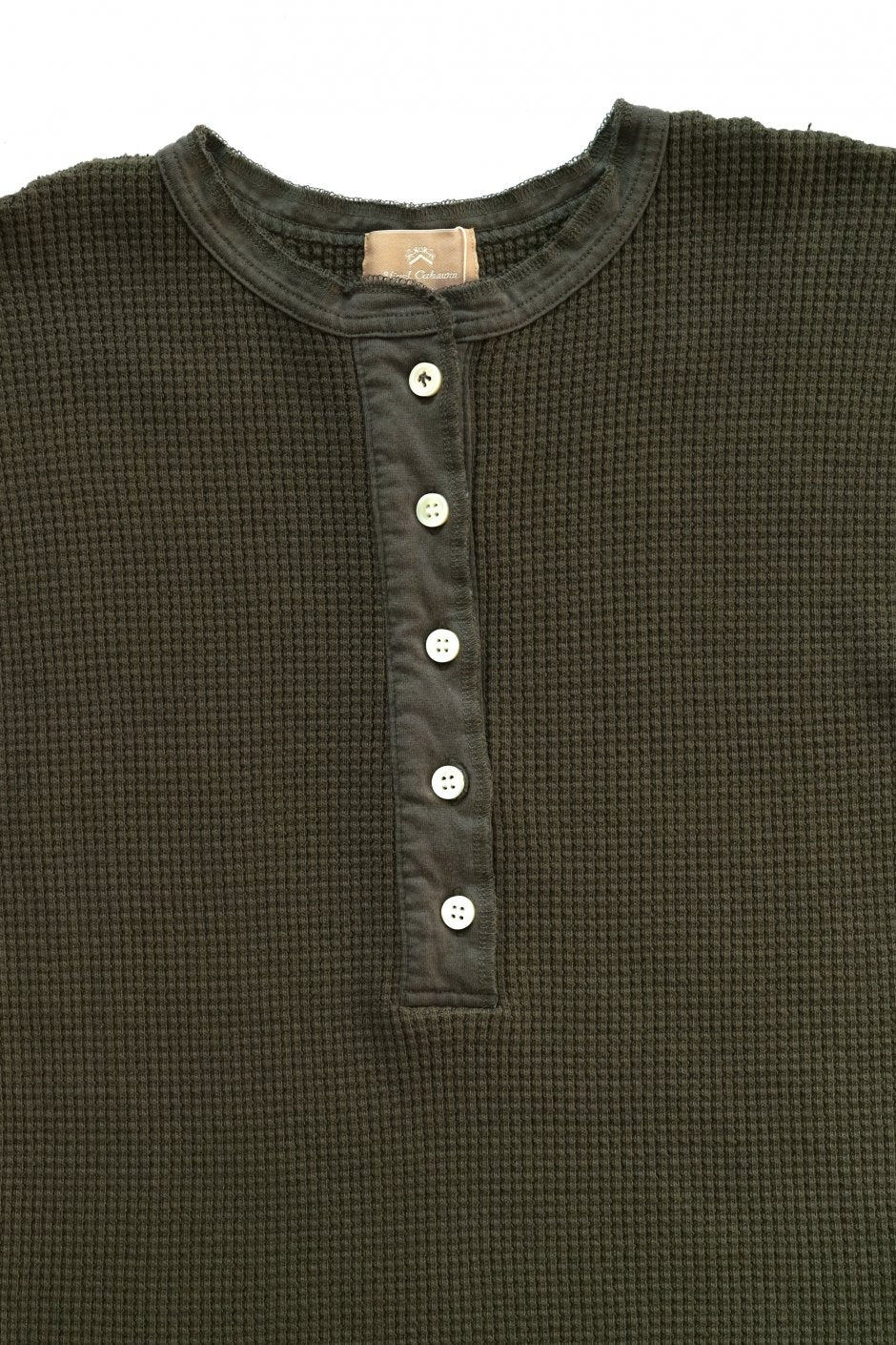 身頃続きのフレンチスリーブ、前後差が大胆に違うラウンドヘムが特徴のヘンリーネッ ク T シャツです。一番上のボタンは通した糸でブロードアローを表現。軍用品であることを示すブロード アローがブランドらしい本アイテムは、カジュアルのみならず、きれいめな着こなしもで きる万能なトップスです。