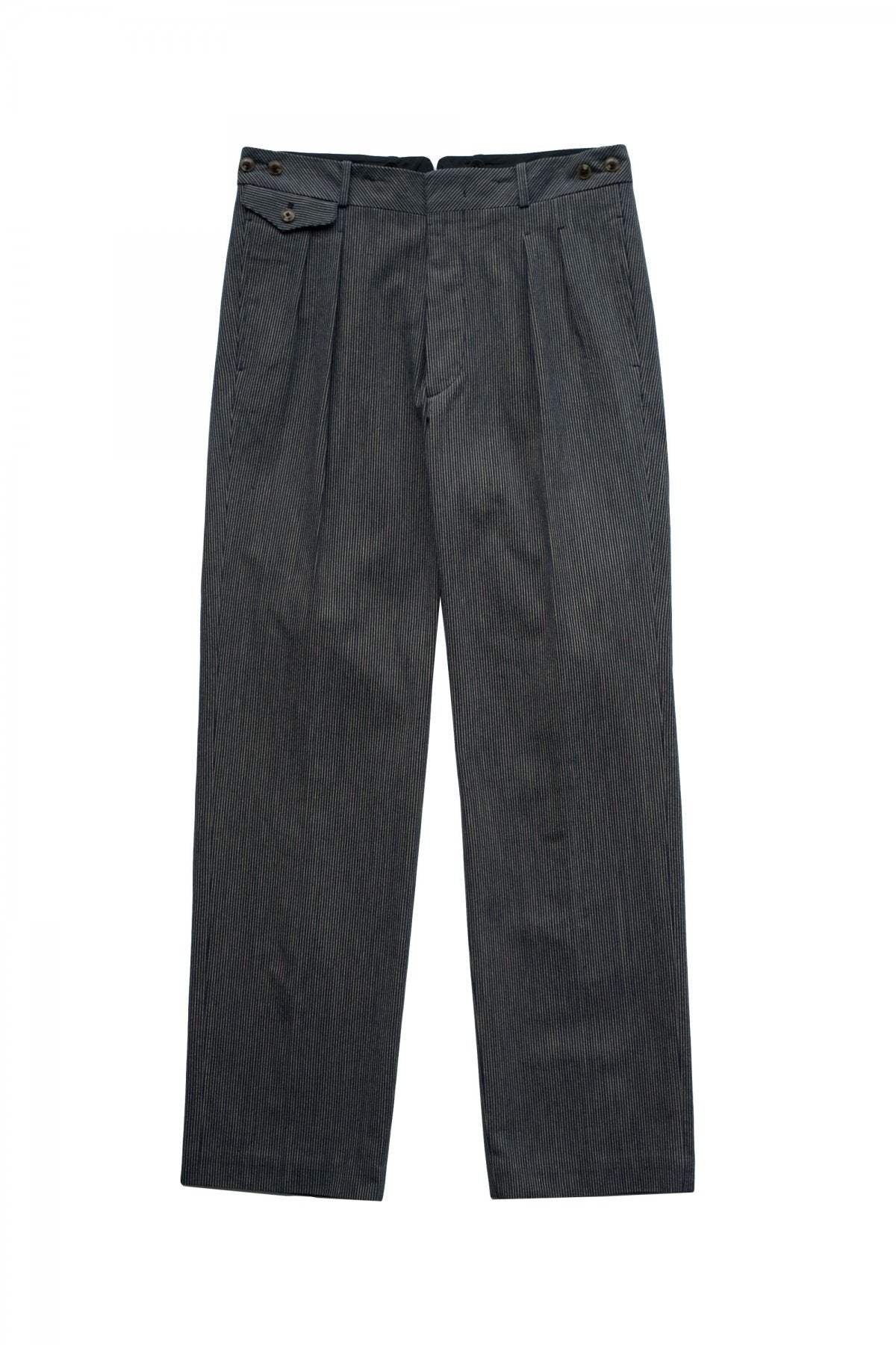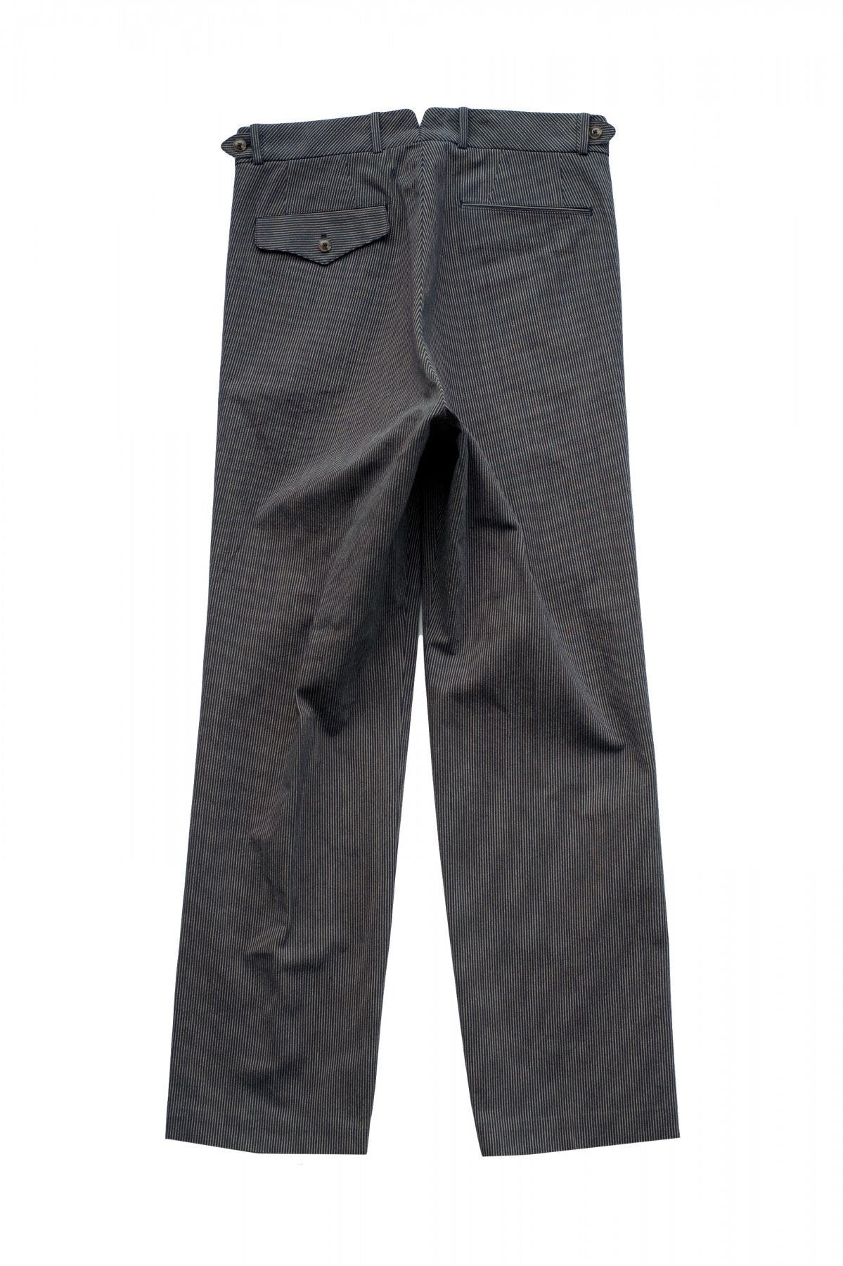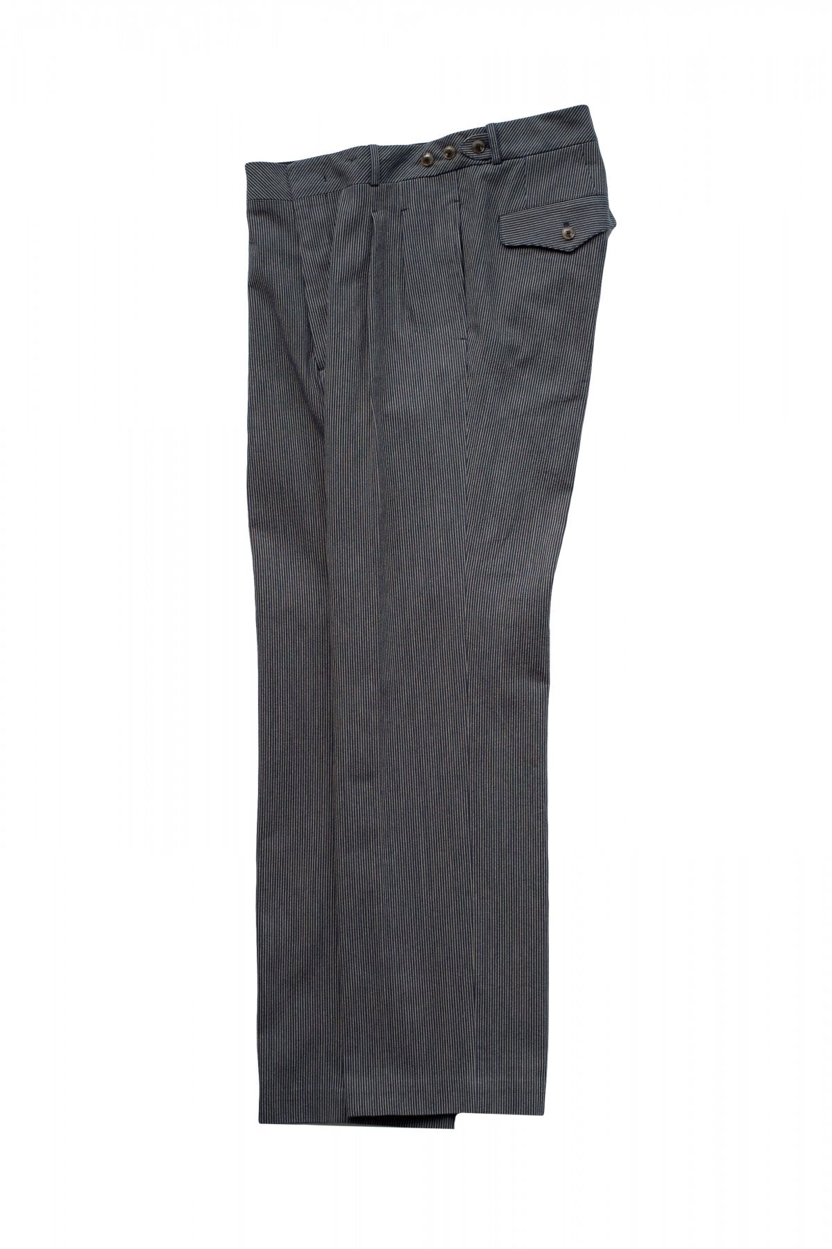 DOUBLE -BREASTED SWING JACKETと合わせになる 新型のワイドフィットのトラウザー。 深い股上とゆとりを持たせたヒップ周り、そこから少しだけテーパードしながら 裾まで直線的に落ちるシルエットは、とてもエレガントです。 ウエストは広めの設定になっていますので、ヒップハングも可能ですし、 サスペンダーで吊るして履くと綺麗なラインが完成します。