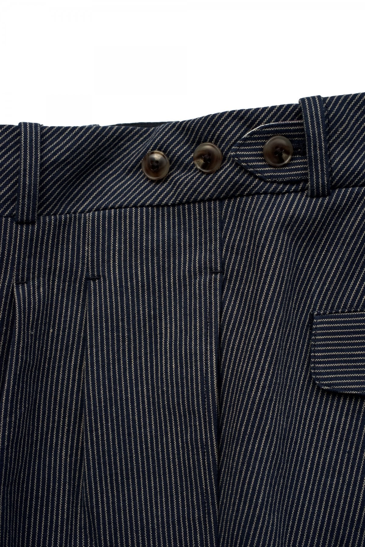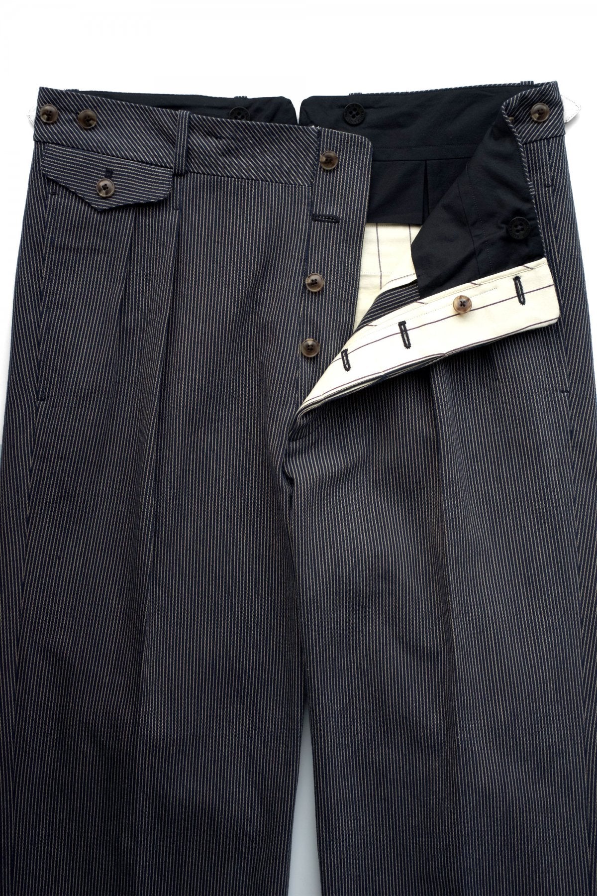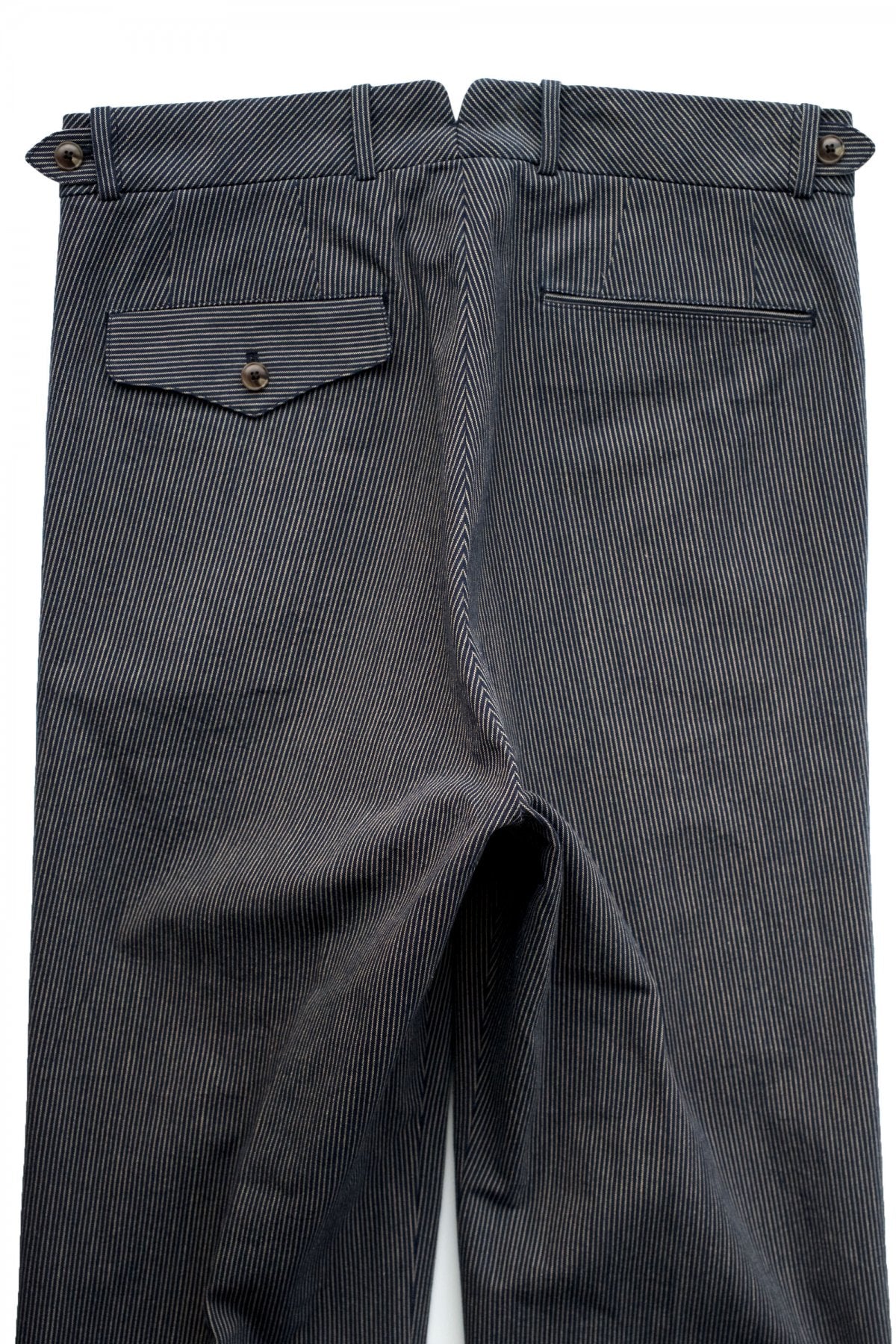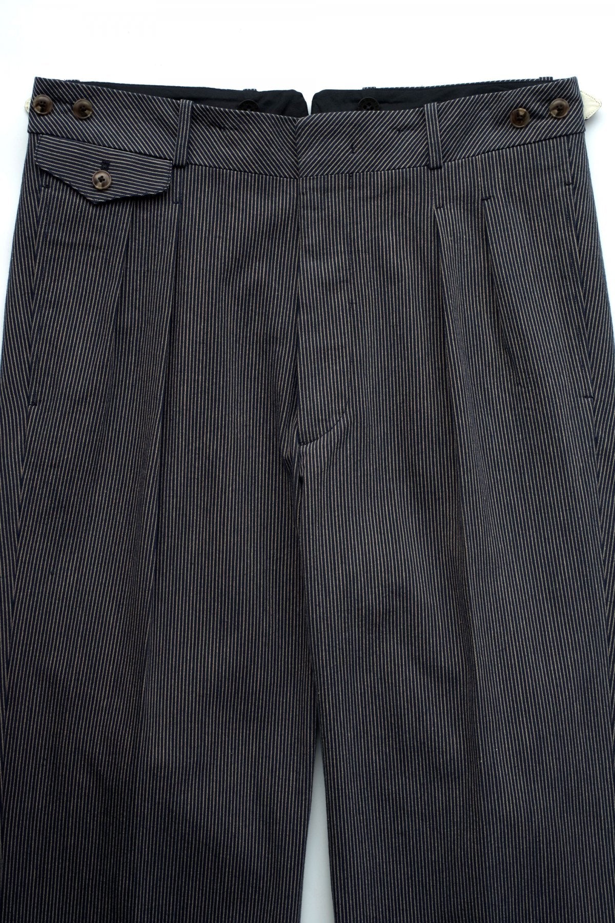 DOUBLE -BREASTED SWING JACKETと合わせになる 新型のワイドフィットのトラウザー。 深い股上とゆとりを持たせたヒップ周り、そこから少しだけテーパードしながら 裾まで直線的に落ちるシルエットは、とてもエレガントです。 ウエストは広めの設定になっていますので、ヒップハングも可能ですし、 サスペンダーで吊るして履くと綺麗なラインが完成します。