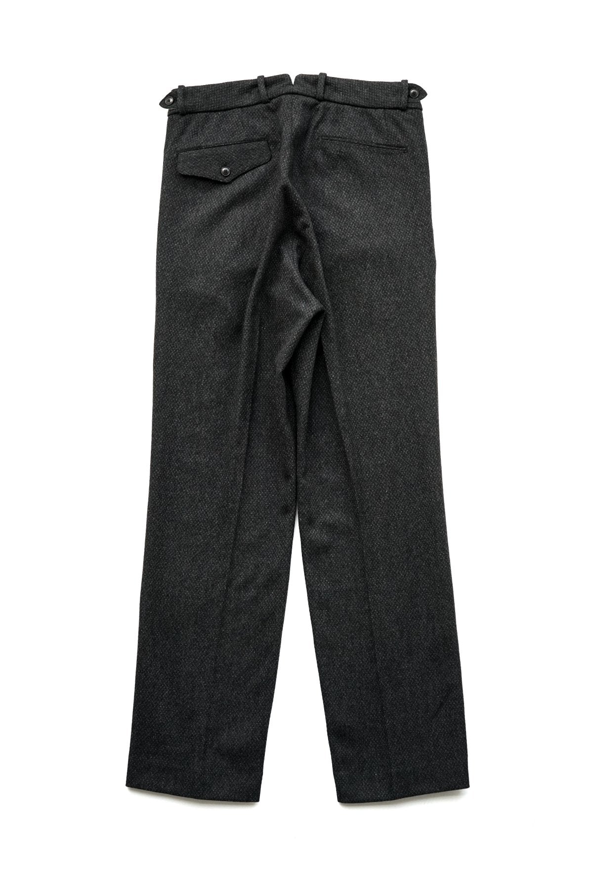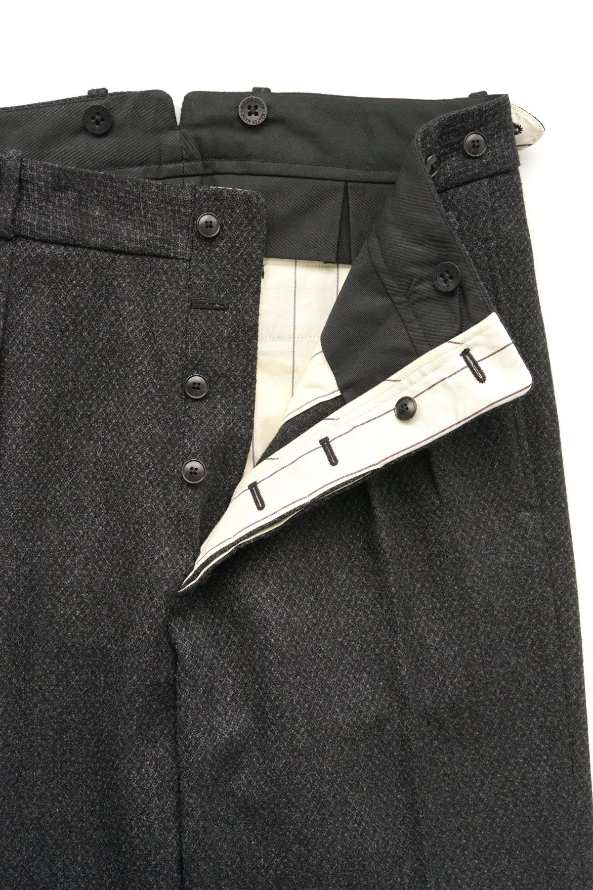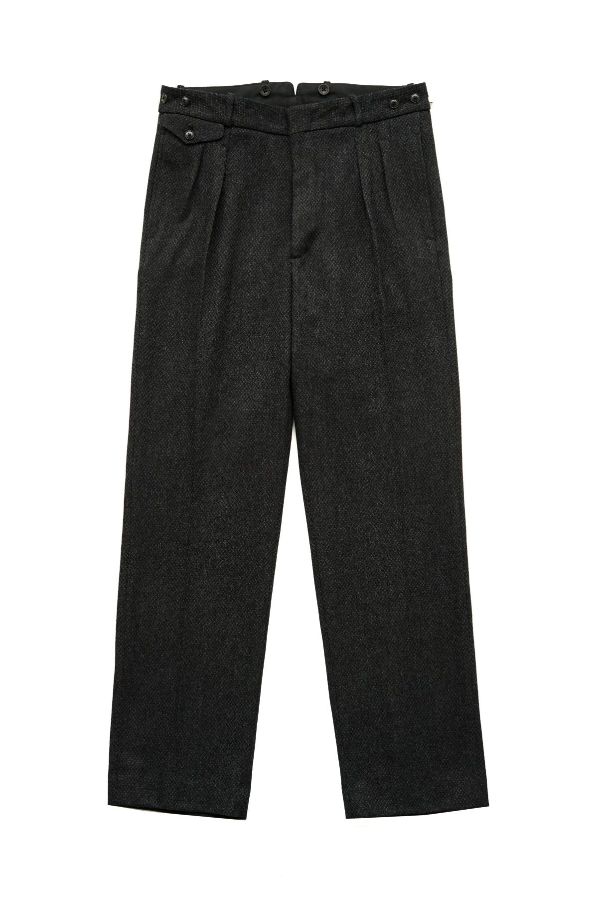 DOUBLE -BREASTED SWING JACKETと合わせになる 新型のワイドフィットのトラウザー。 深い股上とゆとりを持たせたヒップ周り、そこから少しだけテーパードしながら 裾まで直線的に落ちるシルエットは、とてもエレガントです。 ウエストは広めの設定になっていますので、ヒップハングも可能ですし、 サスペンダーで吊るして履くと綺麗なラインが完成します。