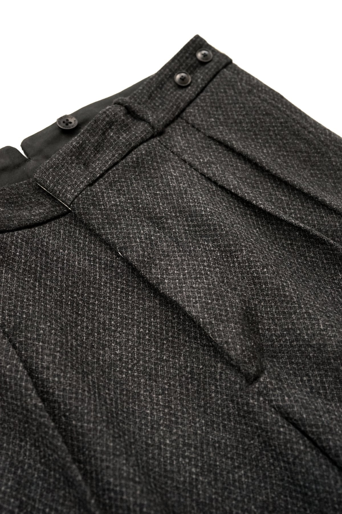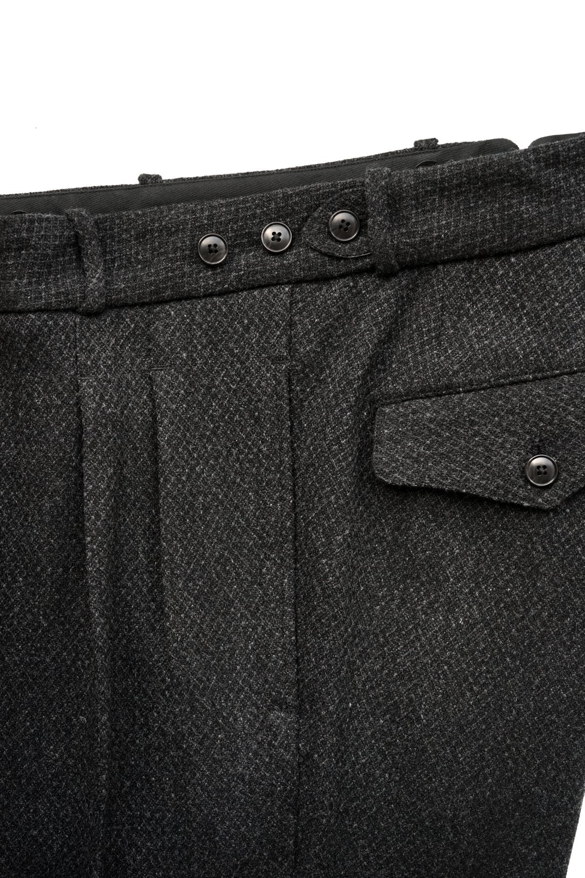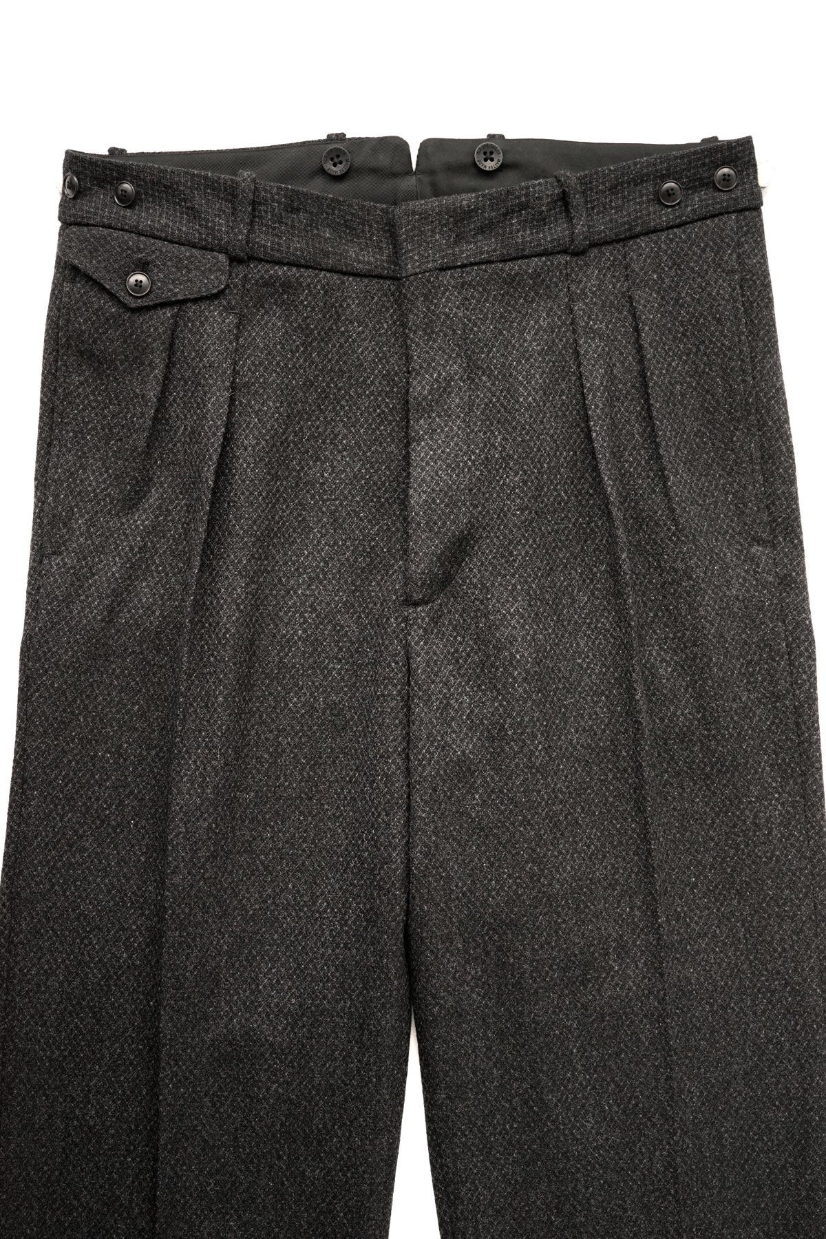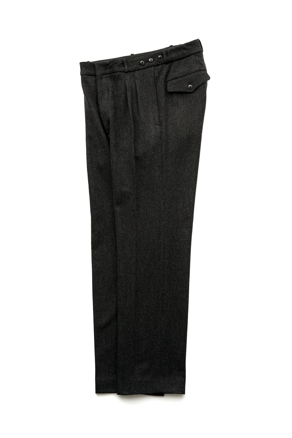 DOUBLE -BREASTED SWING JACKETと合わせになる 新型のワイドフィットのトラウザー。 深い股上とゆとりを持たせたヒップ周り、そこから少しだけテーパードしながら 裾まで直線的に落ちるシルエットは、とてもエレガントです。 ウエストは広めの設定になっていますので、ヒップハングも可能ですし、 サスペンダーで吊るして履くと綺麗なラインが完成します。