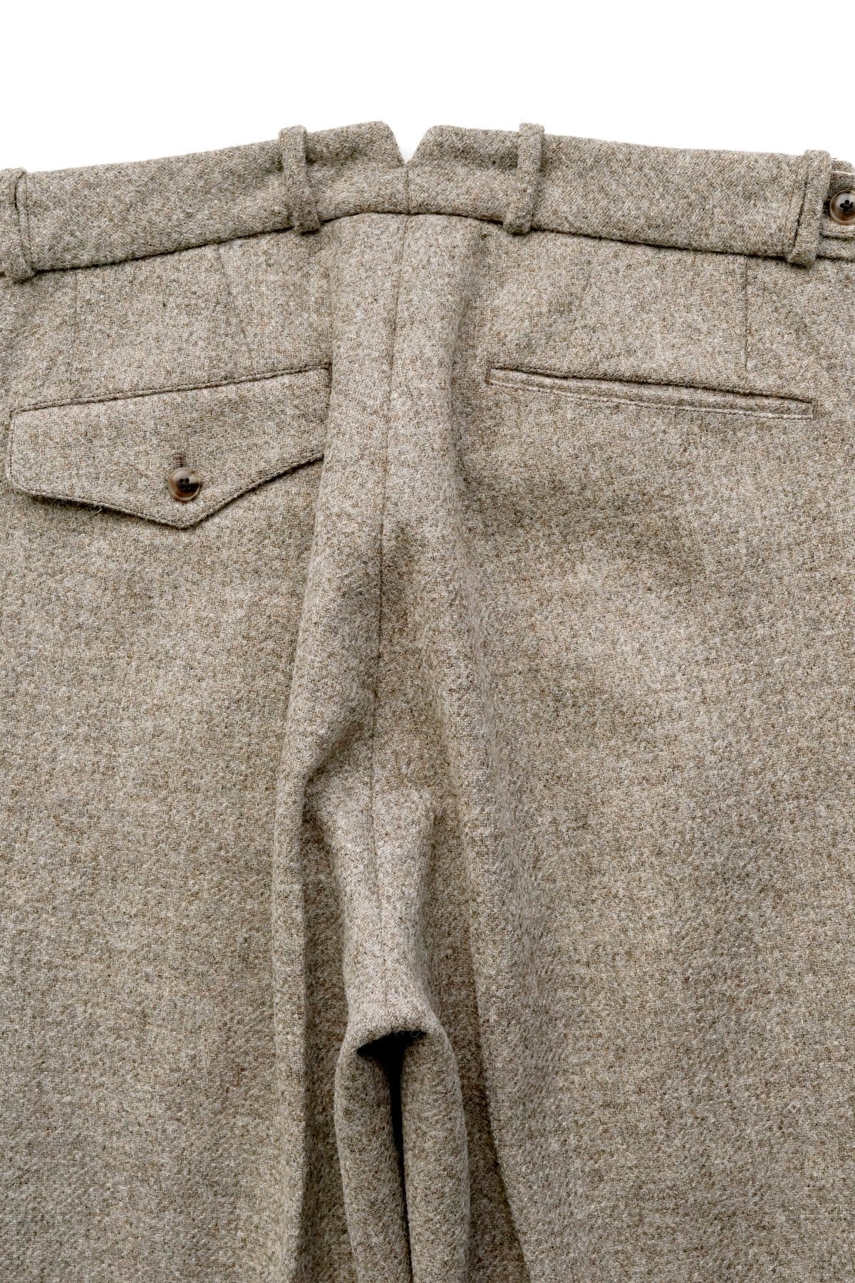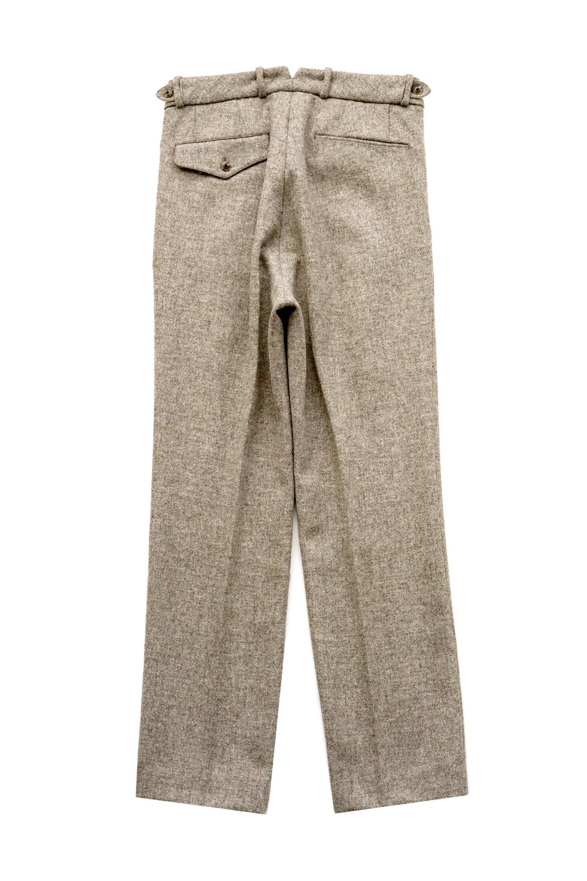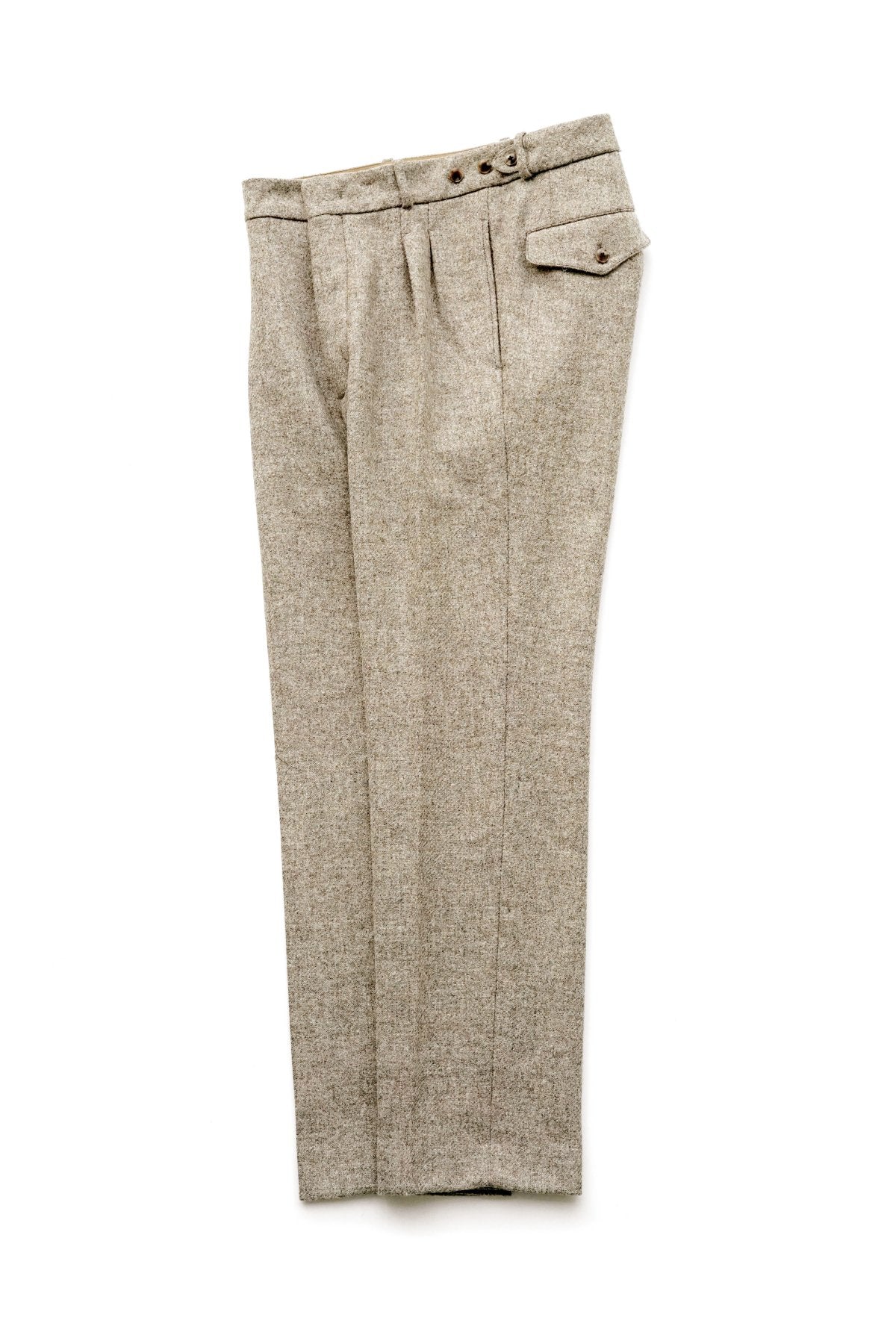 DOUBLE -BREASTED SWING JACKETと合わせになる 新型のワイドフィットのトラウザー。 深い股上とゆとりを持たせたヒップ周り、そこから少しだけテーパードしながら 裾まで直線的に落ちるシルエットは、とてもエレガントです。 ウエストは広めの設定になっていますので、ヒップハングも可能ですし、 サスペンダーで吊るして履くと綺麗なラインが完成します。