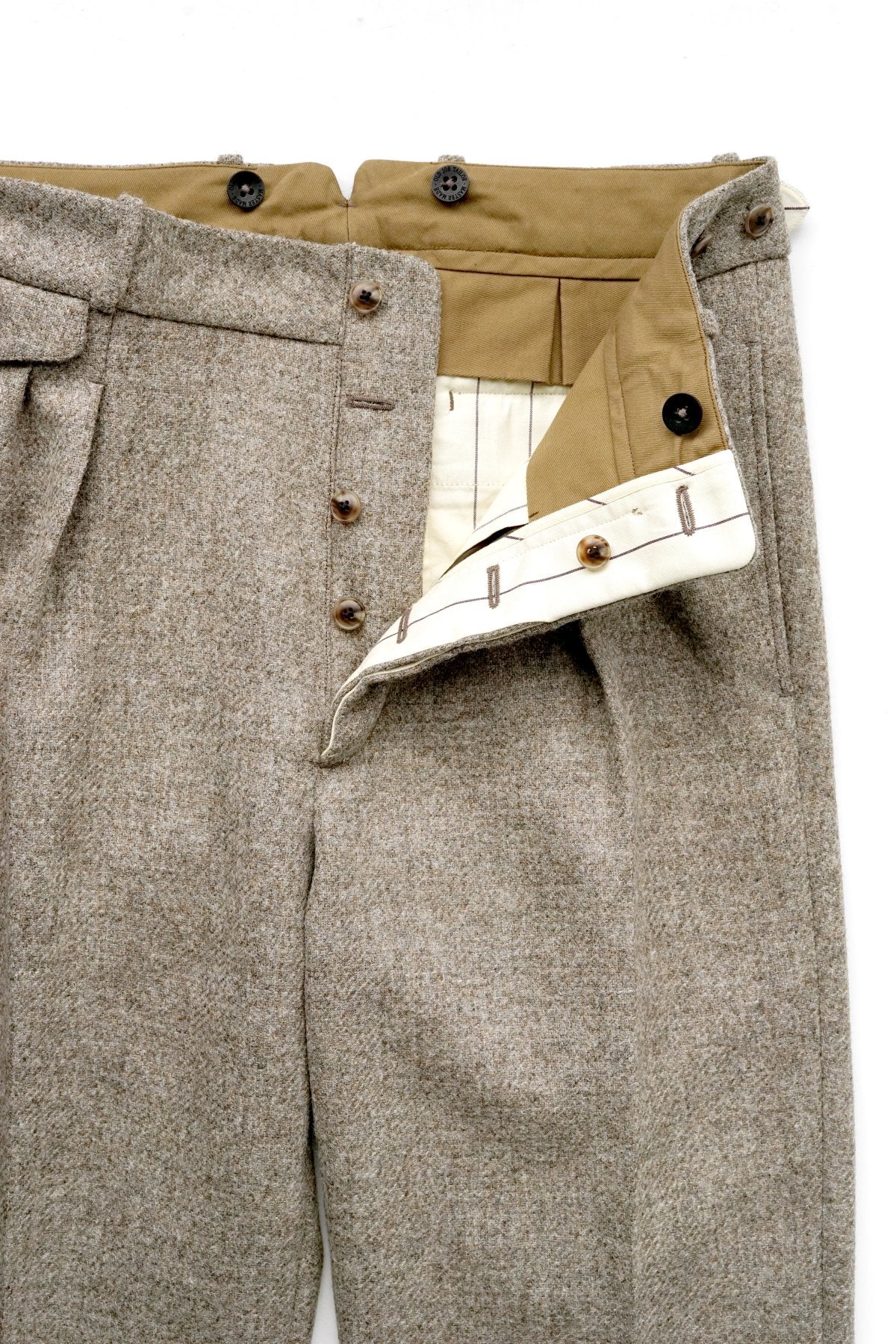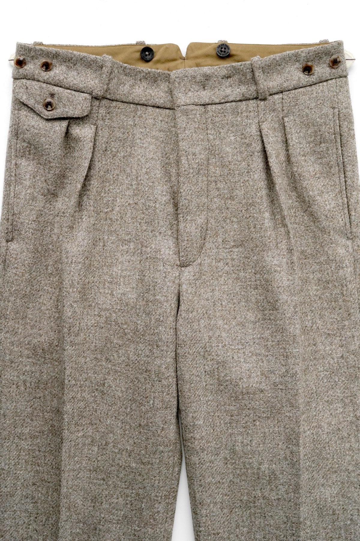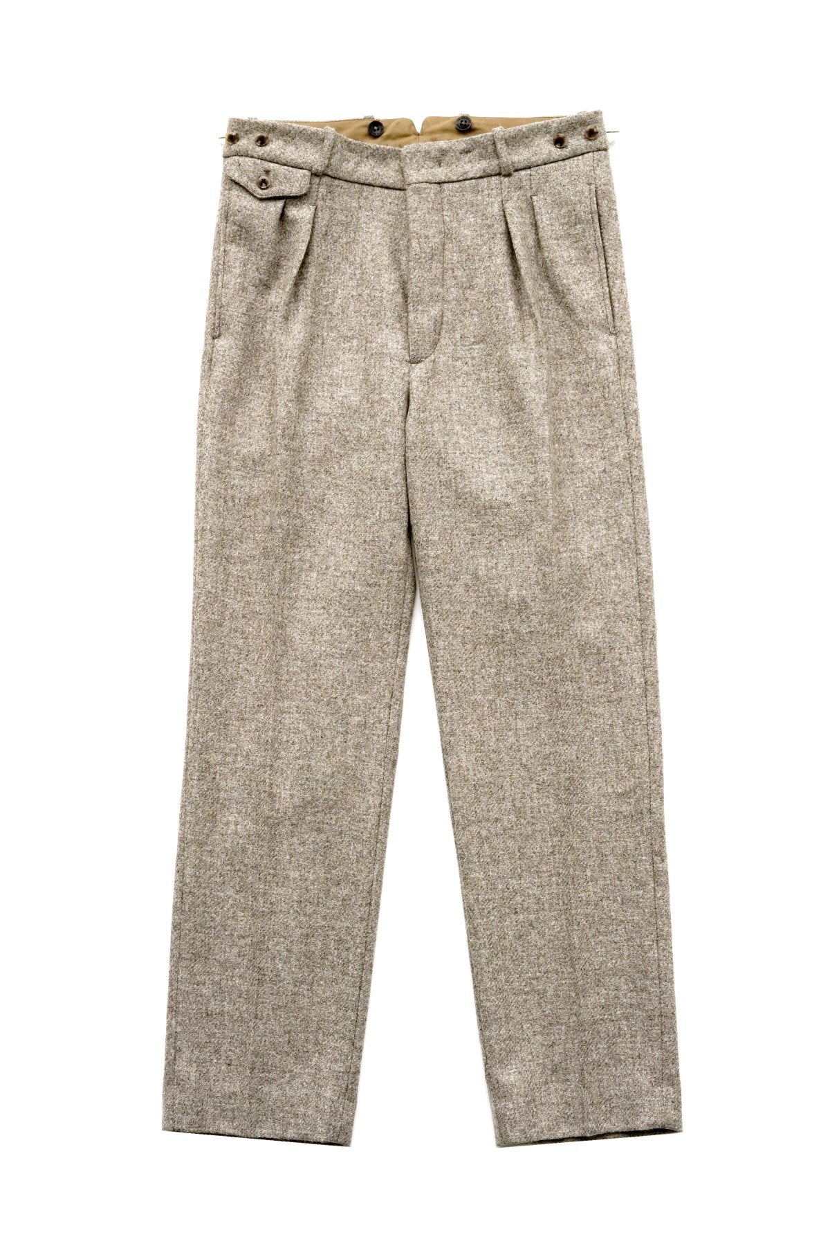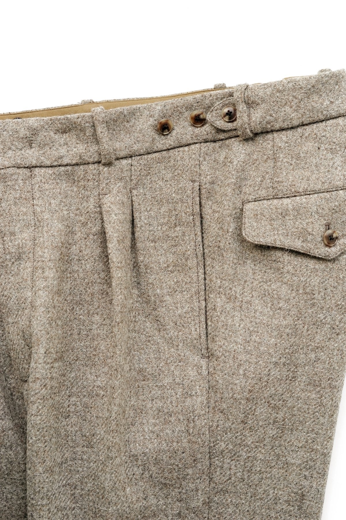 DOUBLE -BREASTED SWING JACKETと合わせになる 新型のワイドフィットのトラウザー。 深い股上とゆとりを持たせたヒップ周り、そこから少しだけテーパードしながら 裾まで直線的に落ちるシルエットは、とてもエレガントです。 ウエストは広めの設定になっていますので、ヒップハングも可能ですし、 サスペンダーで吊るして履くと綺麗なラインが完成します。