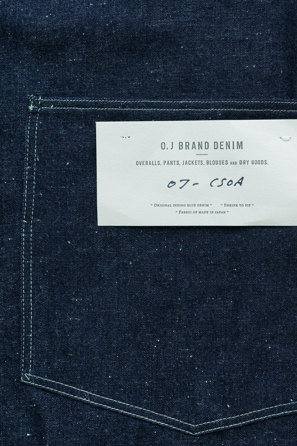 9.5オンスのアメリカンコットンの糸とネップヤーンで織り上げた2/1の綾のワークデニム。(緯糸の見え方の少ないカバーオール、ペインターパンツなどに使用されるデニム) 濃インディゴとくすんだ緯糸はカジュアル過ぎない印象。
