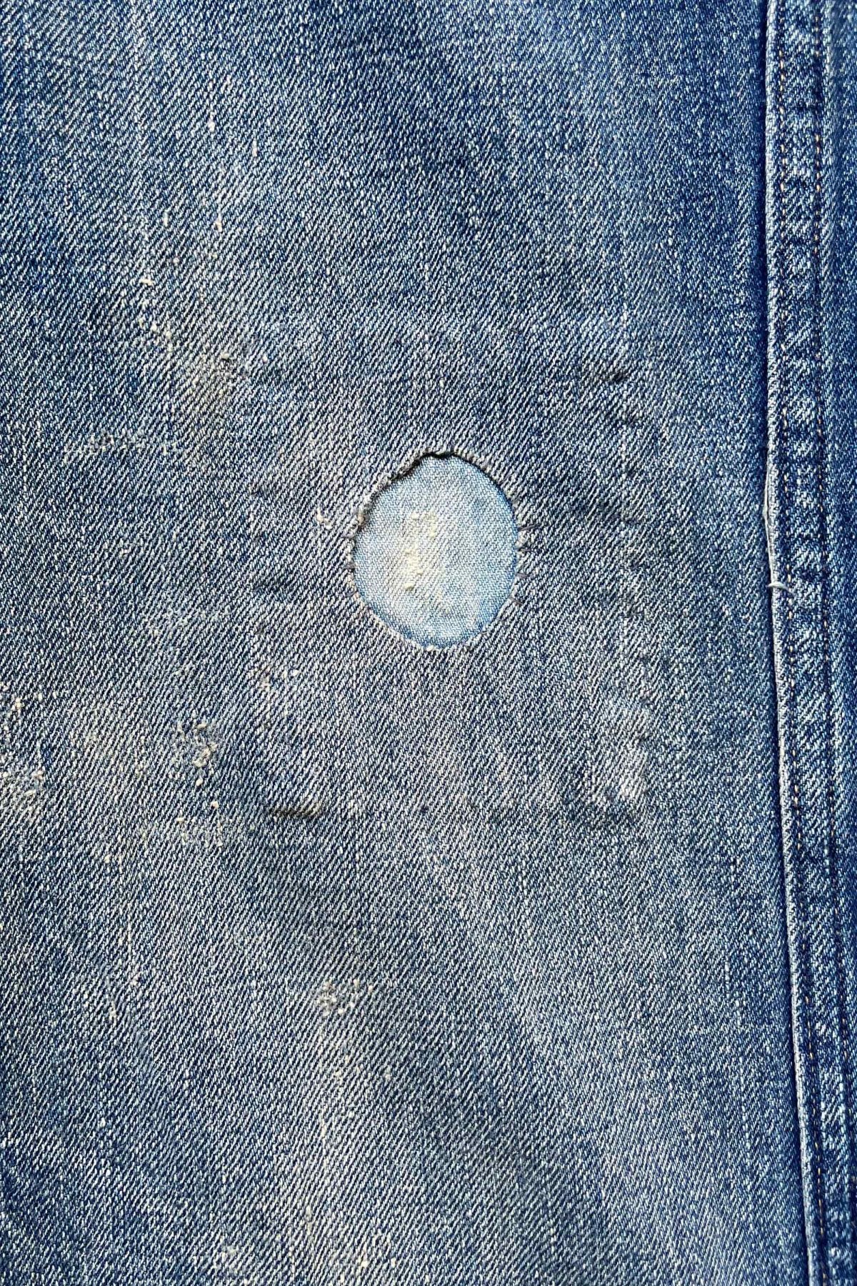 ランチジャケットとフェイドの具合を合わせて、セットアップで提案されるジーンズ。ハンドエイジング、リメイク、リペアは一点一点時間を費やしてで行われ、その傷や補修跡をユニークなデザインとして再構築。