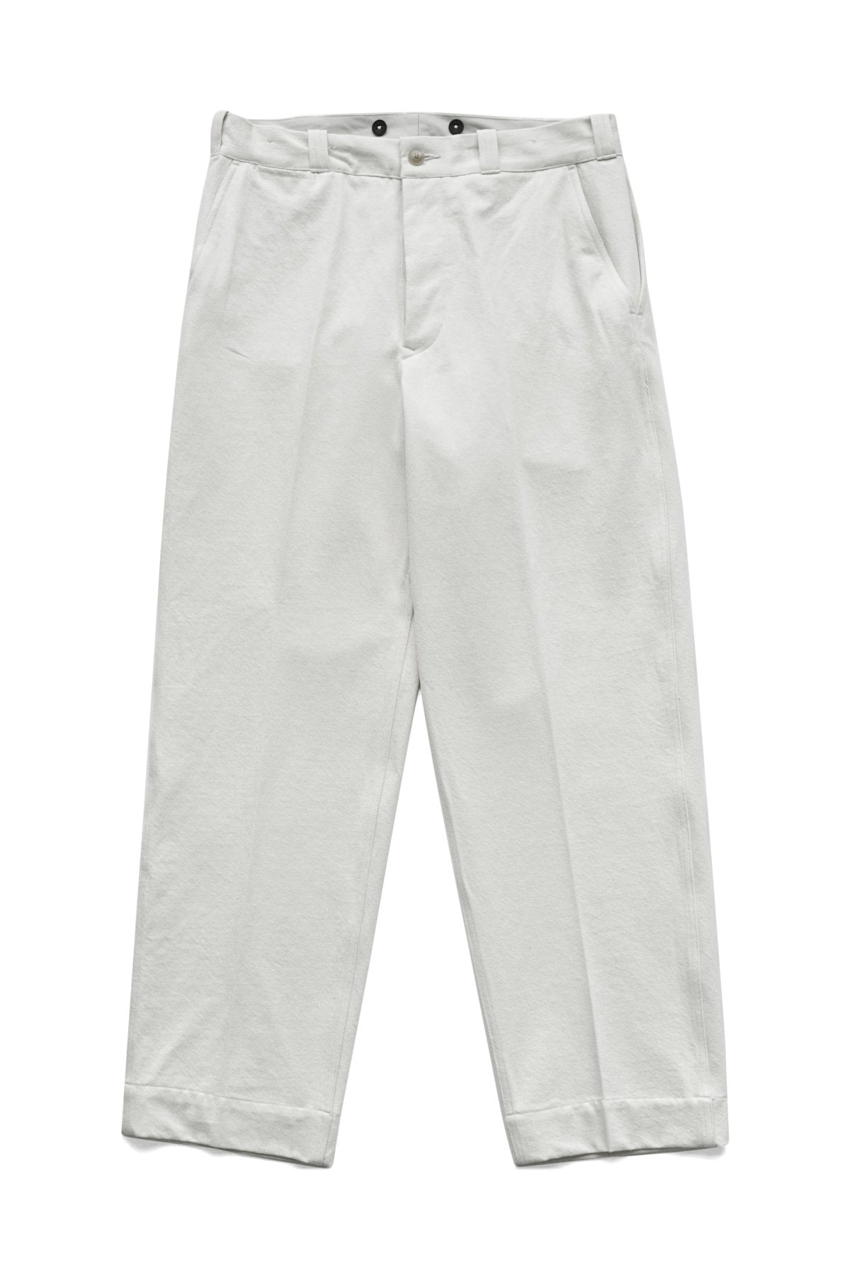 シグネチャーアイテムのスプリットポケットトラウザー。二部屋に配された脇ポケットは実用的でありながらクラシカル且つユニークな表情に。今季は生地の段階でハードに味だしされたカラーデニムを採用しています。
