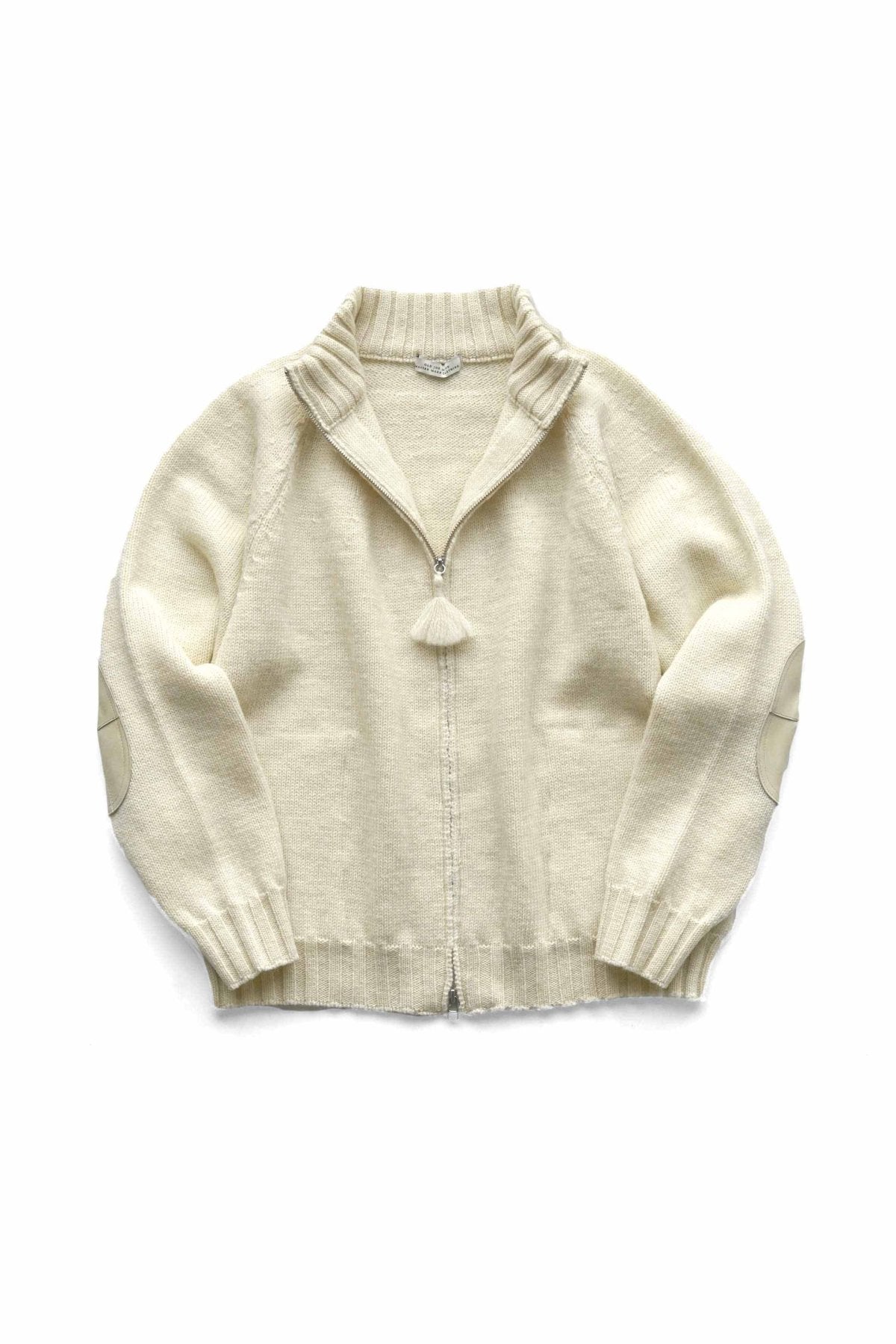 ブリティッシュツイードの糸を用いて編み立てたジップカーディ。 英国羊毛ならではのハリ感、膨らみ感が本物の雰囲気を盛り上げる。 また今季は天竺編みの求心に倣った減らしがユニーク。 またエルボーに配されたスエードパッチはノスタルジィな印象。
