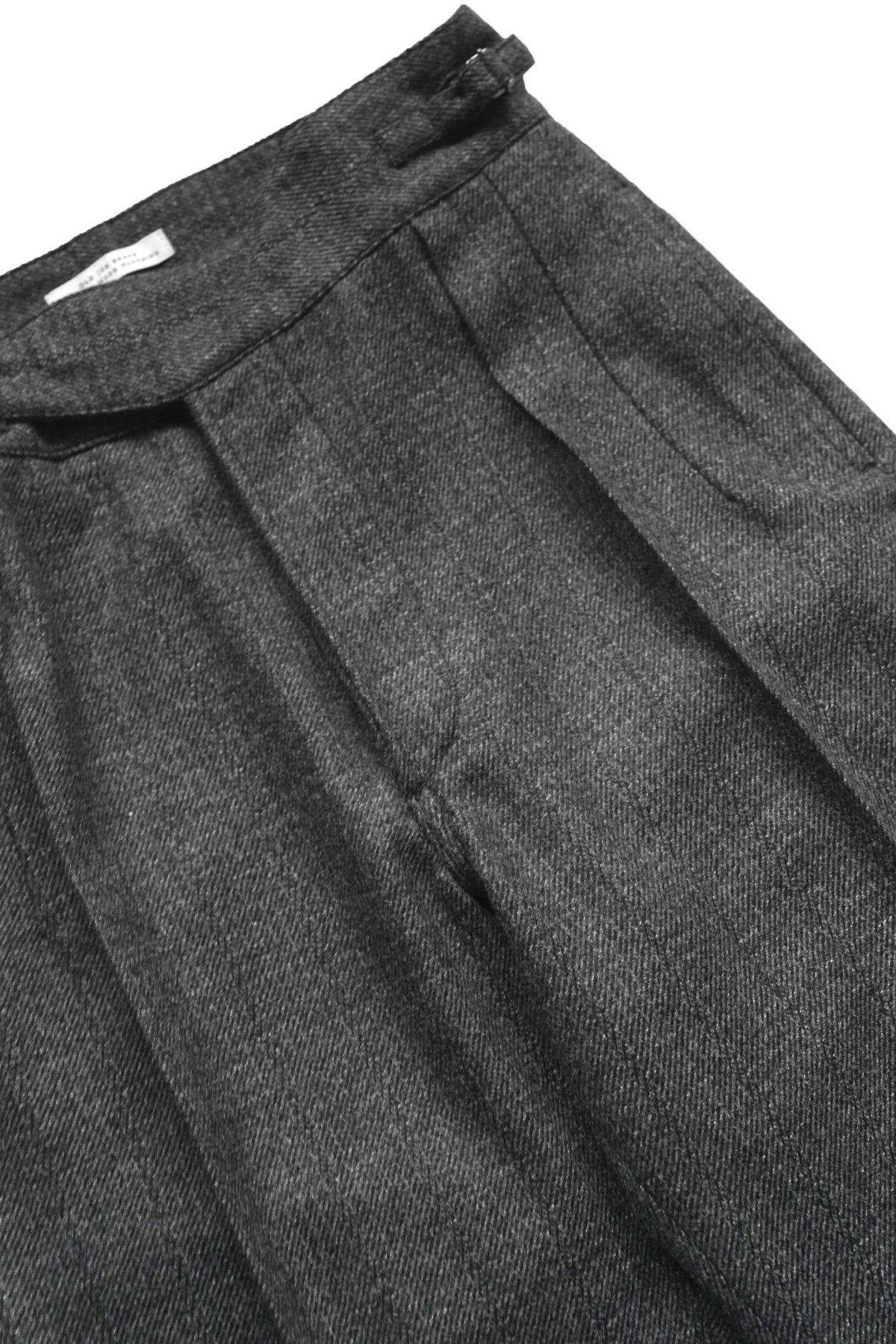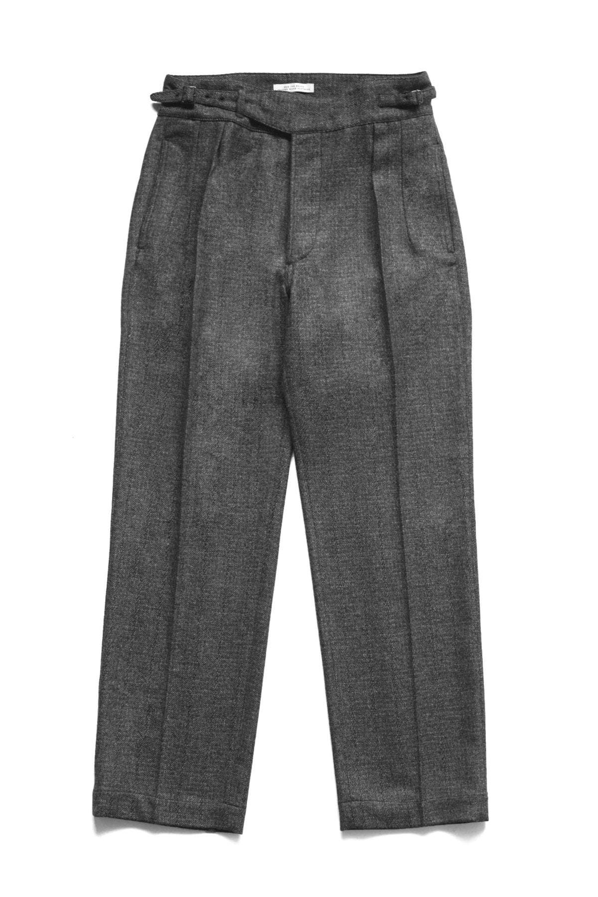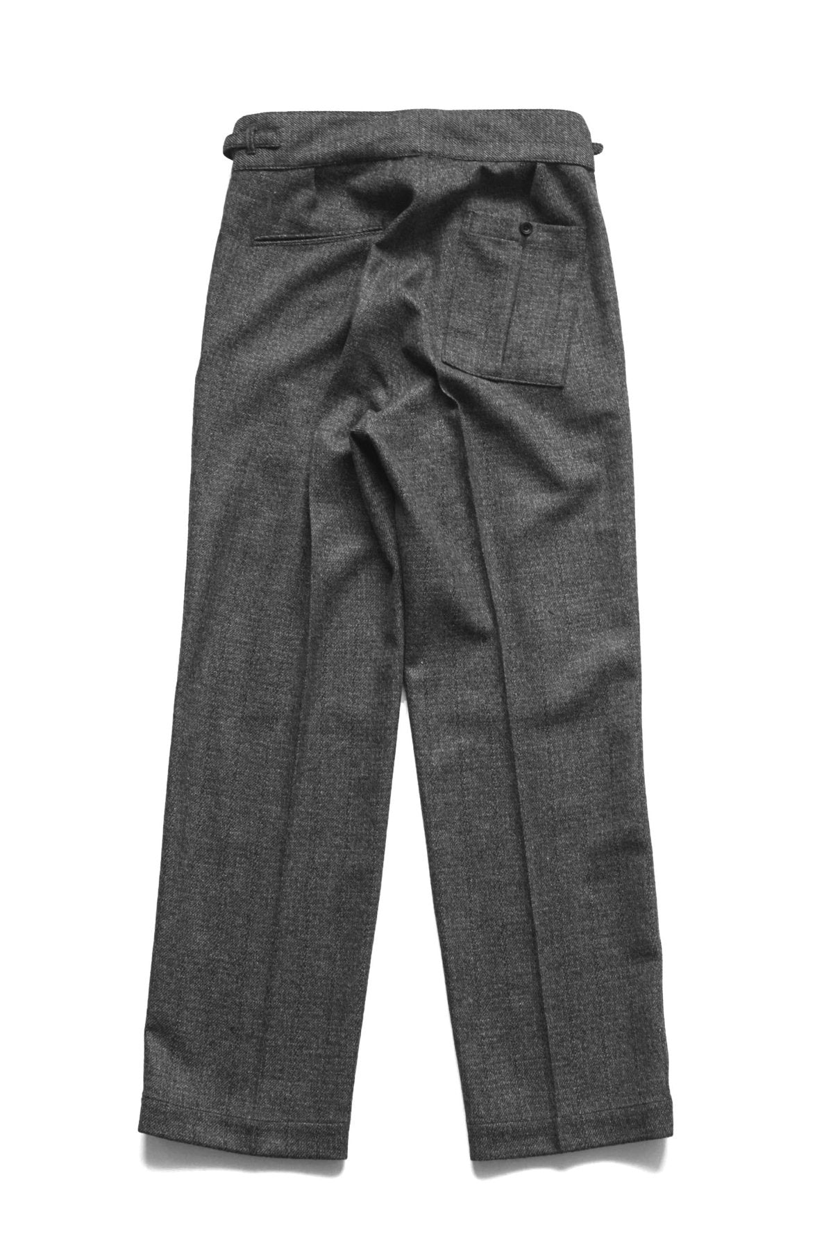 スタンダードアイテムとなるグルカトラウザー。ミッドセンチュリー期のブリティッシュミリタリーのアーカイブデザインからのインスピレーション。ゆったりとしたヒップ周りに深い股上、膝での絞りを控えたテーパードラインは、 O脚の多い日本人には特に最適なパターン。履く人の体系を選ばないトラウザー。今回採用のファブリックは、スリーピースと同素材のカシミアミックスのオリジナルツイード。 違う番手の糸を撚り合わせたオリジナルの糸は、凹凸に立体感が特徴となります。 また柄として見えてくる部分には綿糸の杢糸を用いて、素材のコントラストとクラシカルなイメージを作り上げた。1900~20年代頃のアーカイブピースからテキスタイルを抽出し、アップデートしたシャドウプレイドとシャドウストライプはどちらも惜しみなく時間かけられたトップクオリティ。