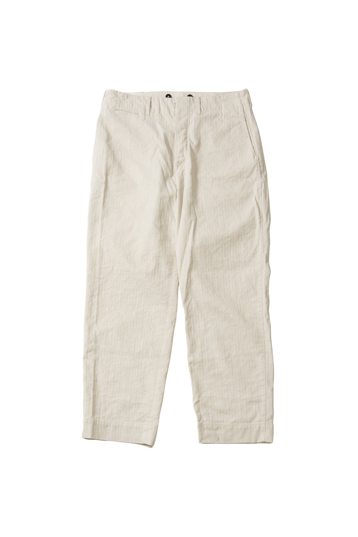 パデッドポケットがレイアウトされた、バックスタイルが特徴的なトラウザーです。ハンティングウェアのアーカイブからのインスピレーションによりデザインされています。極限まで打ち込んで硬くしたコットンリネンのランダムヘリンボンはどっしりした質感を持っており、履き込んだ際の経年変化が楽しみなマテリアルとなっています。