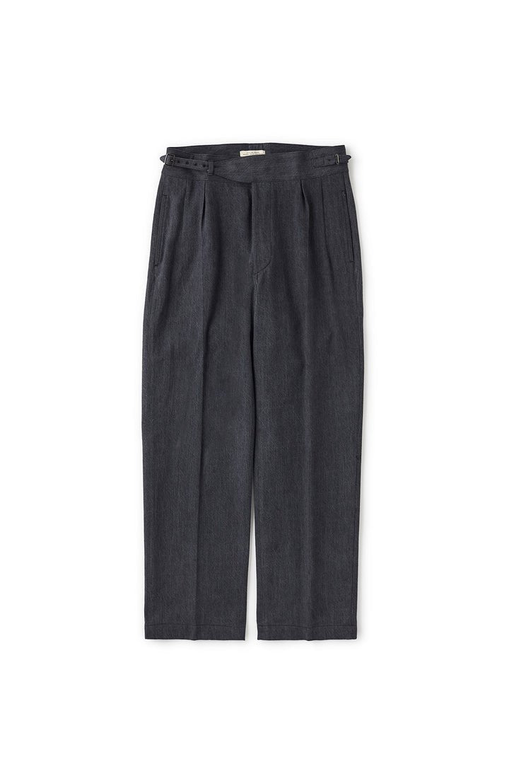 スタンダードアイテムとなるグルカトラウザー。ミッドセンチュリー期、ブリティッシュミリタリーのアーカイブデザインからのインスピレーションです。ゆったりとしたヒップ周りに深い股上、膝での絞りを控えたテーパードラインは、 O脚の多い日本人には特に最適なパターンとなっています。履く人の体系を選ばないラインのトラウザーです。今シーズンのマテリアルは生地の段階で味だしトリートメントを施したカラーデニム。程よく褪色したデニムの表情がノスタルジックな印象です。