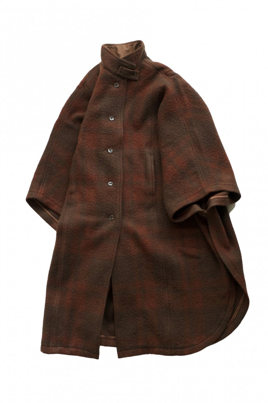 英国羊毛の糸を用い、オリジナルで企画した肉感のある縮絨メルトンは、仕上げでピンプル加工を施して軽く毛玉を作っているので、 クラシックなプレイドパターンはシャドウ感が増し、より雰囲気のある表情に。 クラシックなルックスのマントですが、サイドにパネルを付け、脇の保温性も確立させています。